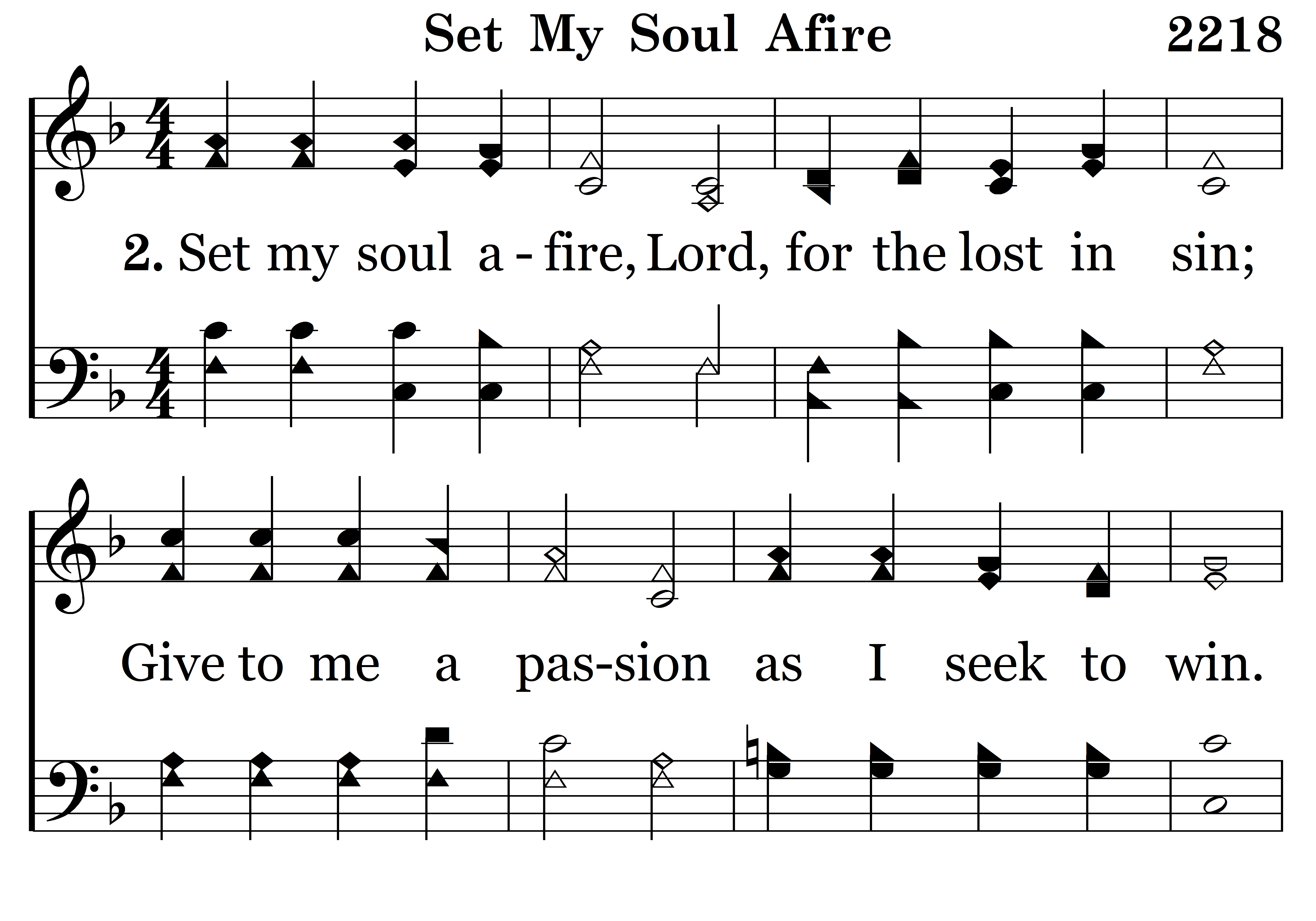 Set my soul afire, Lord, for the lost in sin; Give to me a passion as I seek to win. Help me not to falter, never let me fail; Fill me with Thy Spirit, let Thy will prevail.