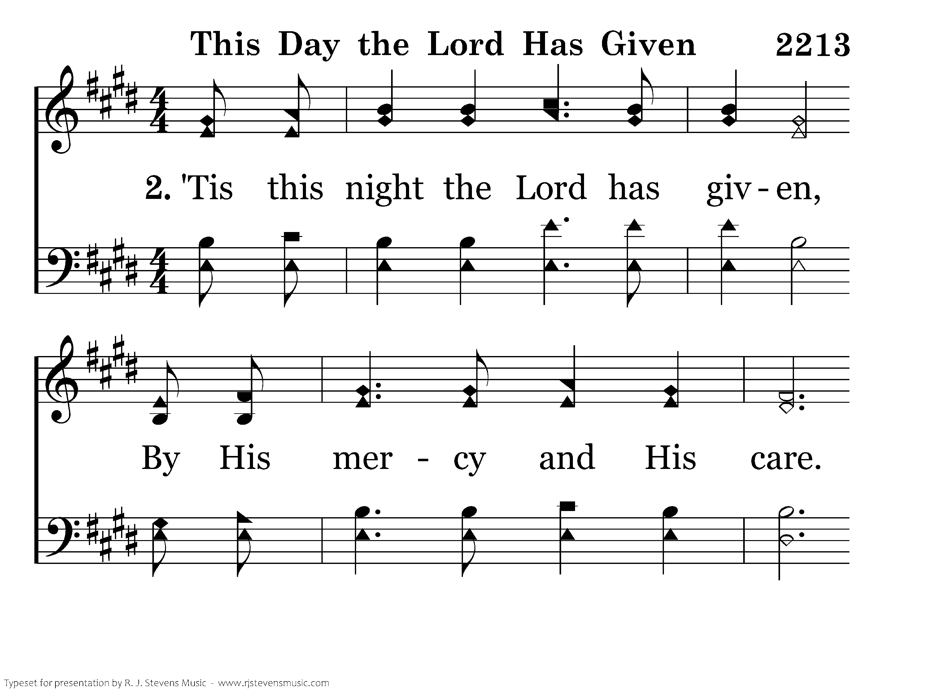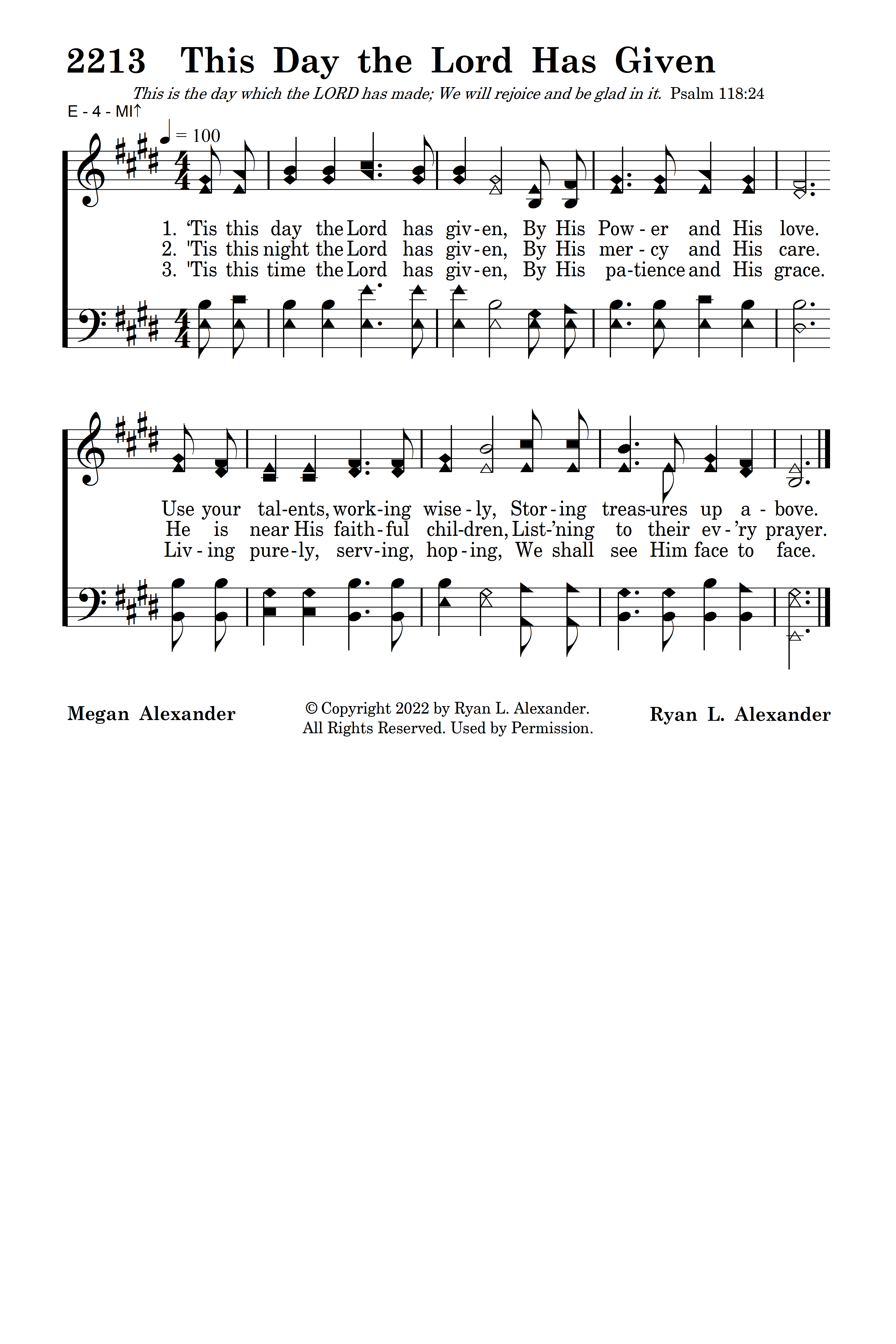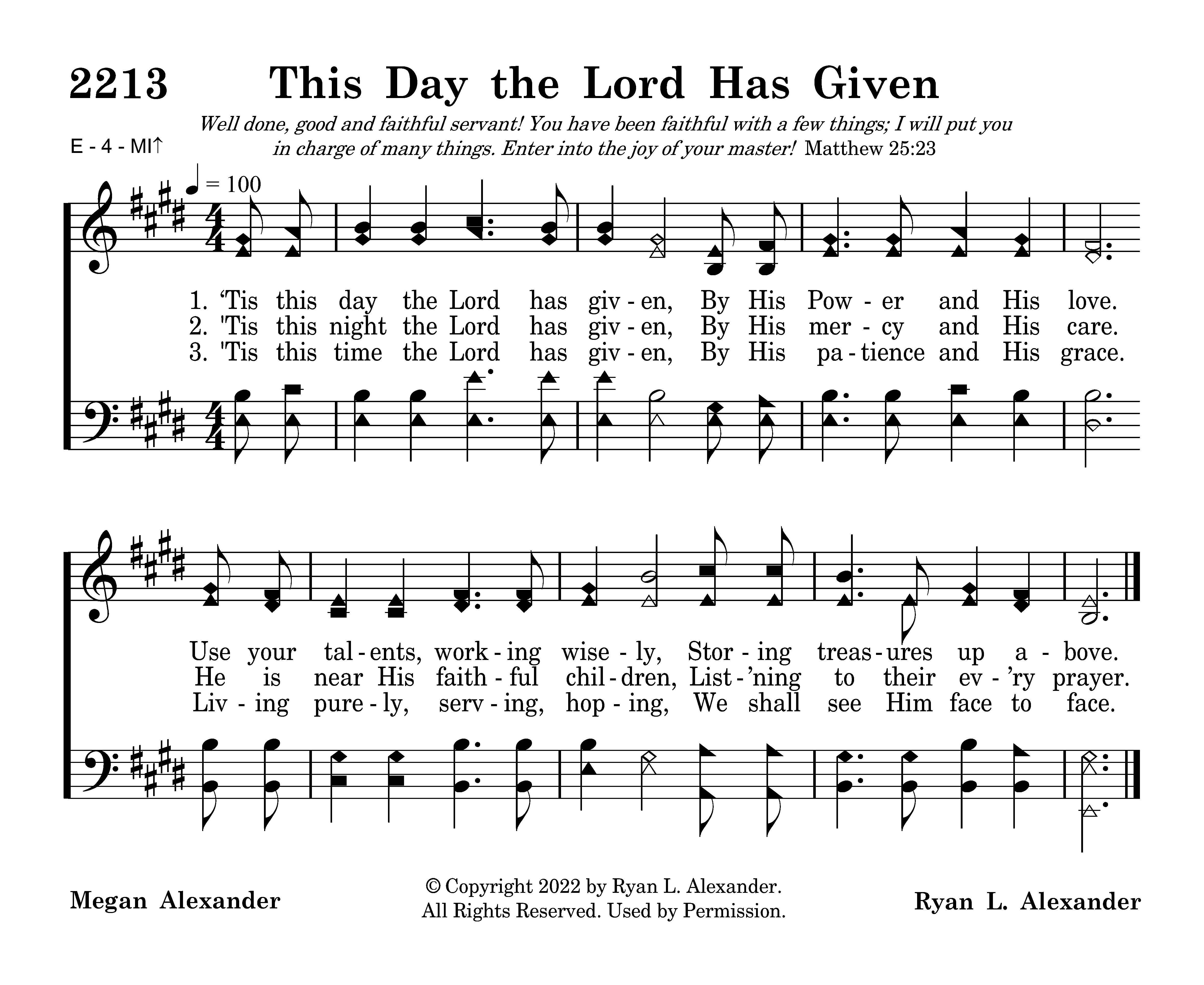 ‘Tis this day the Lord has given, By His power and His love. Use your talents, working wisely, Storing treasures up above.