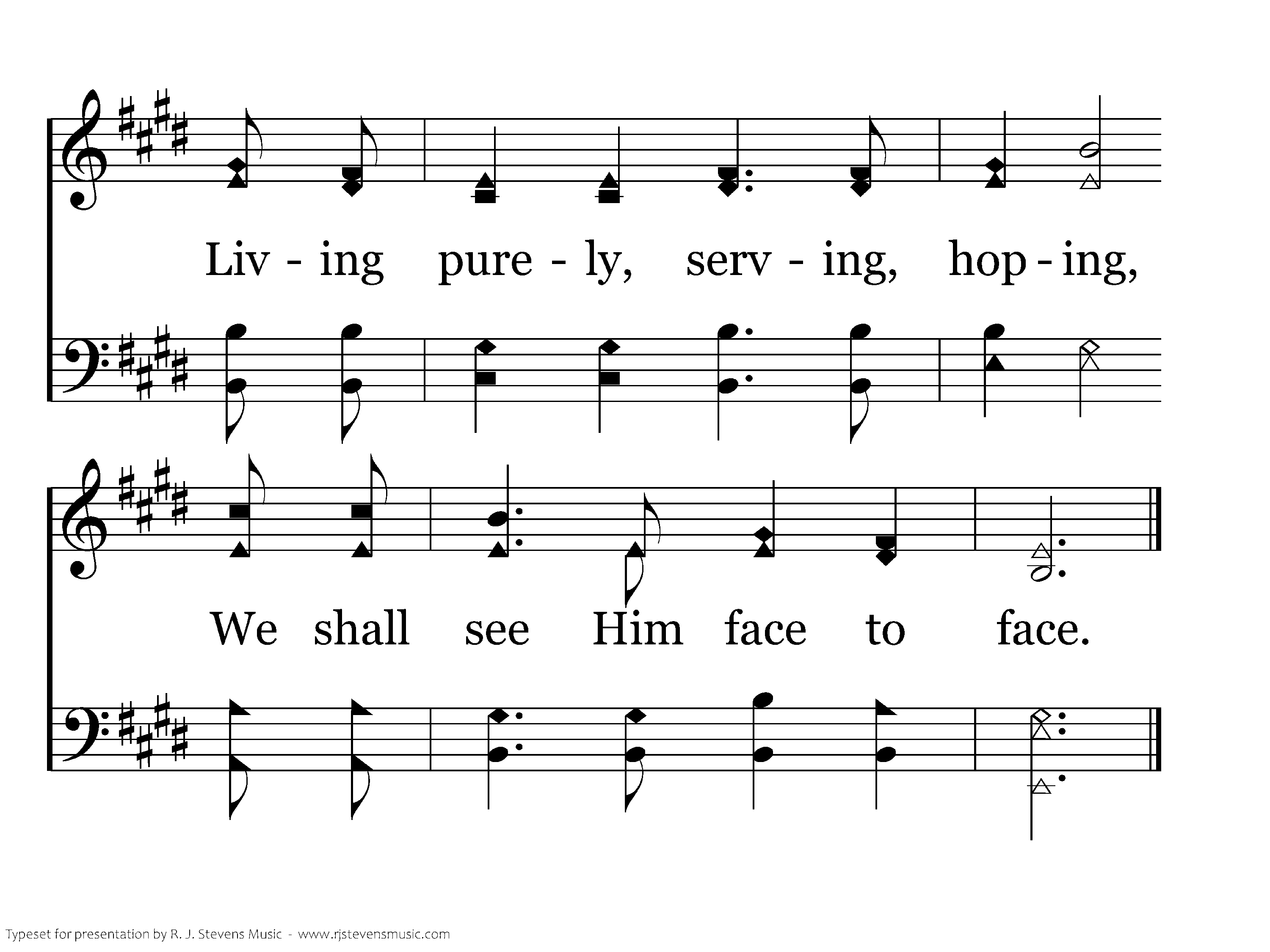 'Tis this time the Lord has given, By His patience and His grace. Living purely, serving, hoping, We shall see Him face to face.