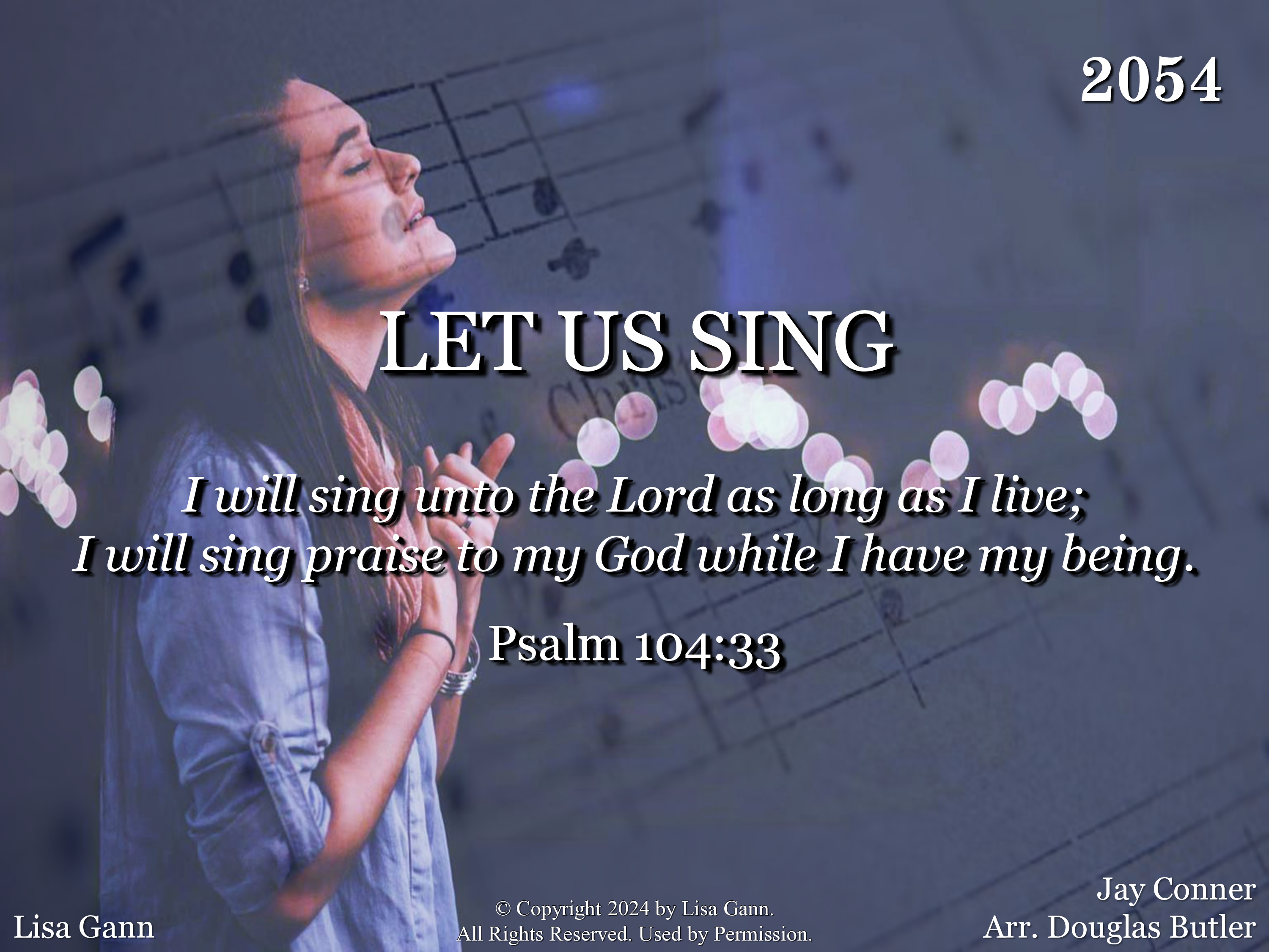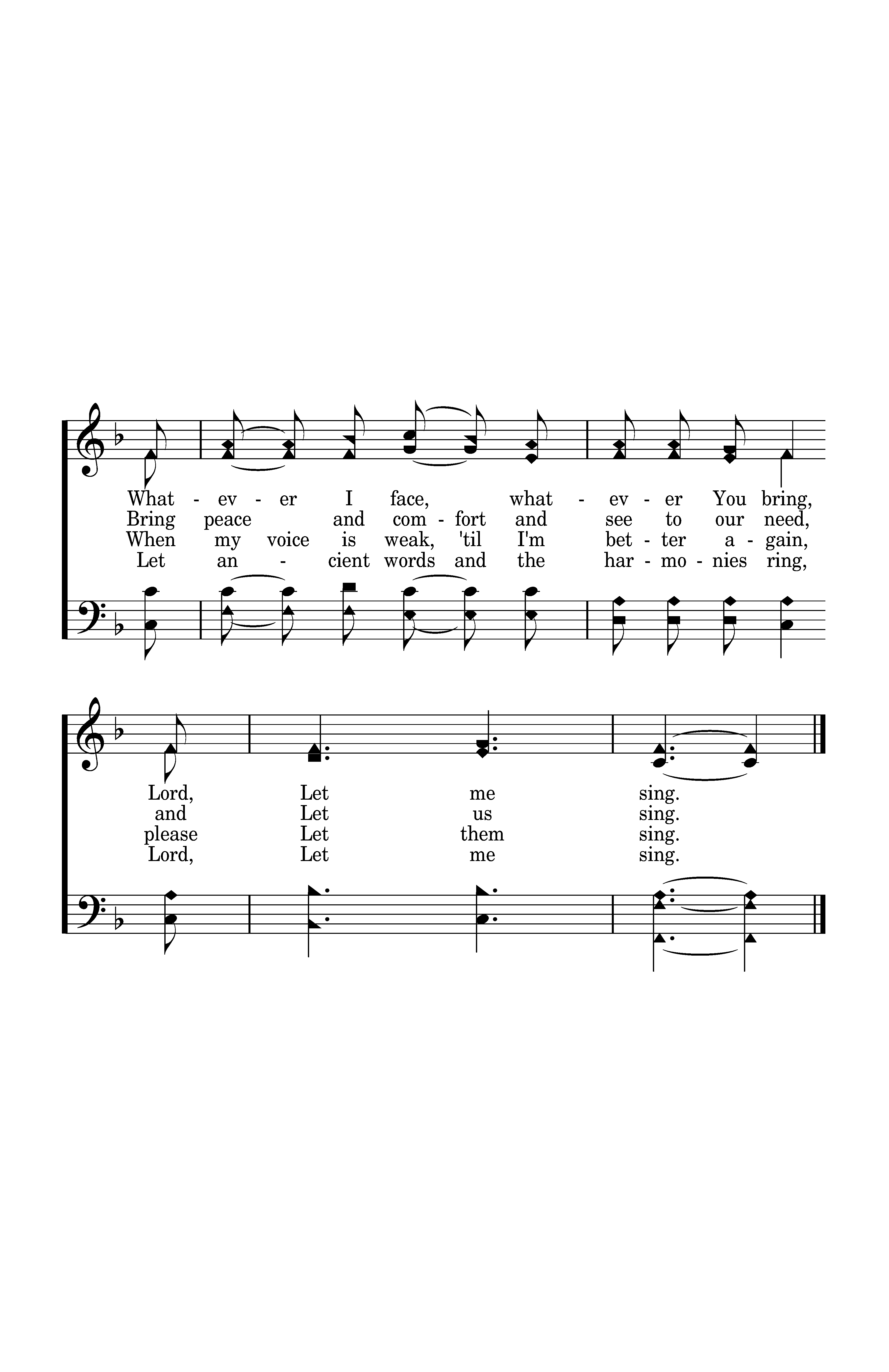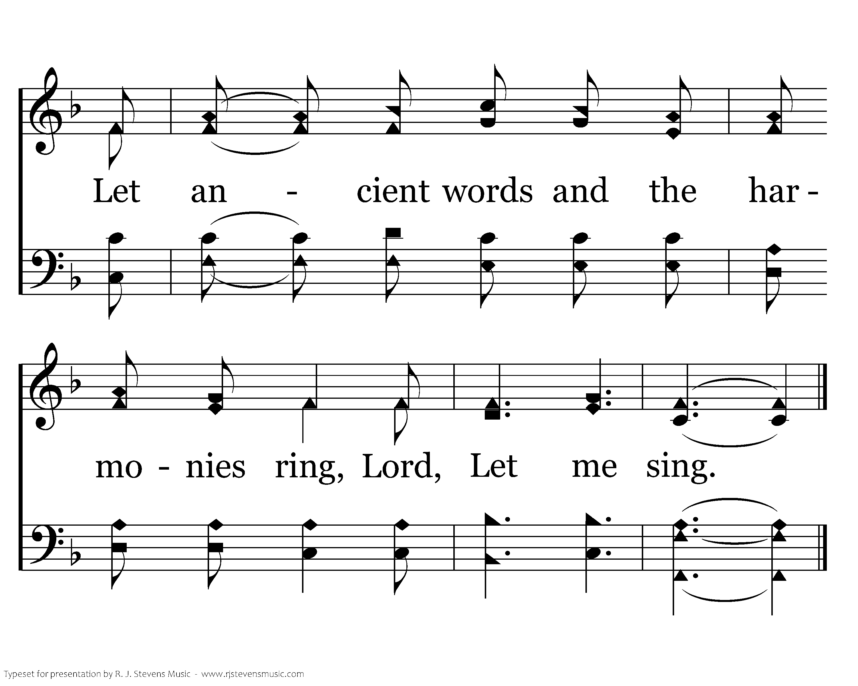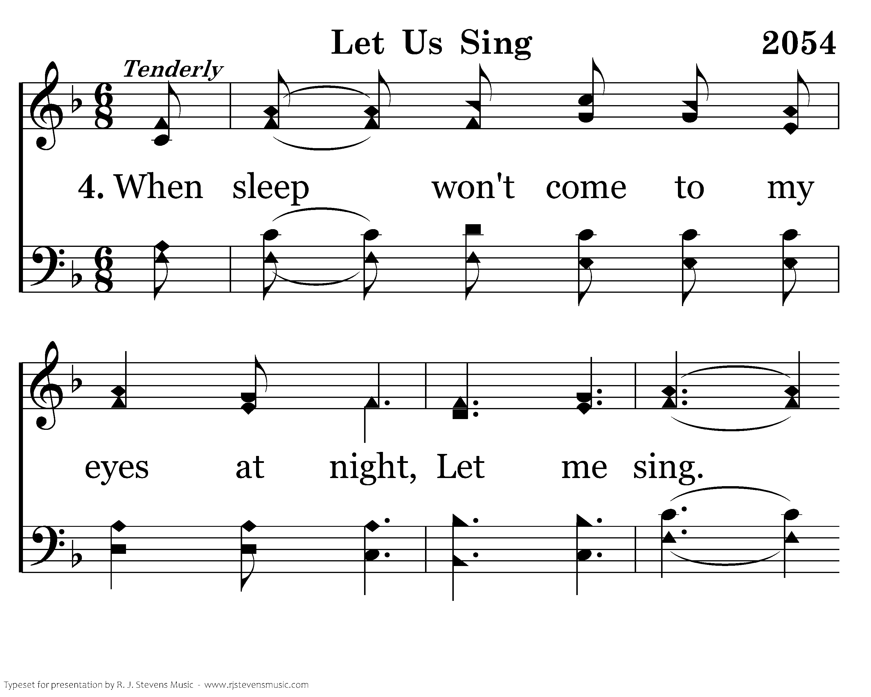 When sleep won't come to my eyes at night, Let me sing. And cares of the world press on ev'ry side, Let me sing. Bring calmness and strength, Lord, to do Your will, A firm resolve just to follow You still, Let ancient words and the harmonies ring, Lord, Let me sing.