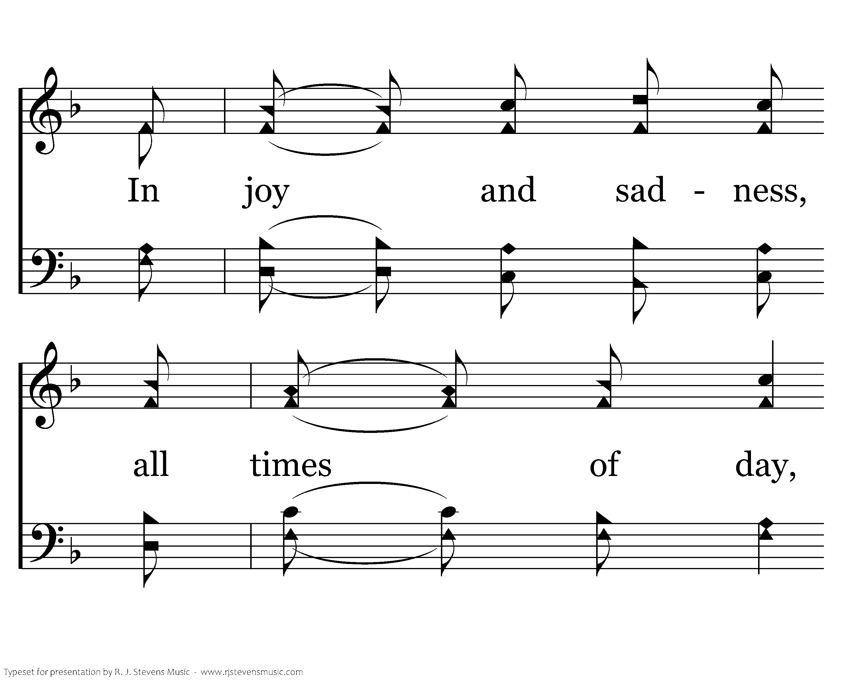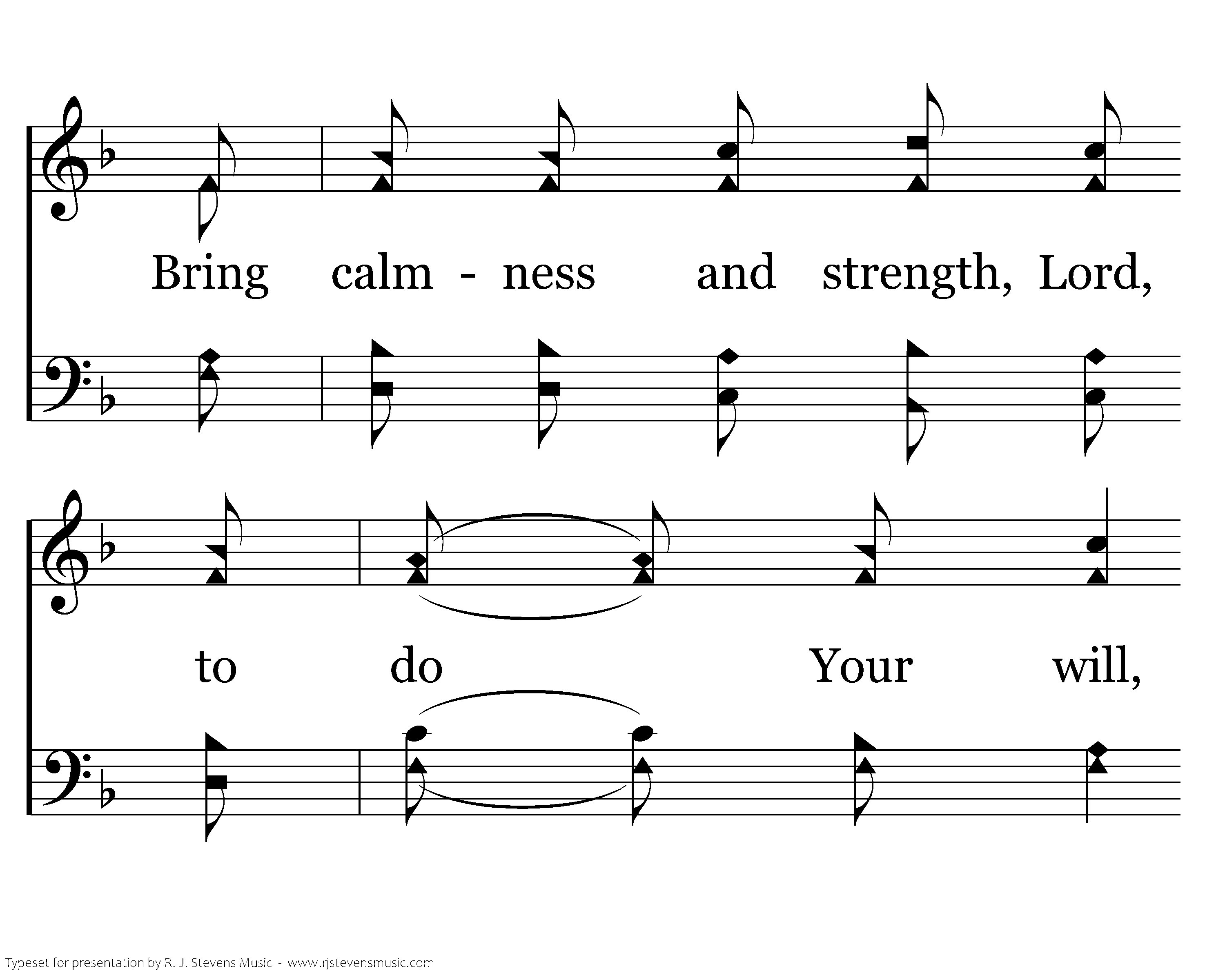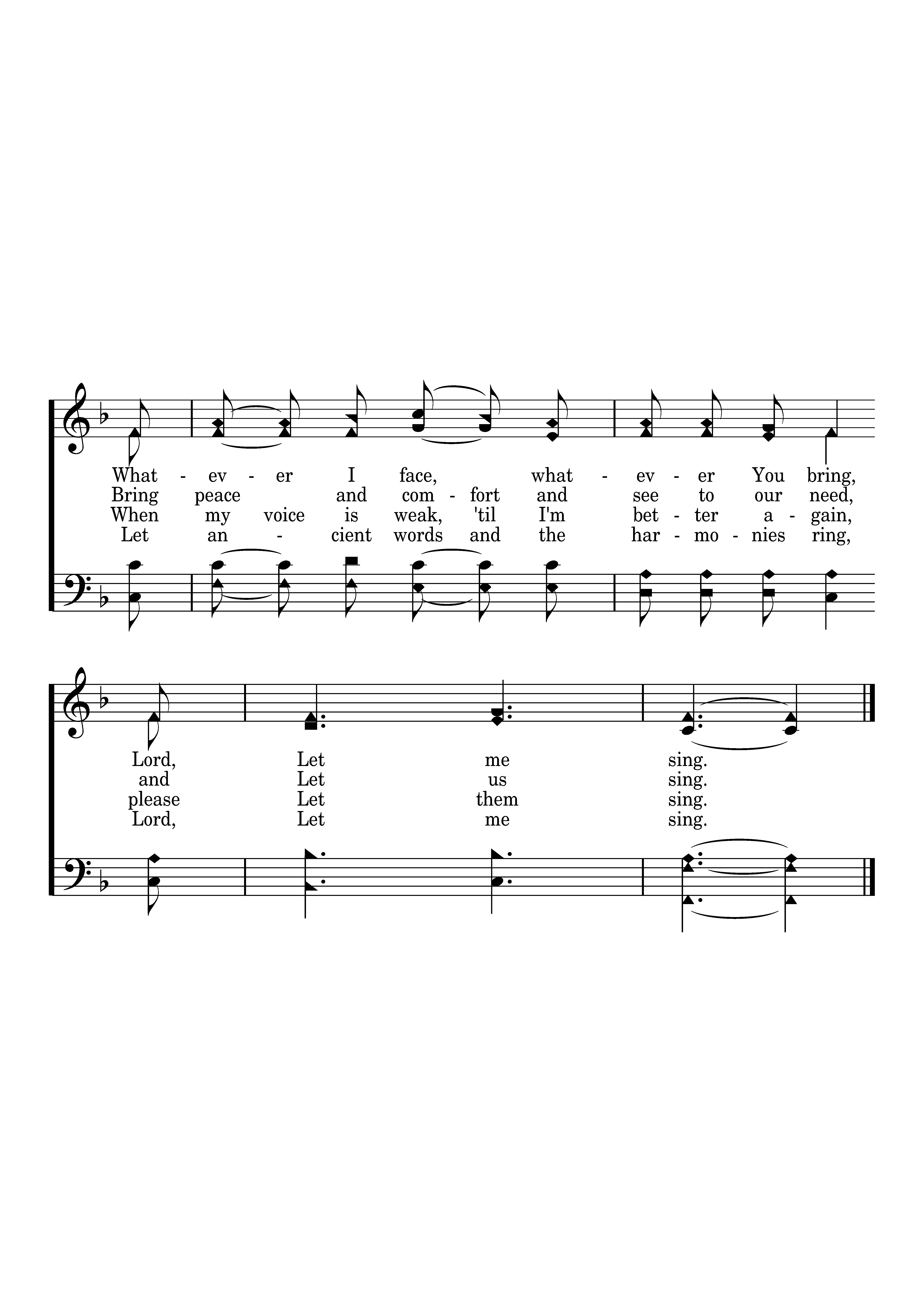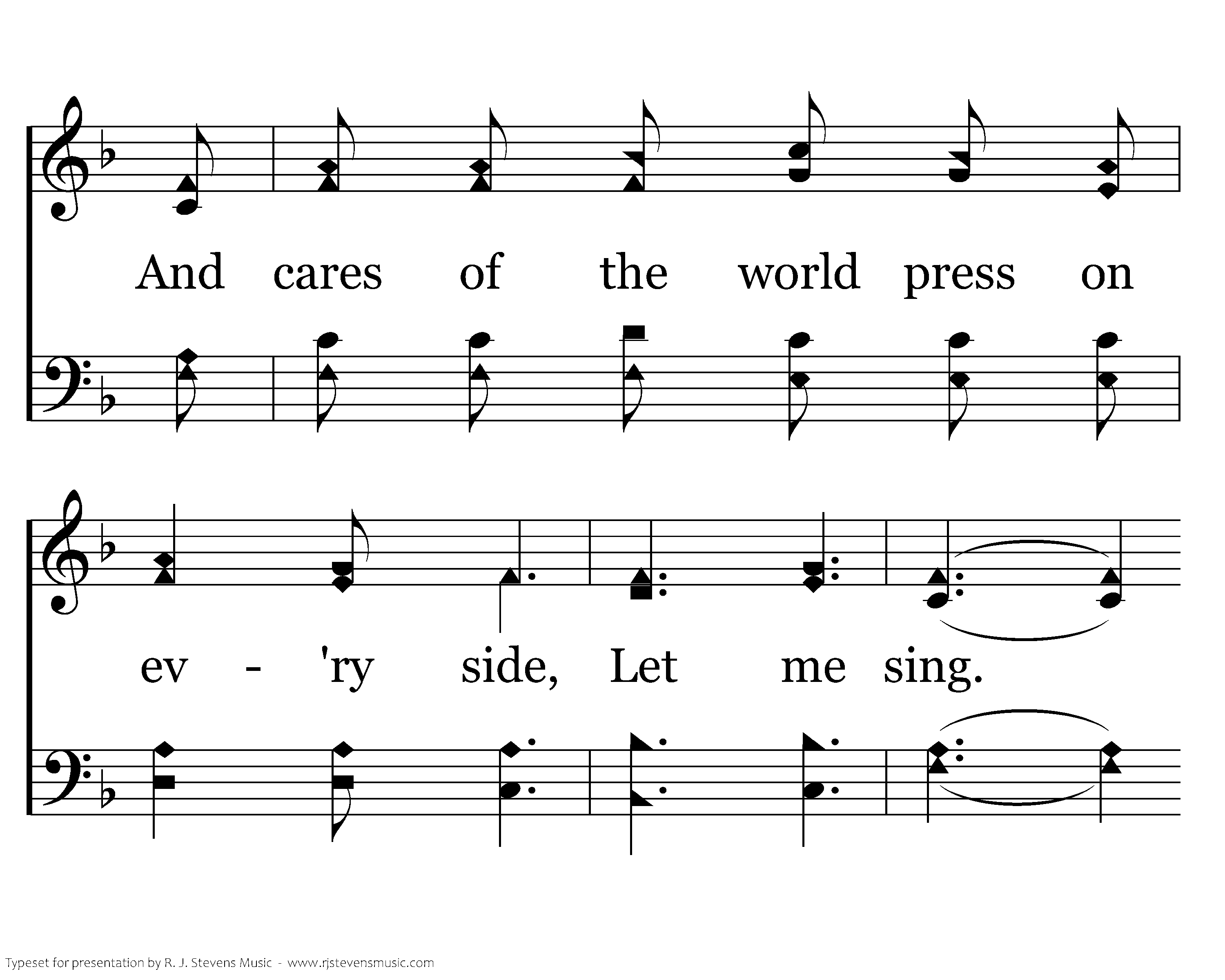 When sleep won't come to my eyes at night, Let me sing. And cares of the world press on ev'ry side, Let me sing. Bring calmness and strength, Lord, to do Your will, A firm resolve just to follow You still, Let ancient words and the harmonies ring, Lord, Let me sing.