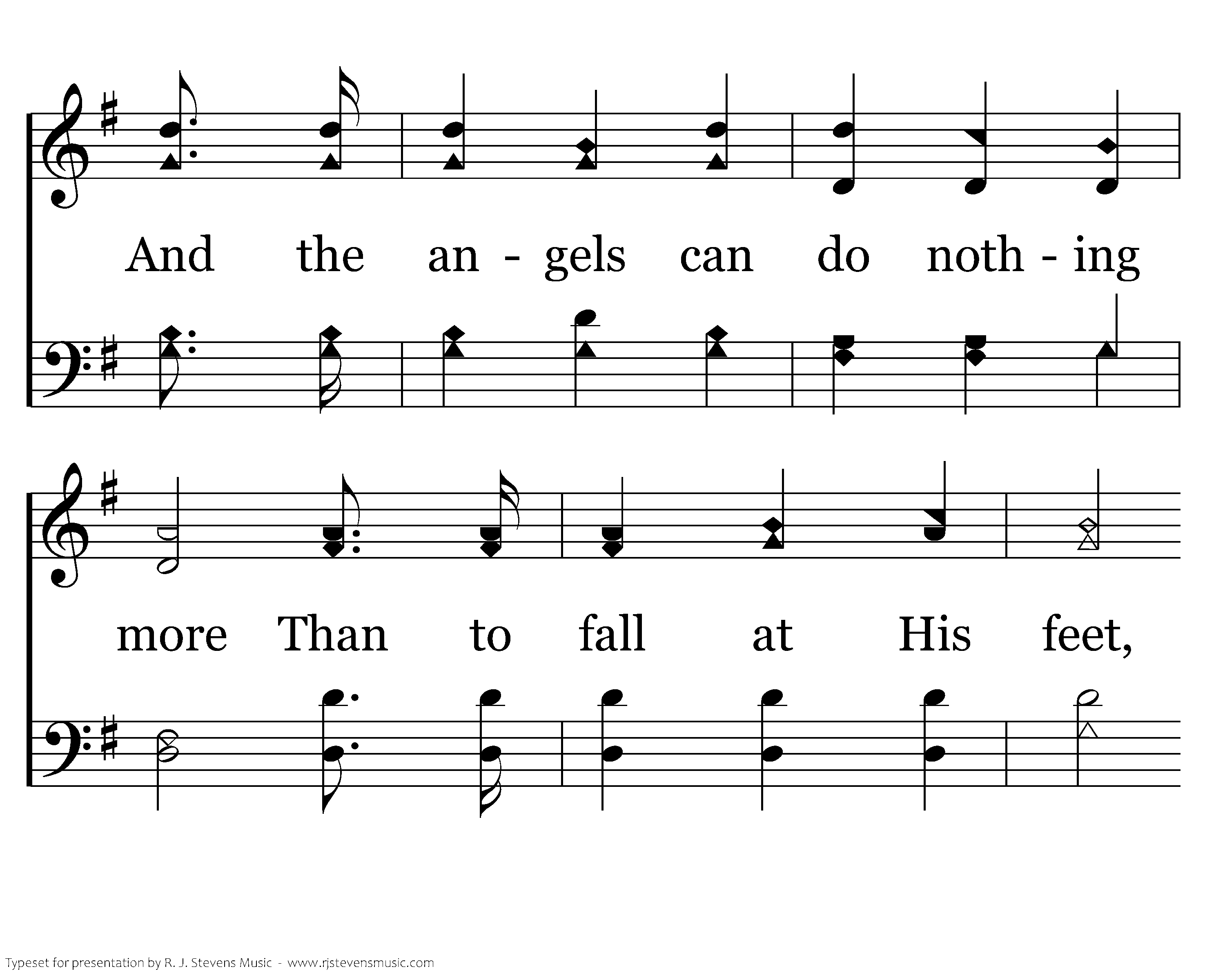 'Tis a heaven below my Redeemer to know; And the angels can do nothing more Than to fall at His feet, and the story repeat, And the Lover of sinners adore, And the Lover of sinners adore.
