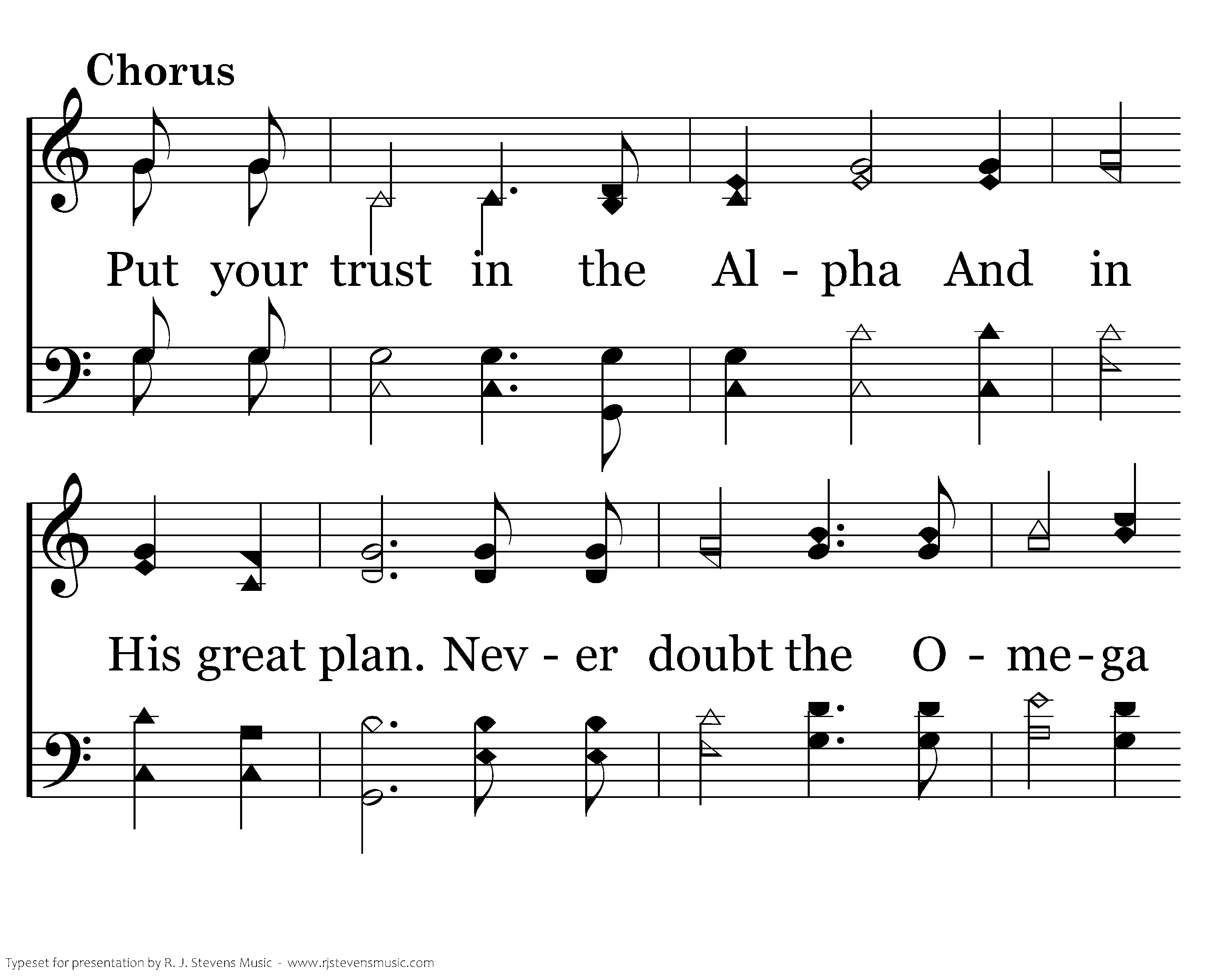 Put your trust in the Alpha And in His great plan. Never doubt the Omega For His pow'r, His power will stand.