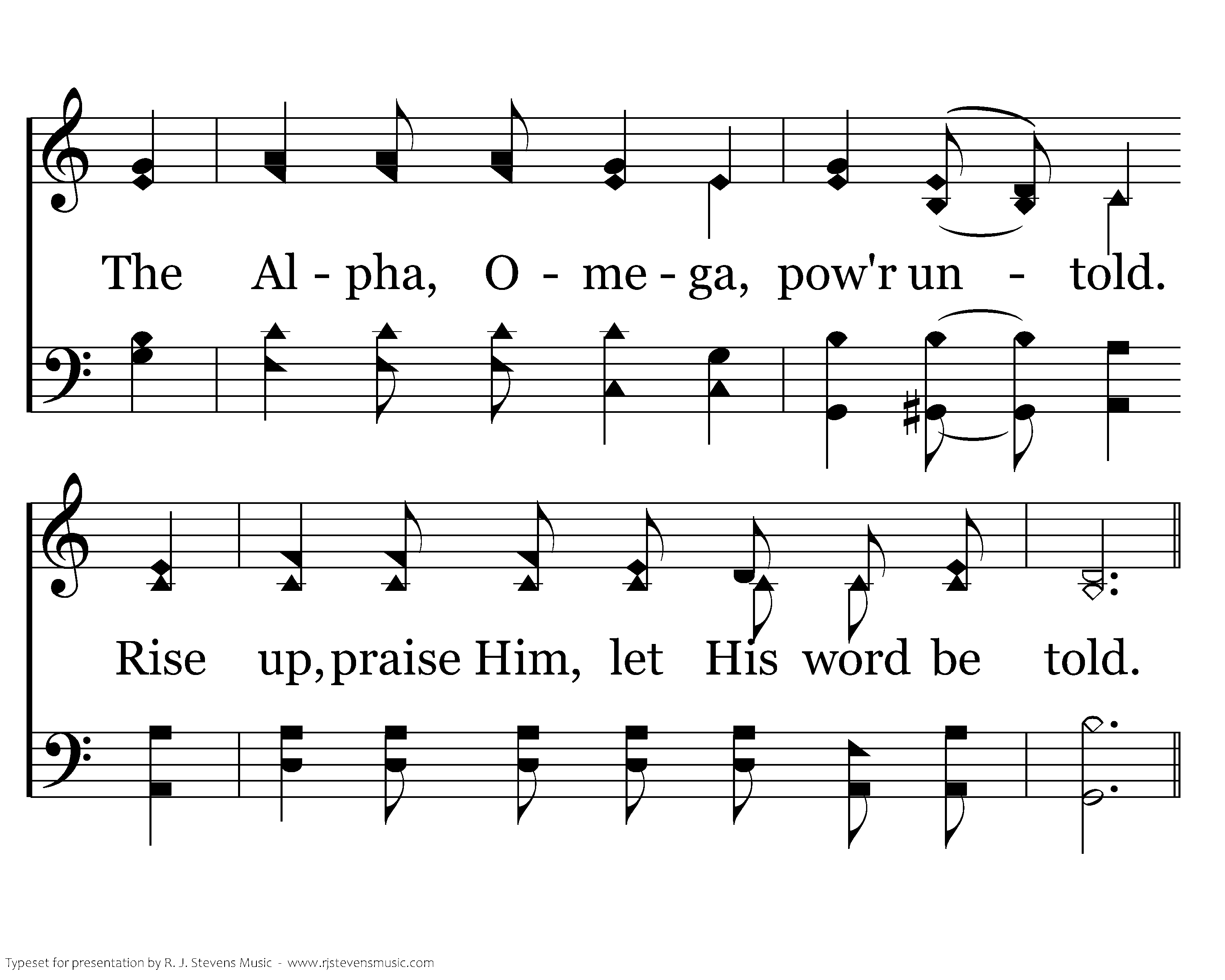 Now, behold, one day He is coming soon, In dawn’s early light or afternoon The Alpha, Omega, pow'r untold. Rise up, praise Him, let His word be told.