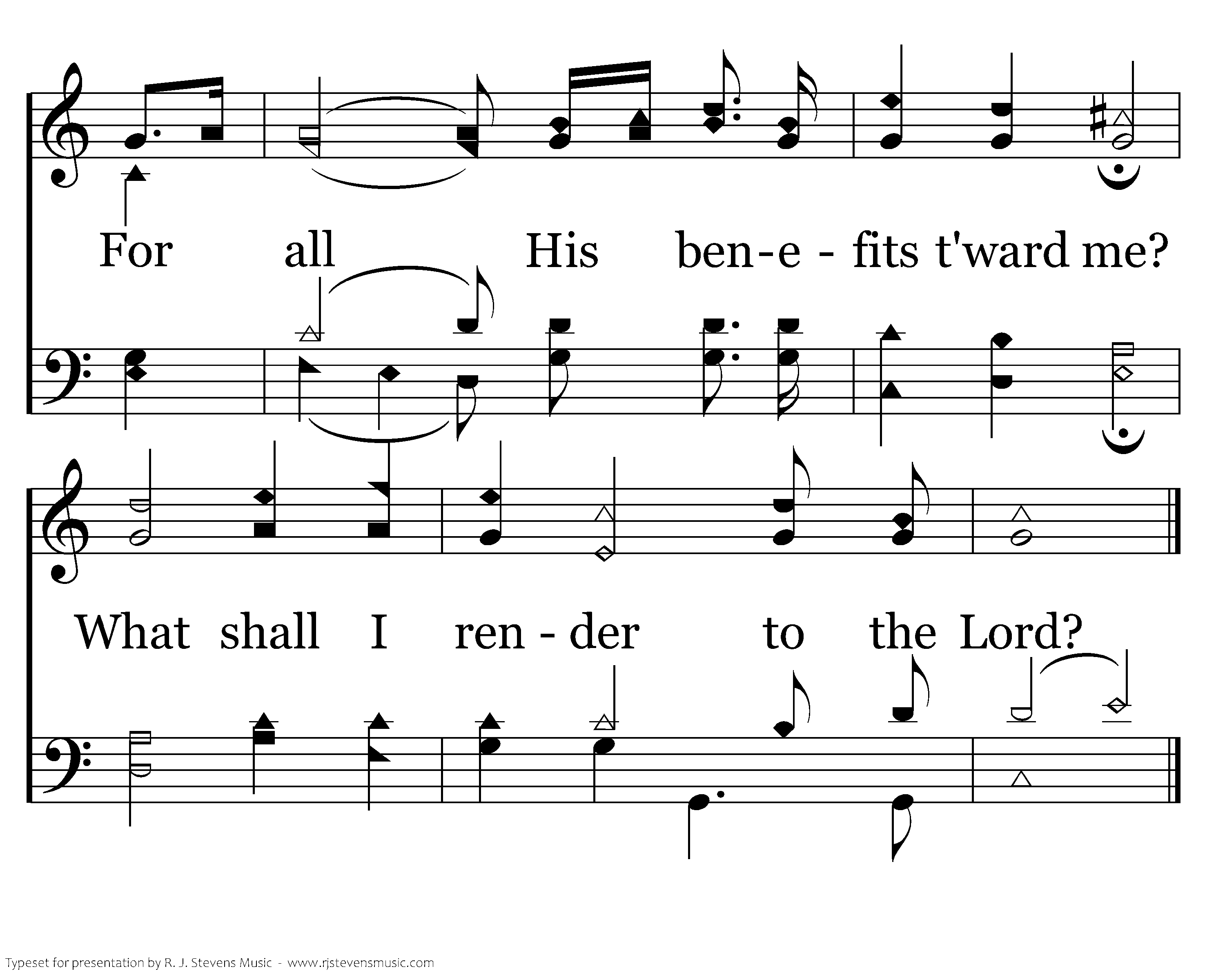 What shall I render to the Lord? Oh, what shall I render to the Lord? For all His benefits; For all His benefits; For all His benefits t'ward me? What shall I render to the Lord?