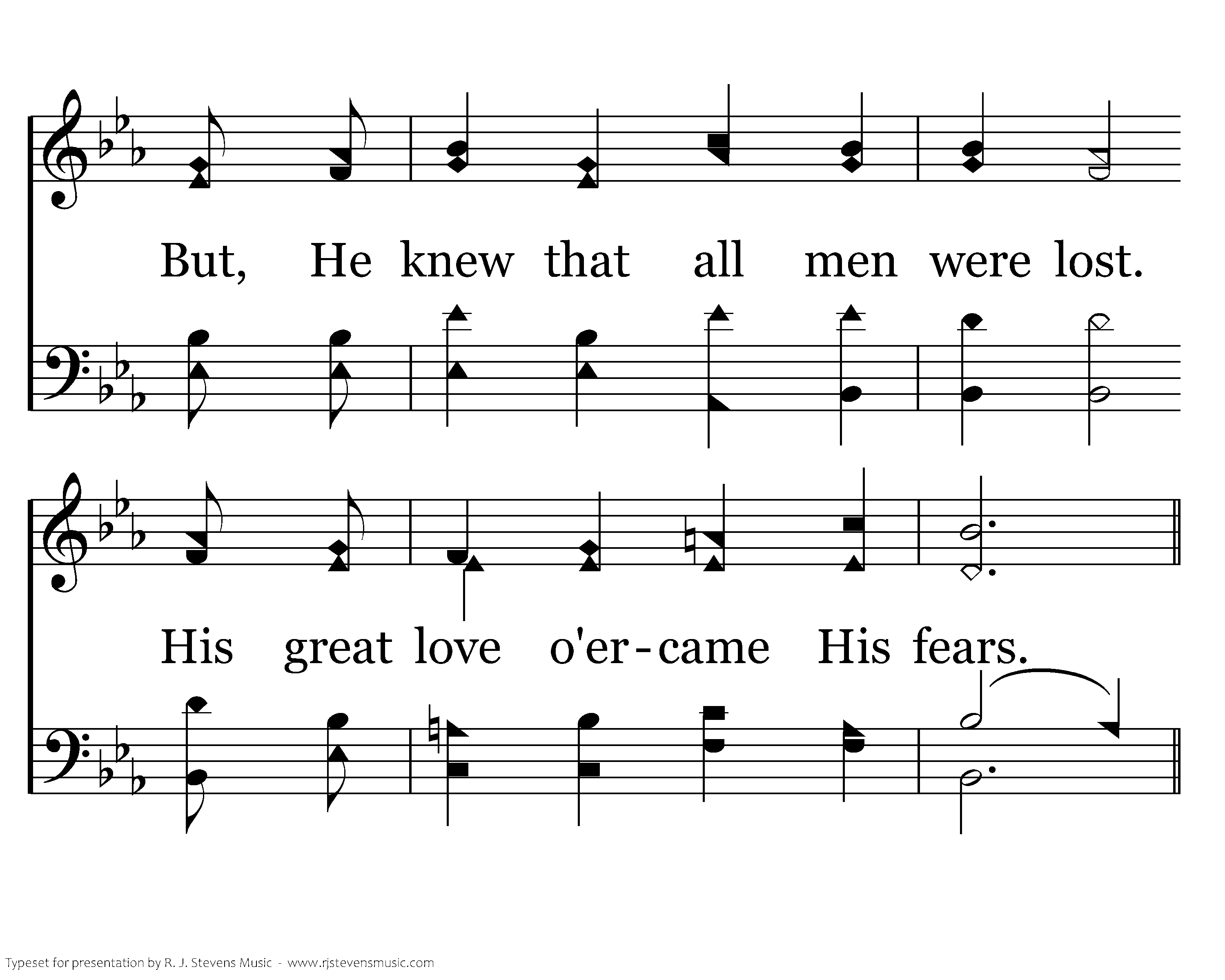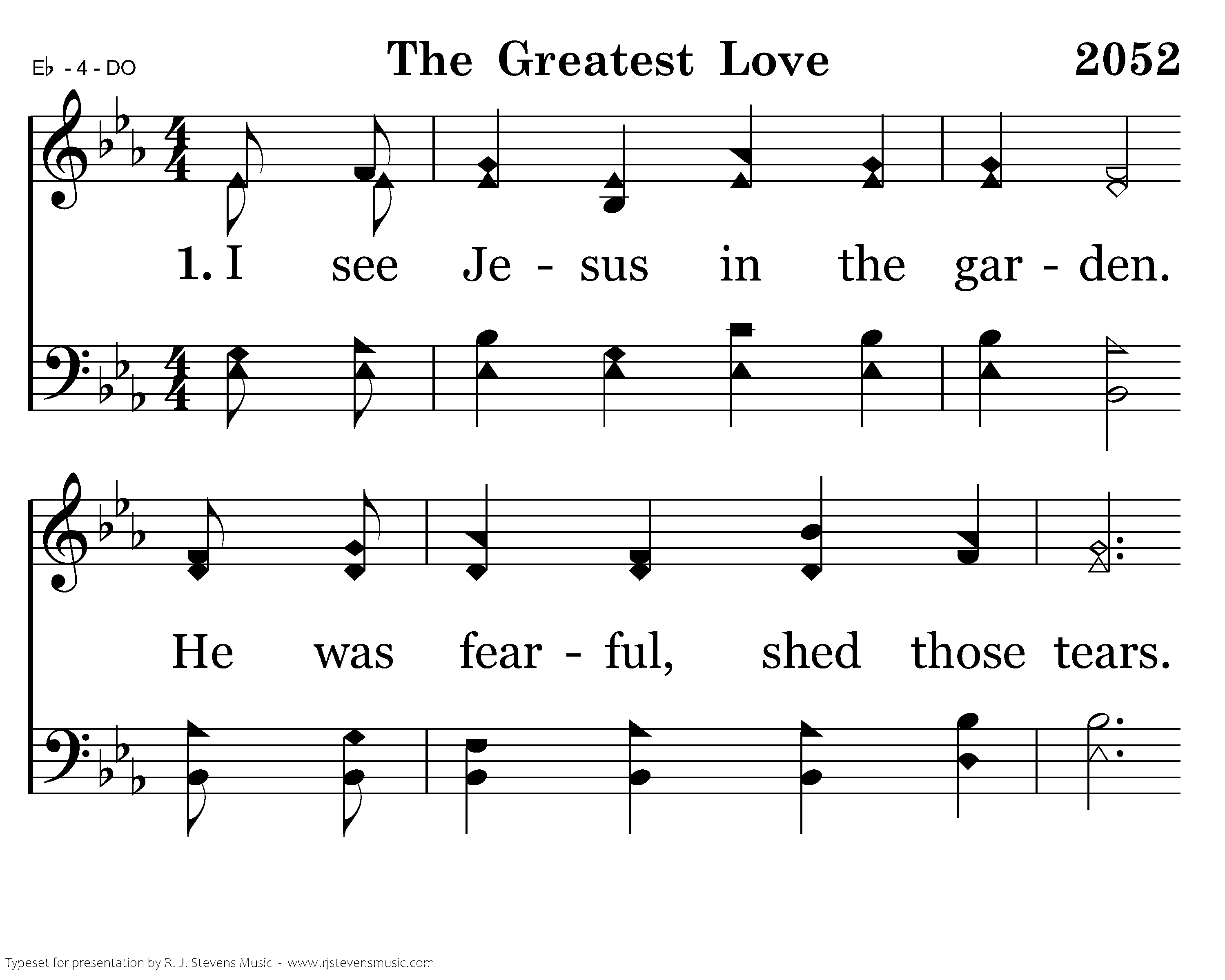 I see Jesus in the garden. He was fearful, shed those tears. But, He knew that all men were lost. His great love o'ercame His fears.