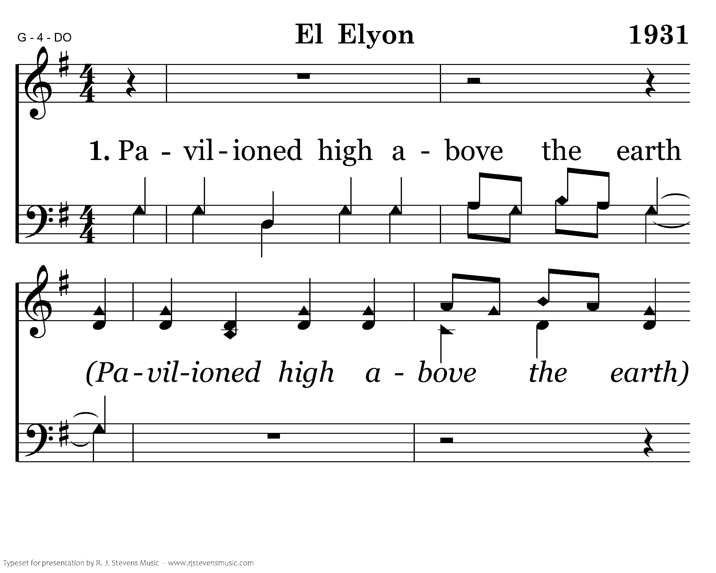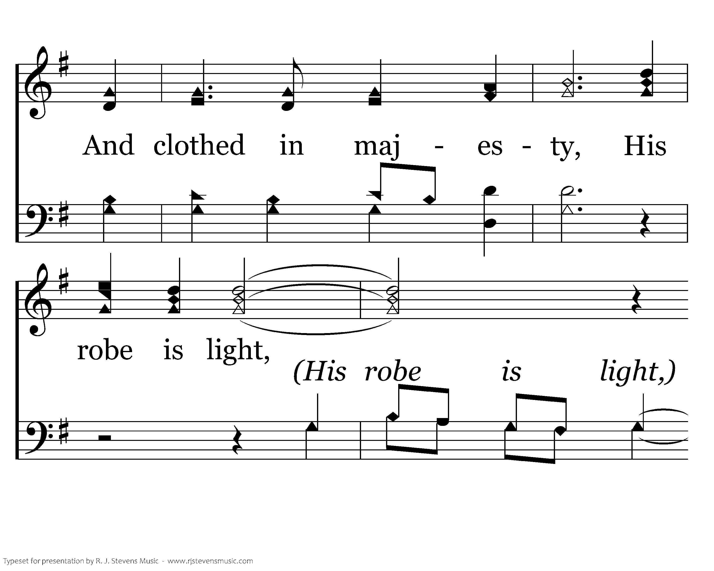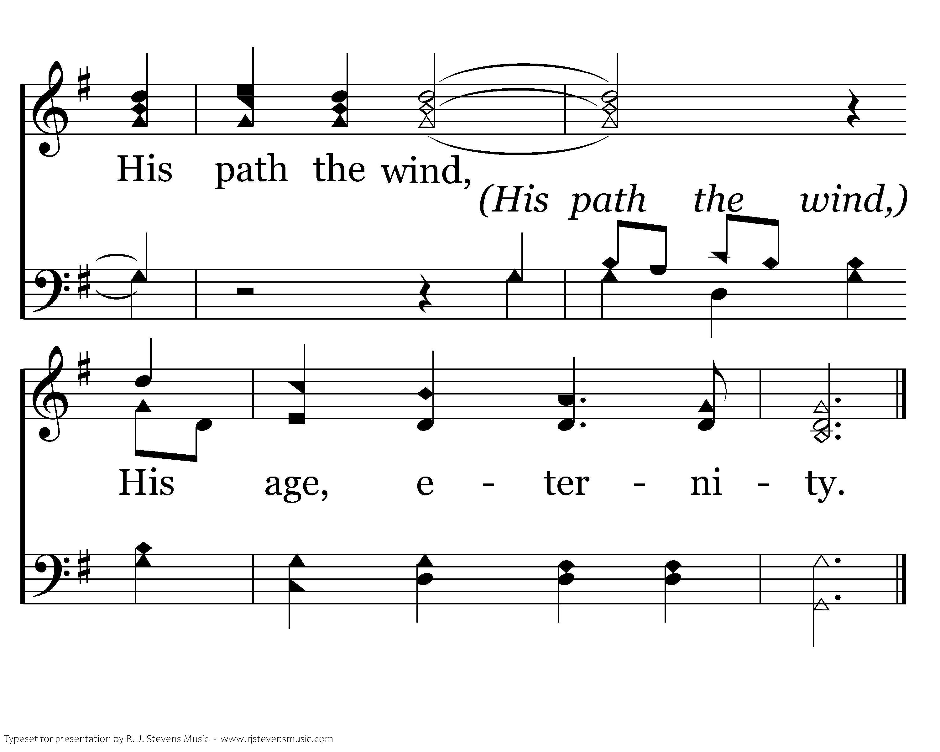 Pavilioned high above the earth (Pavilioned high above the earth) And clothed in majesty, His robe is light, (His robe is light,) His path the wind, (His path the wind,) His age, eternity.