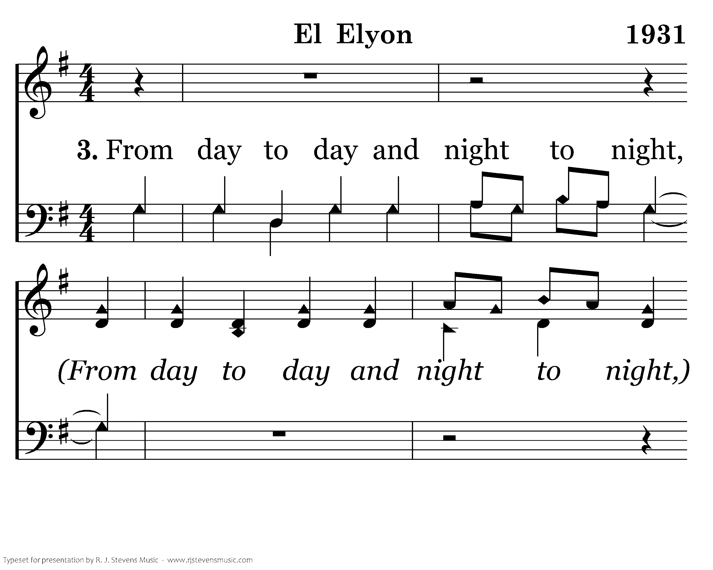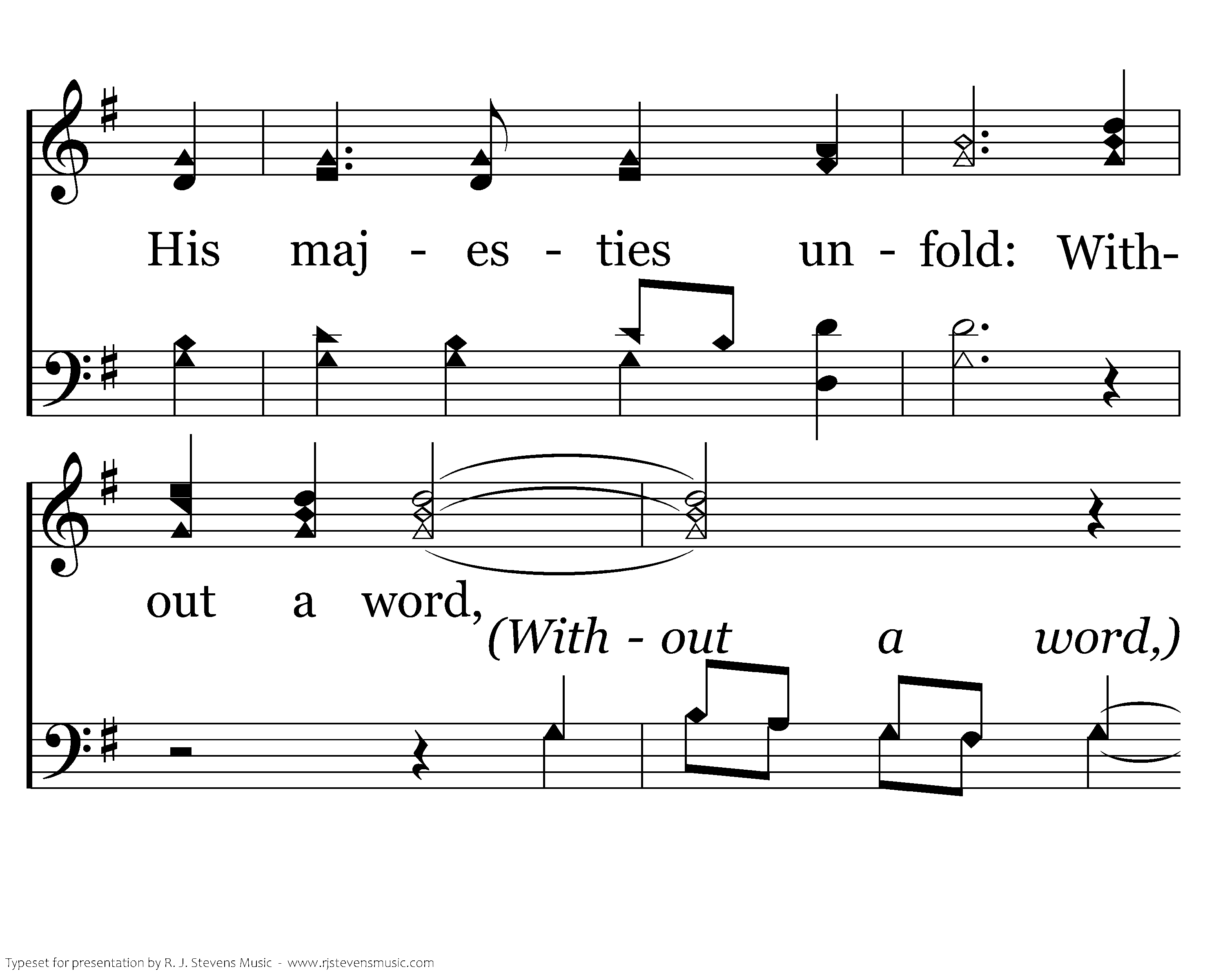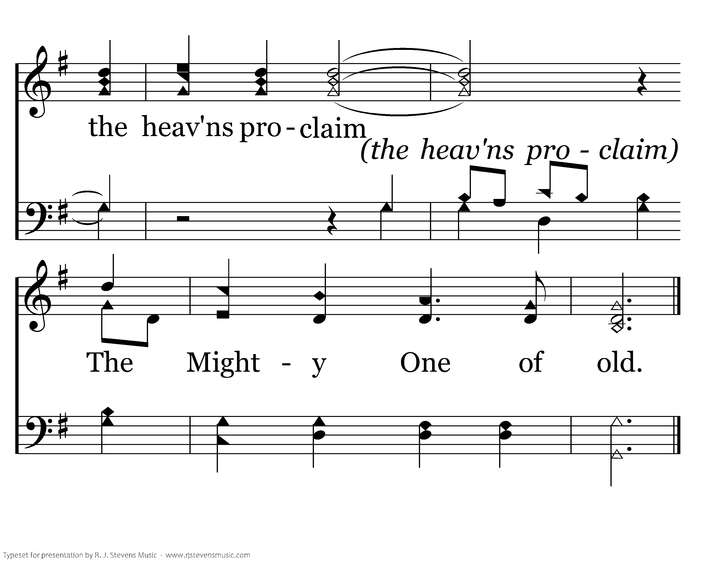 From day to day and night to night, (From day to day and night to night,) His majesties unfold: Without a word, (Without a word,) the heav'ns proclaim (the heav'ns proclaim) The Mighty One of old.
