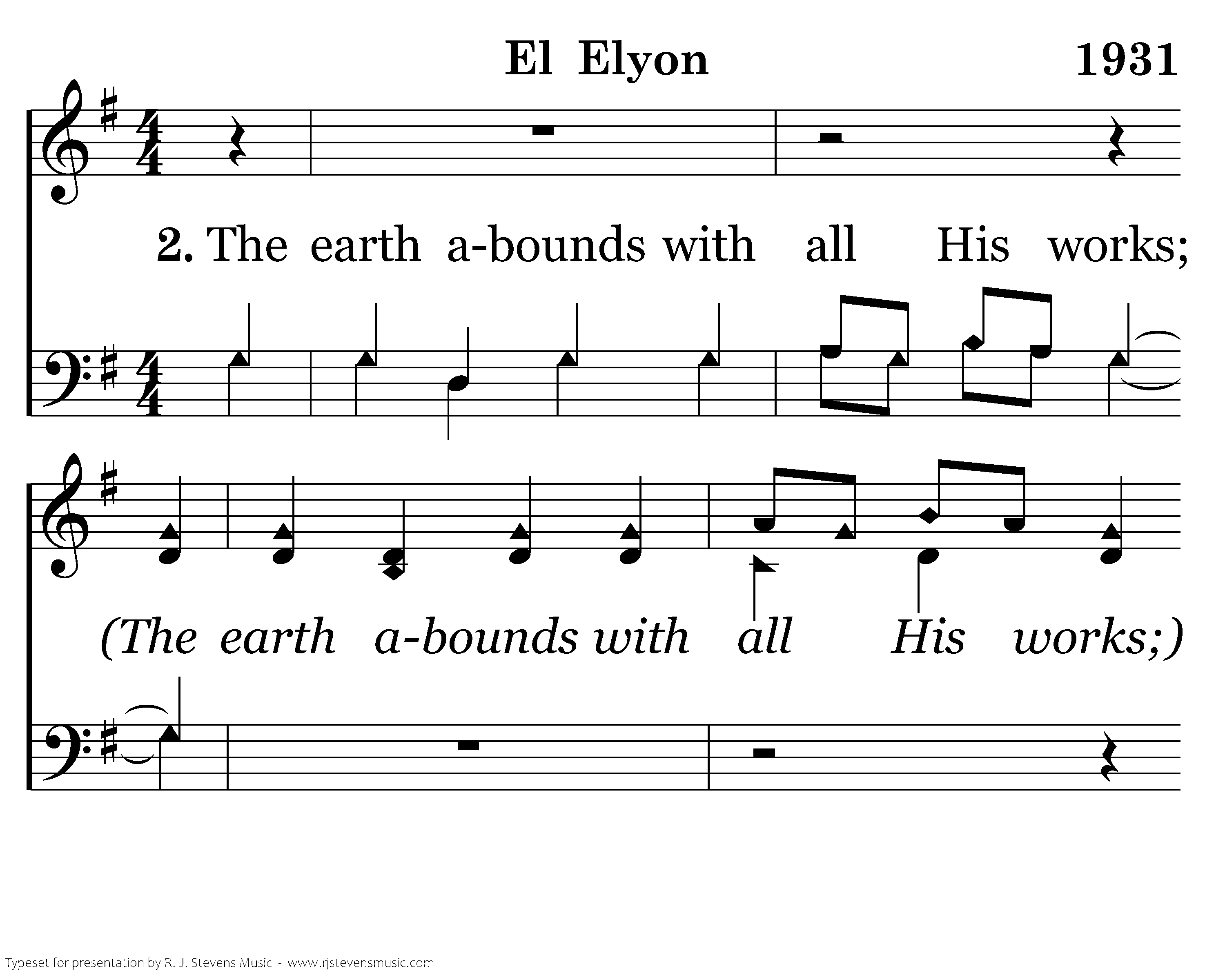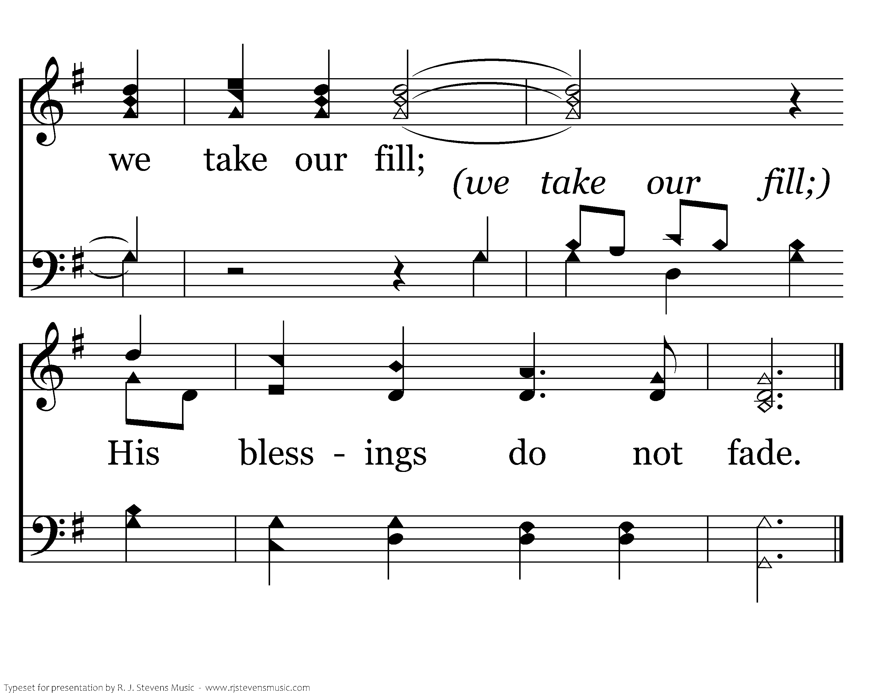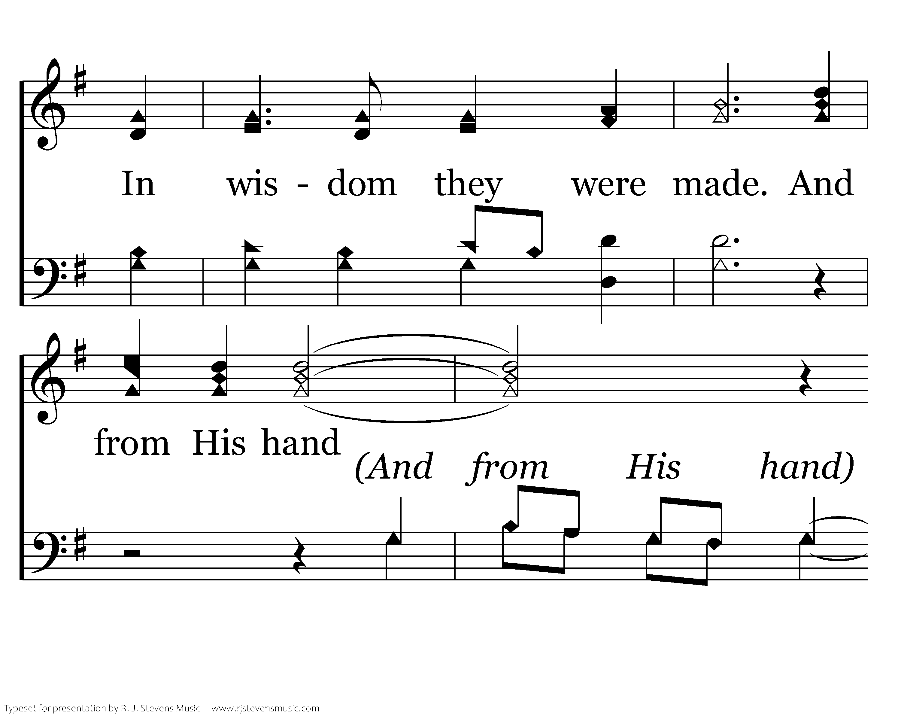 The earth abounds with all His works; (The earth abounds with all His works;) In wisdom they were made. And from His hand we take our fill; His blessings do not fade. (And from His hand) (we take our fill;)