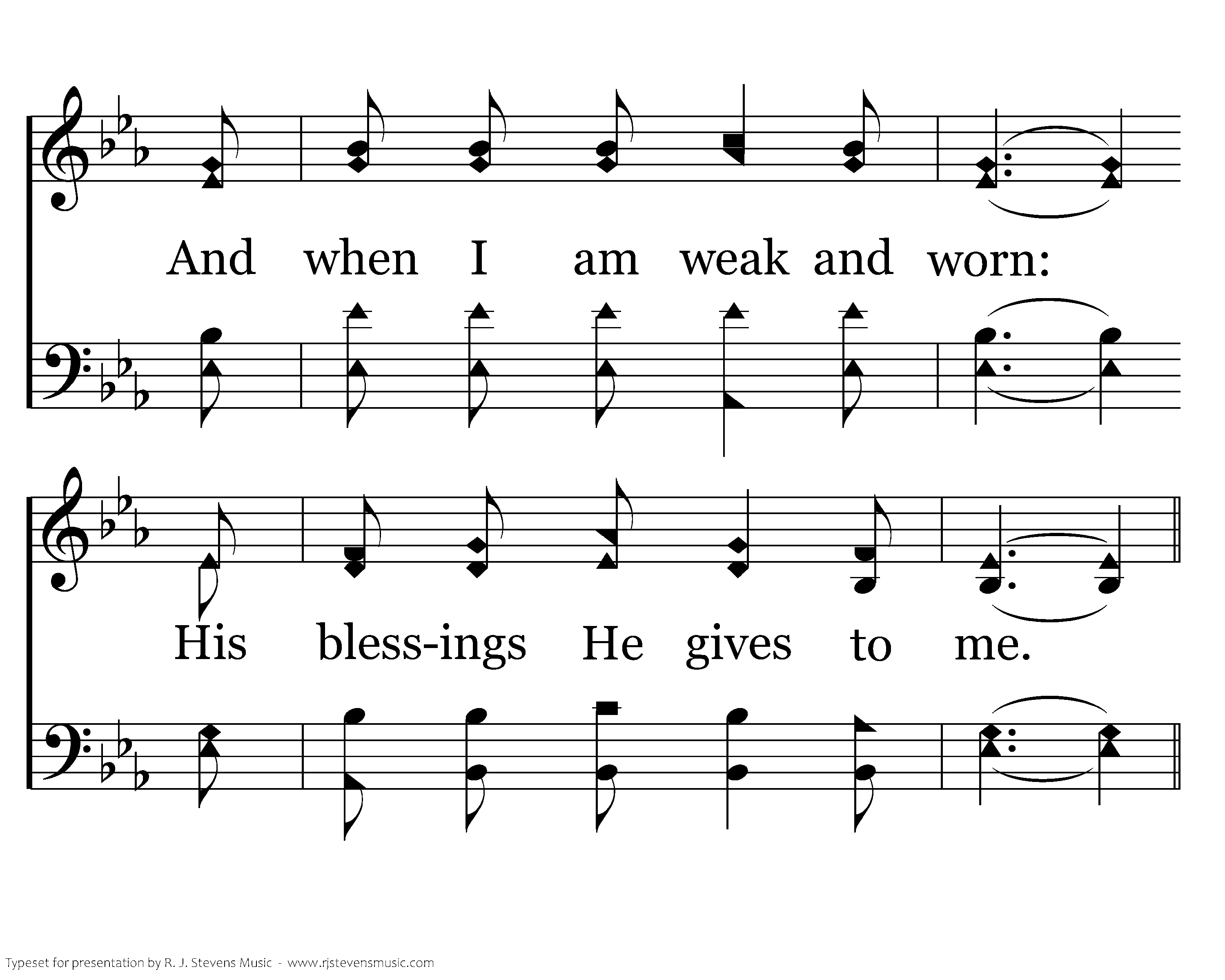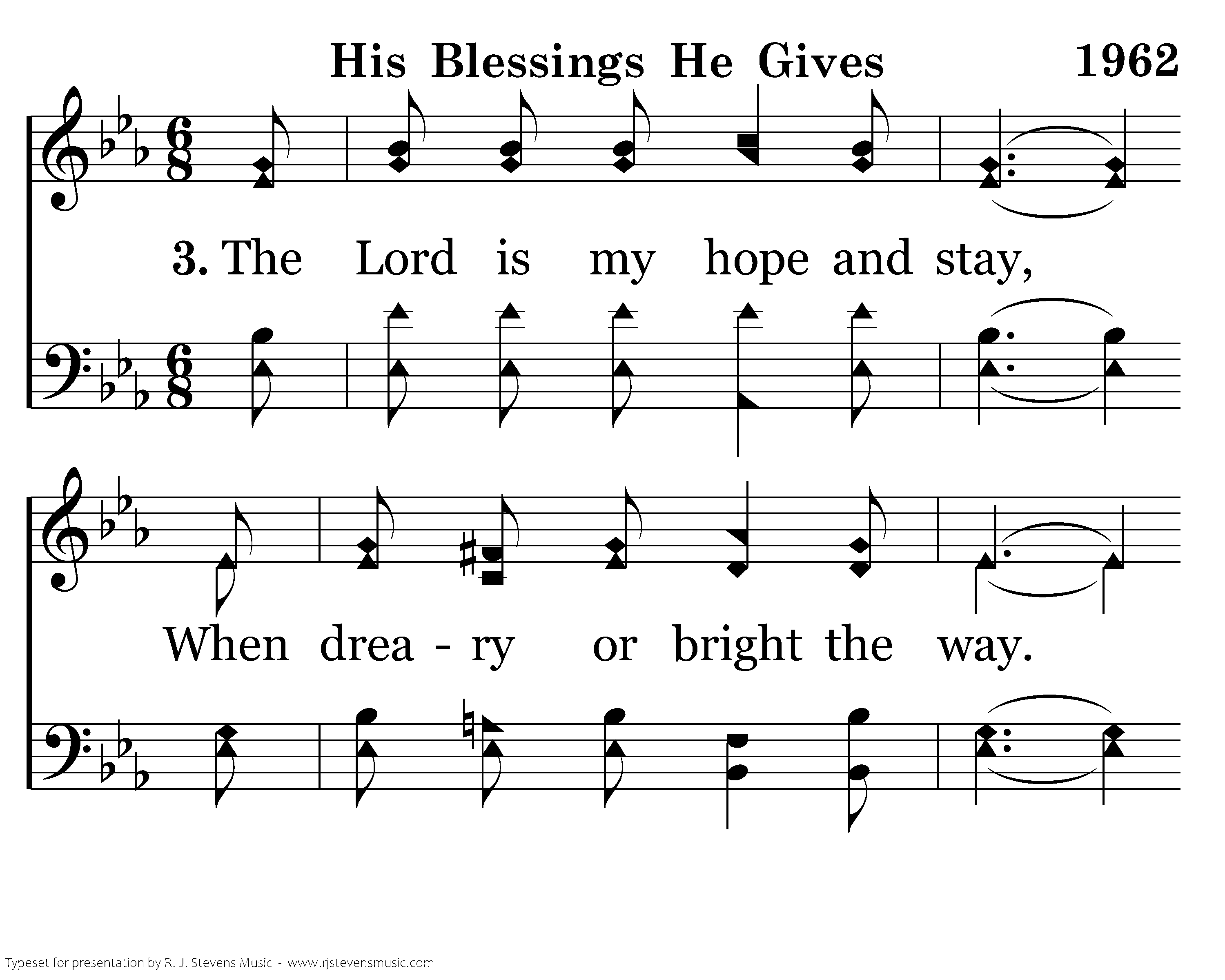 The Lord is my hope and stay, When dreary or bright the way. He anchors my soul secure.His blessings He gives to me.