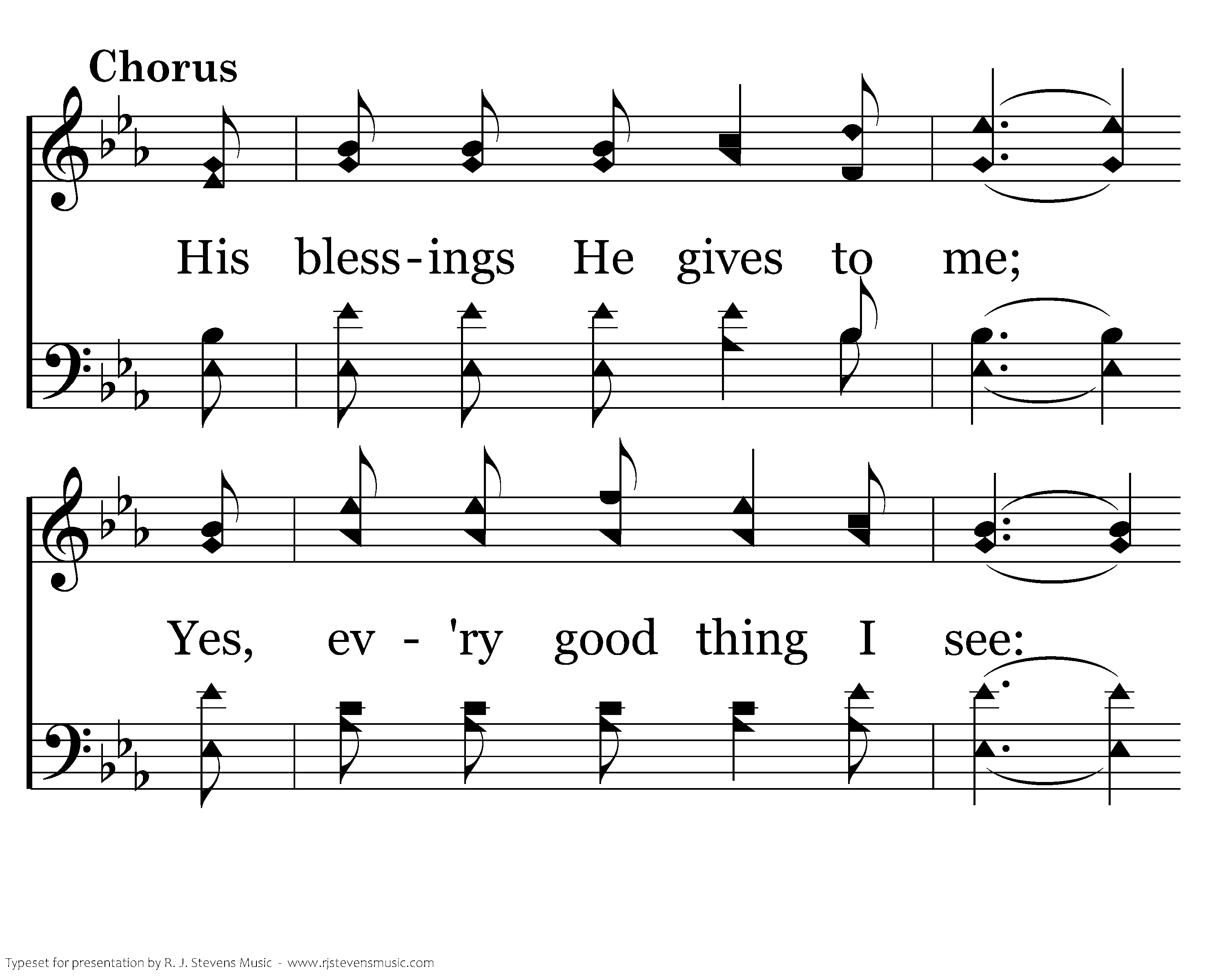 His blessings He gives to me; Yes, ev'ry good thing I see: The gift of Salvation free. His blessings He gives to me.