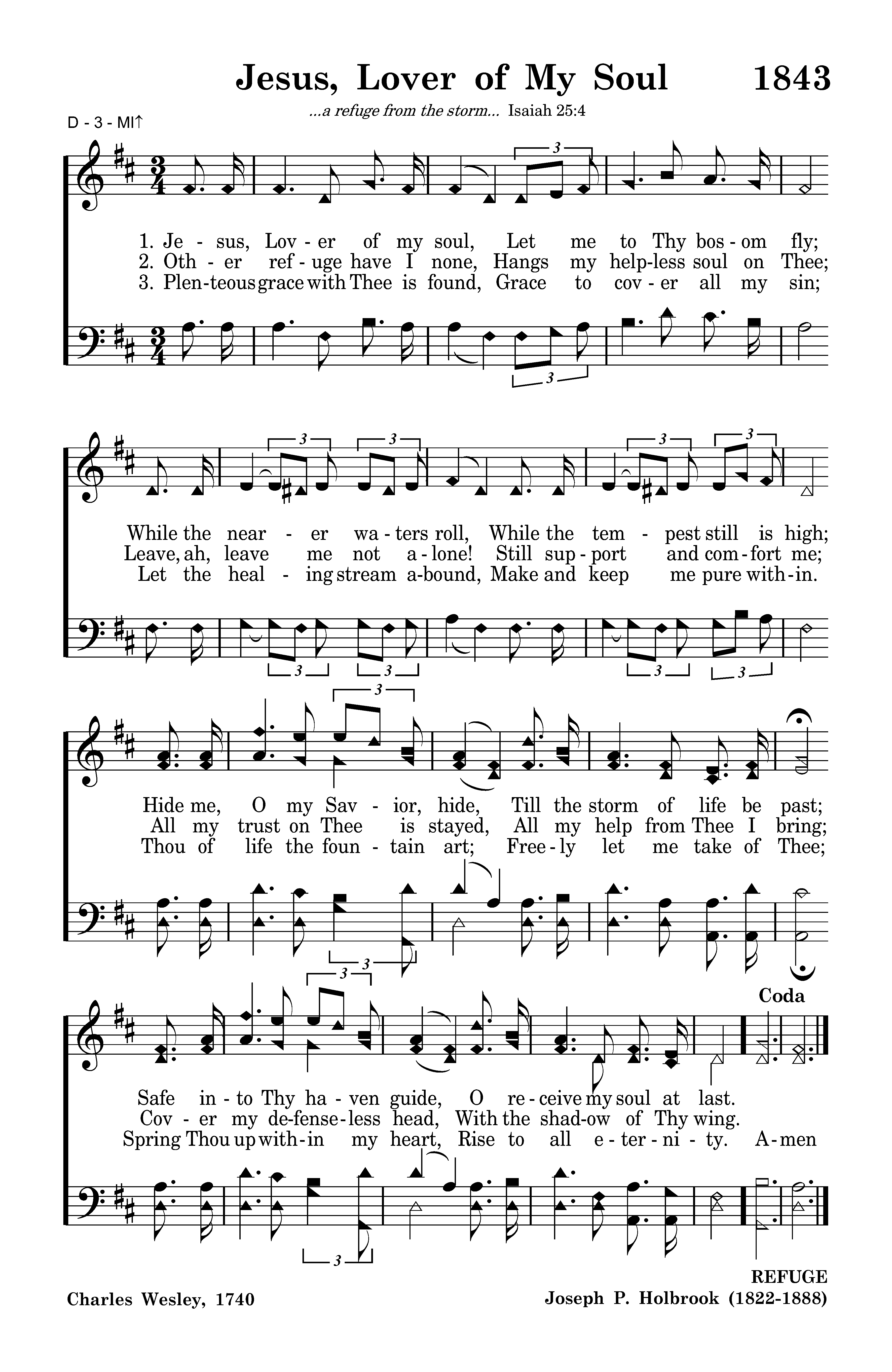 Jesus, Lover of my soul, Let me to Thy bosom fly; While the nearer waters roll, While the tempest still is high; Hide me, O my Savior, hide, Till the storm of life be past; Safe into Thy haven guide, O receive my soul at last.