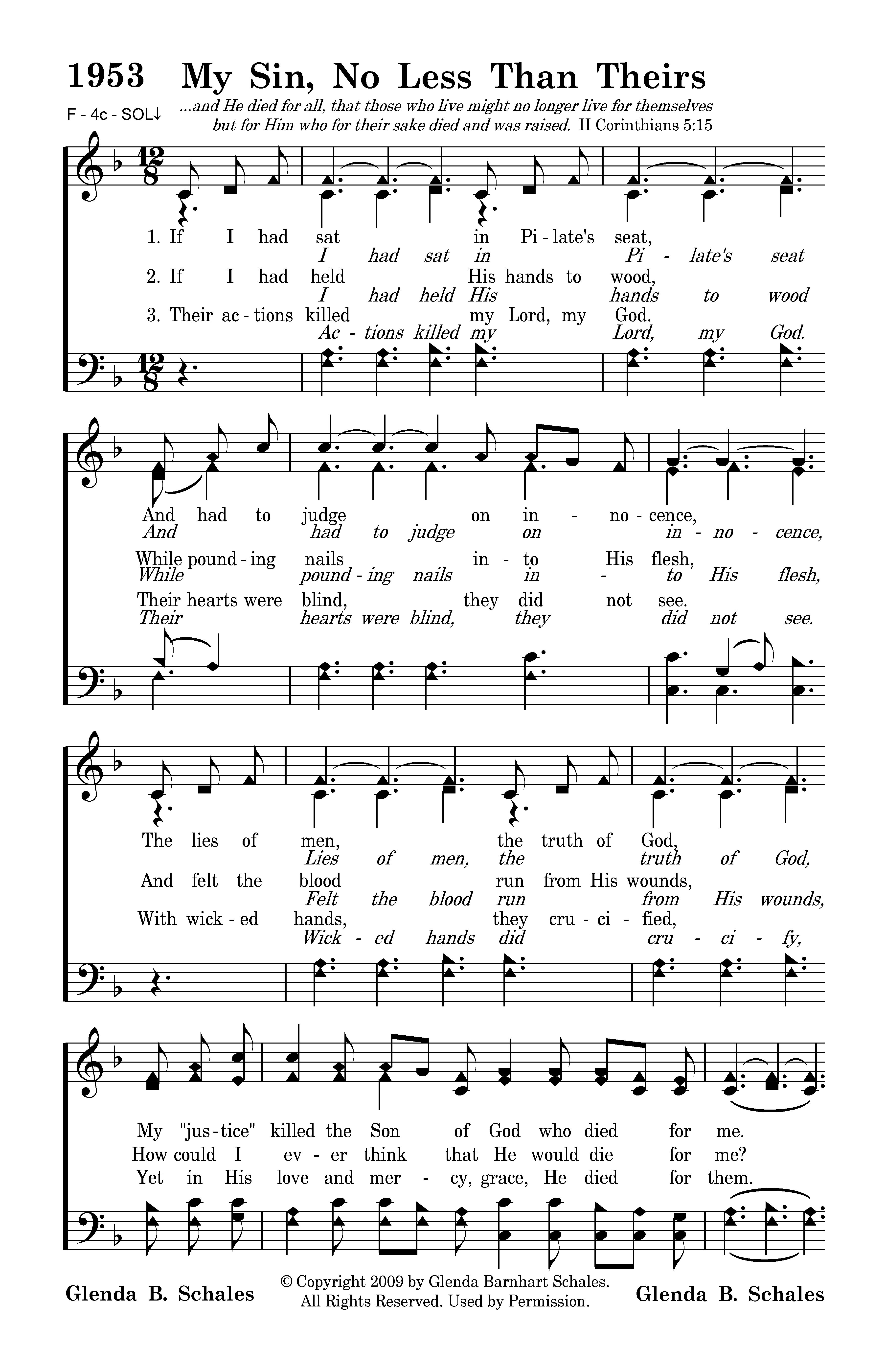 If I had sat in Pilate's seat, And had to judge on innocence, The lies of men, the truth of God, My "justice" killed the Son of God who died for me. And slashed at Him with sharpened words, Or if I'd been one in the crowd, Whose eyes were healed by God's own touch, Did I cry loudly, "Crucify" To Him who loved and died for me. me.