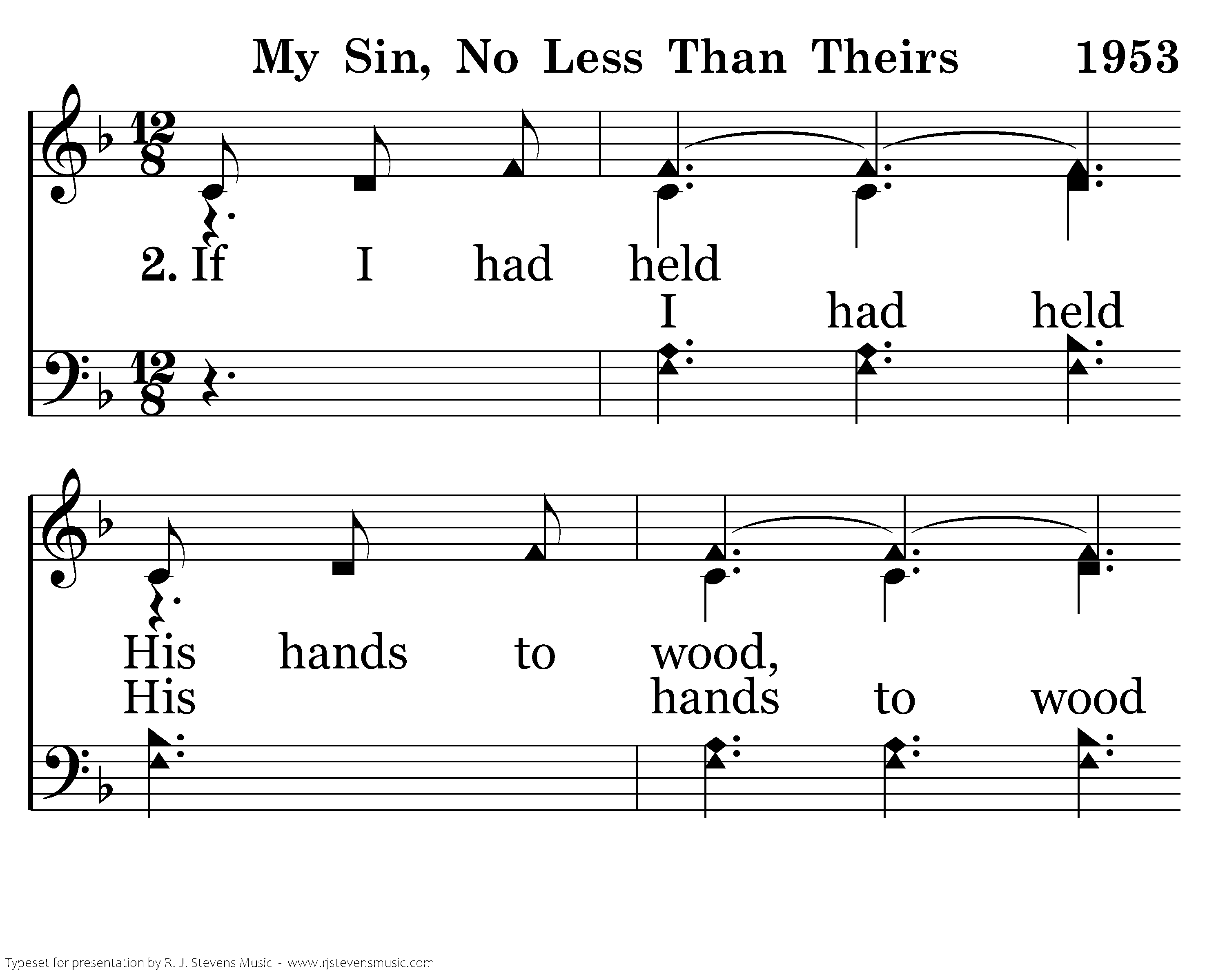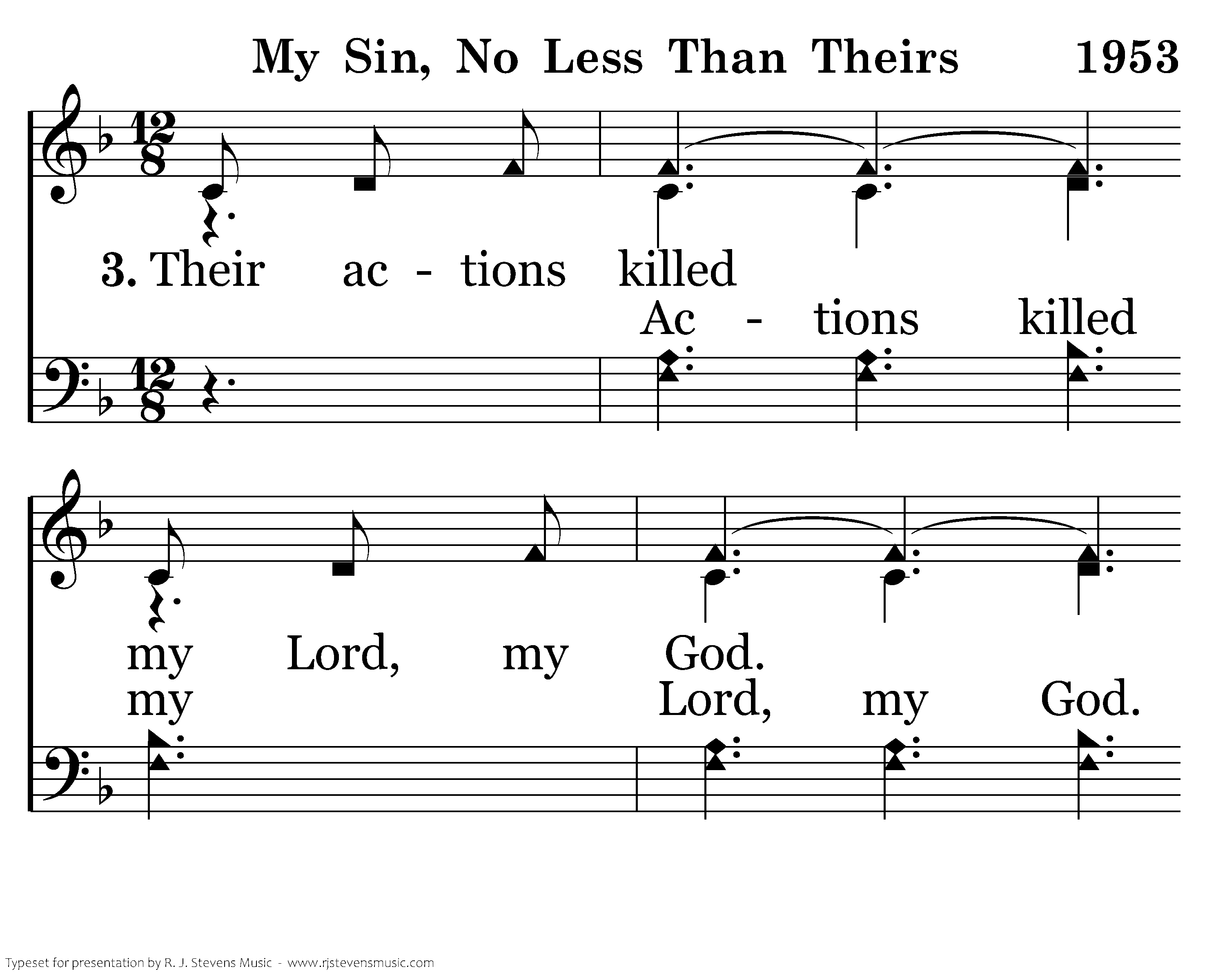 Their actions killed my Lord, my God. Their hearts were blind, they did not see. With wicked hands, they crucified, Yet in His love and mercy, grace, He died for them. And yet my sin, no less than theirs, Compels my heart to worship Him. My sin has given Him more pain, But knowing this, He died for me.