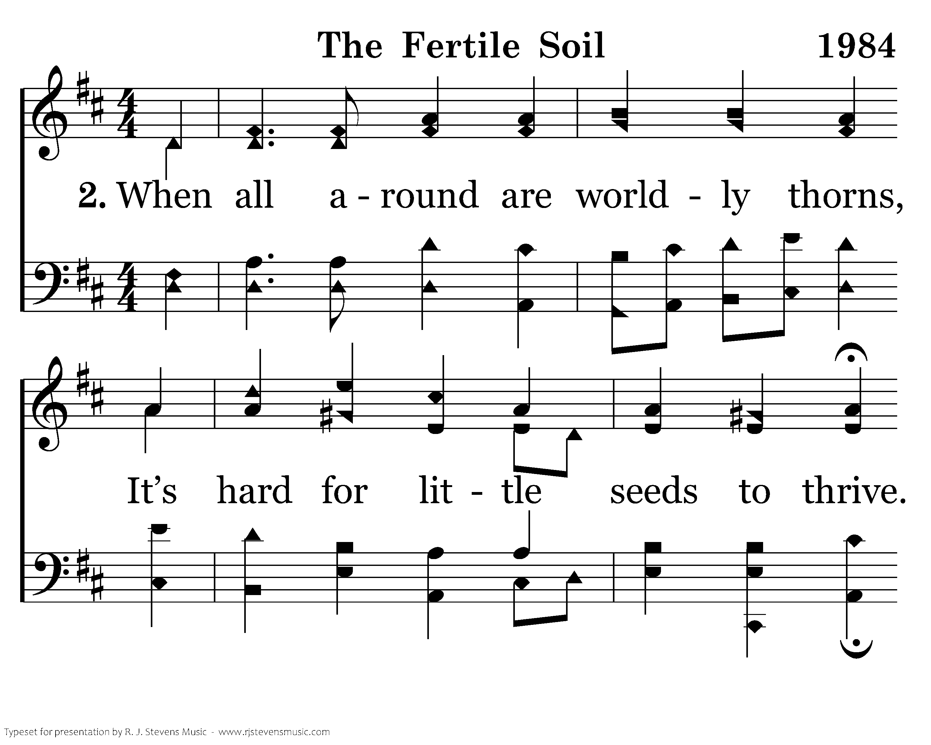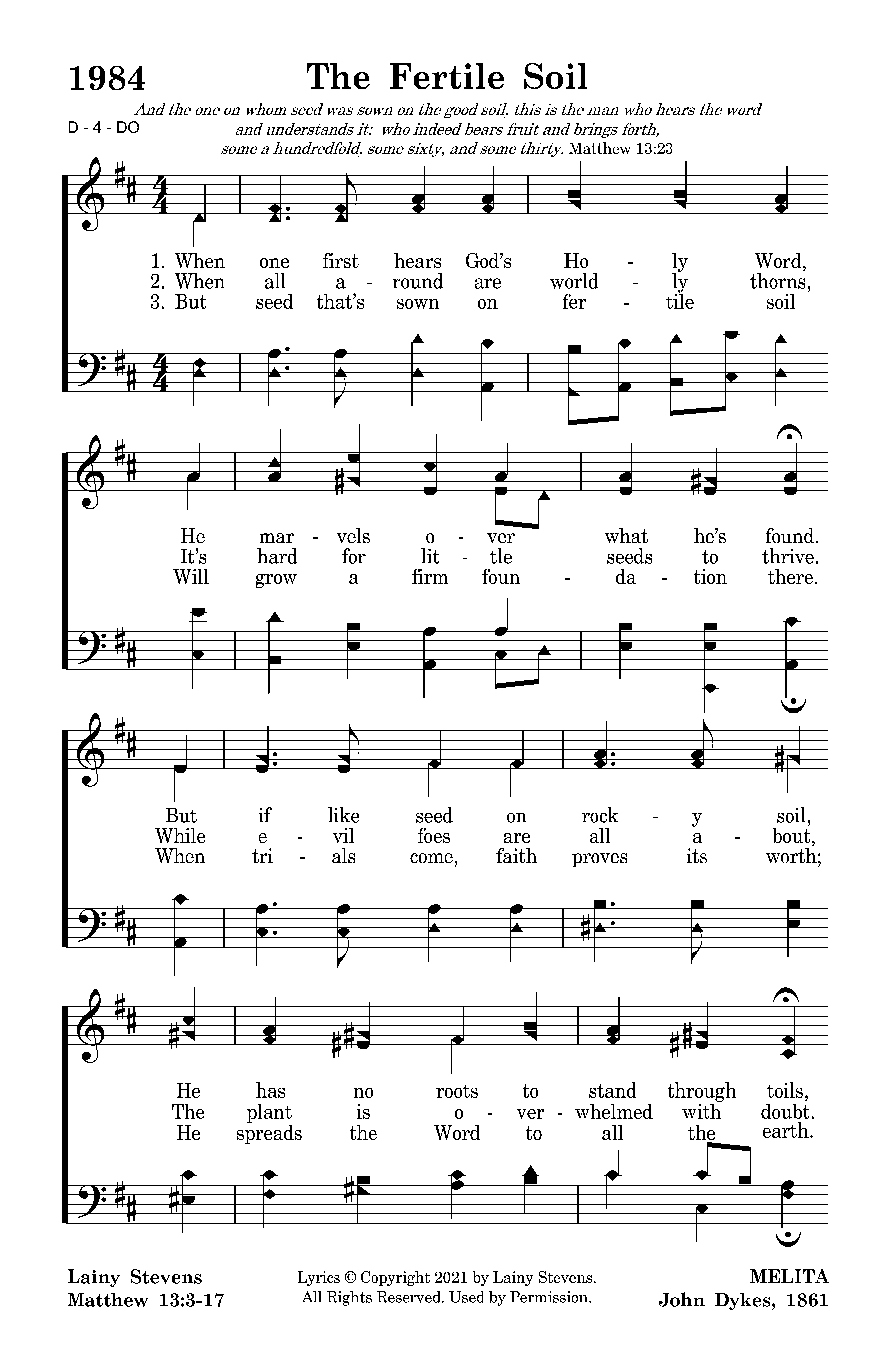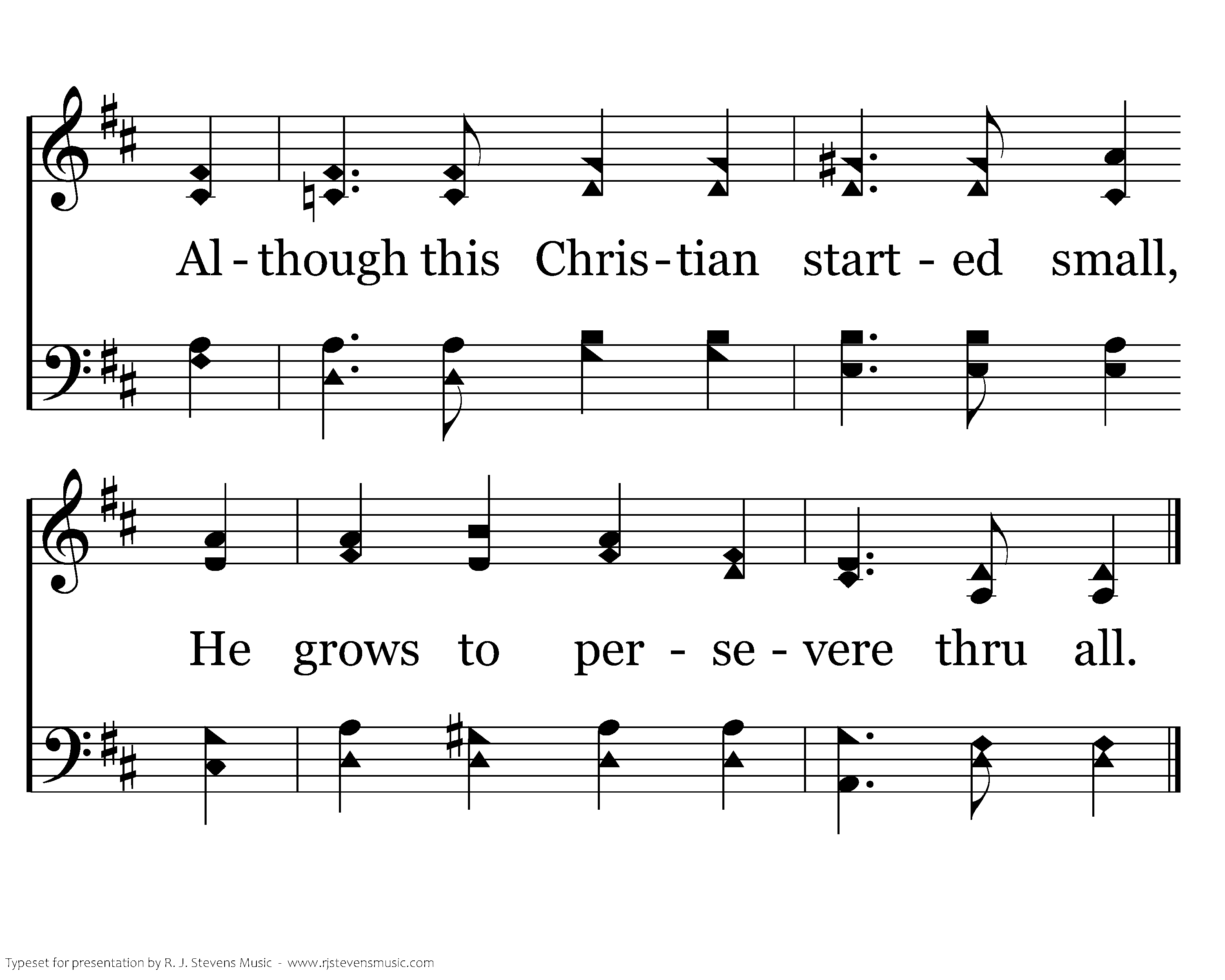 But seed that’s sown on fertile soil Will grow a firm foundation there. When trials come, faith proves its worth; He spreads the Word to all the earth. Although this Christian started small, He grows to persevere through all.