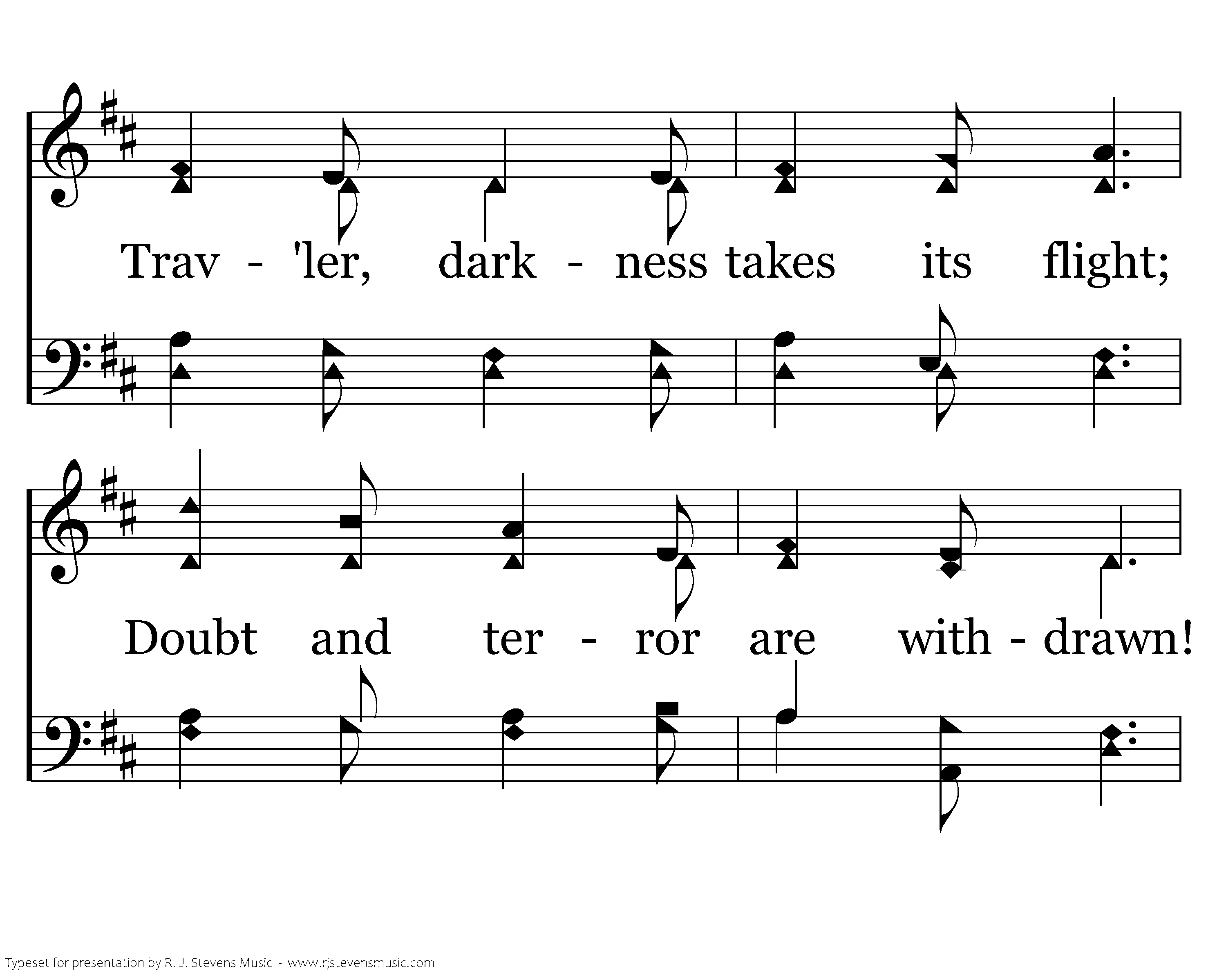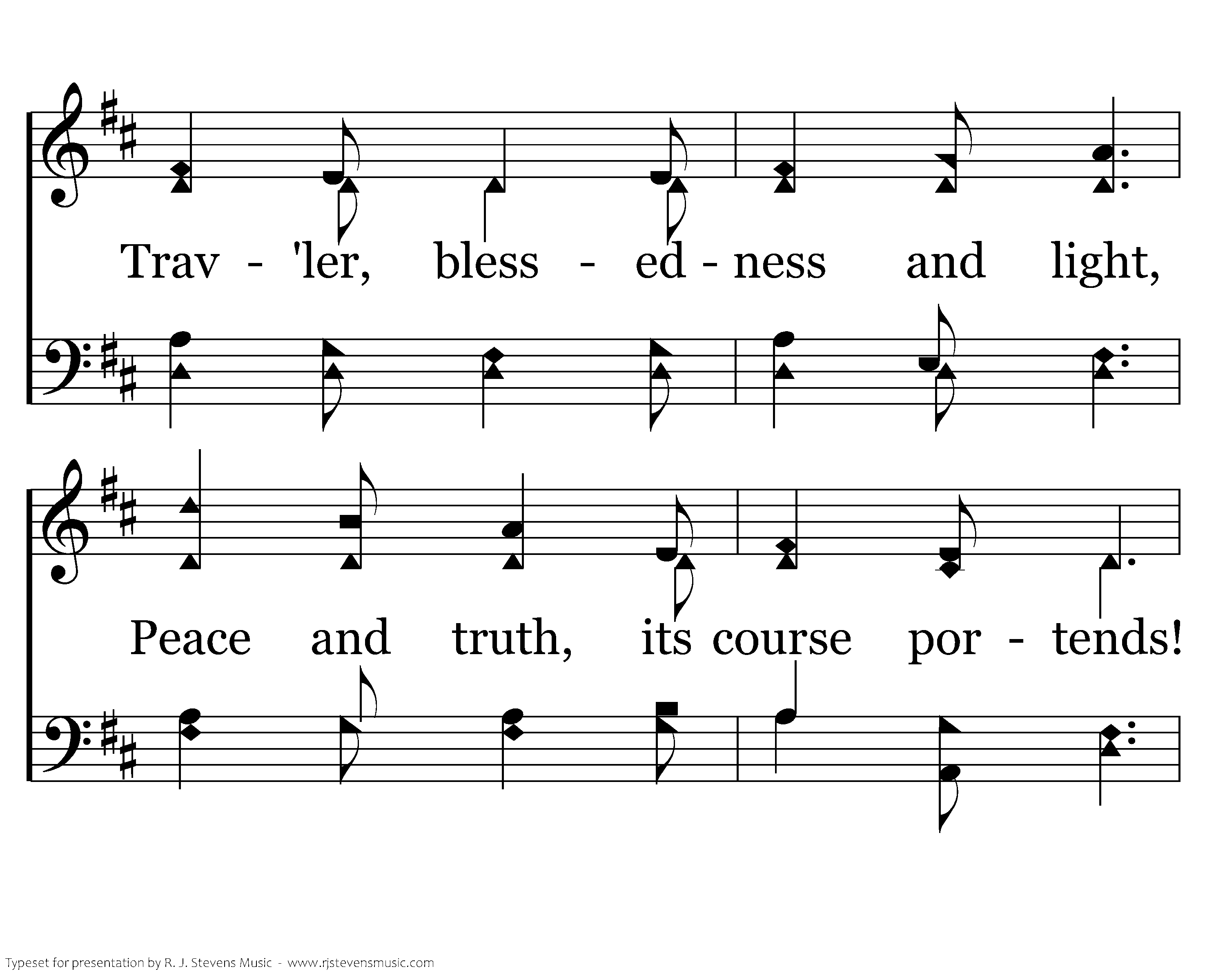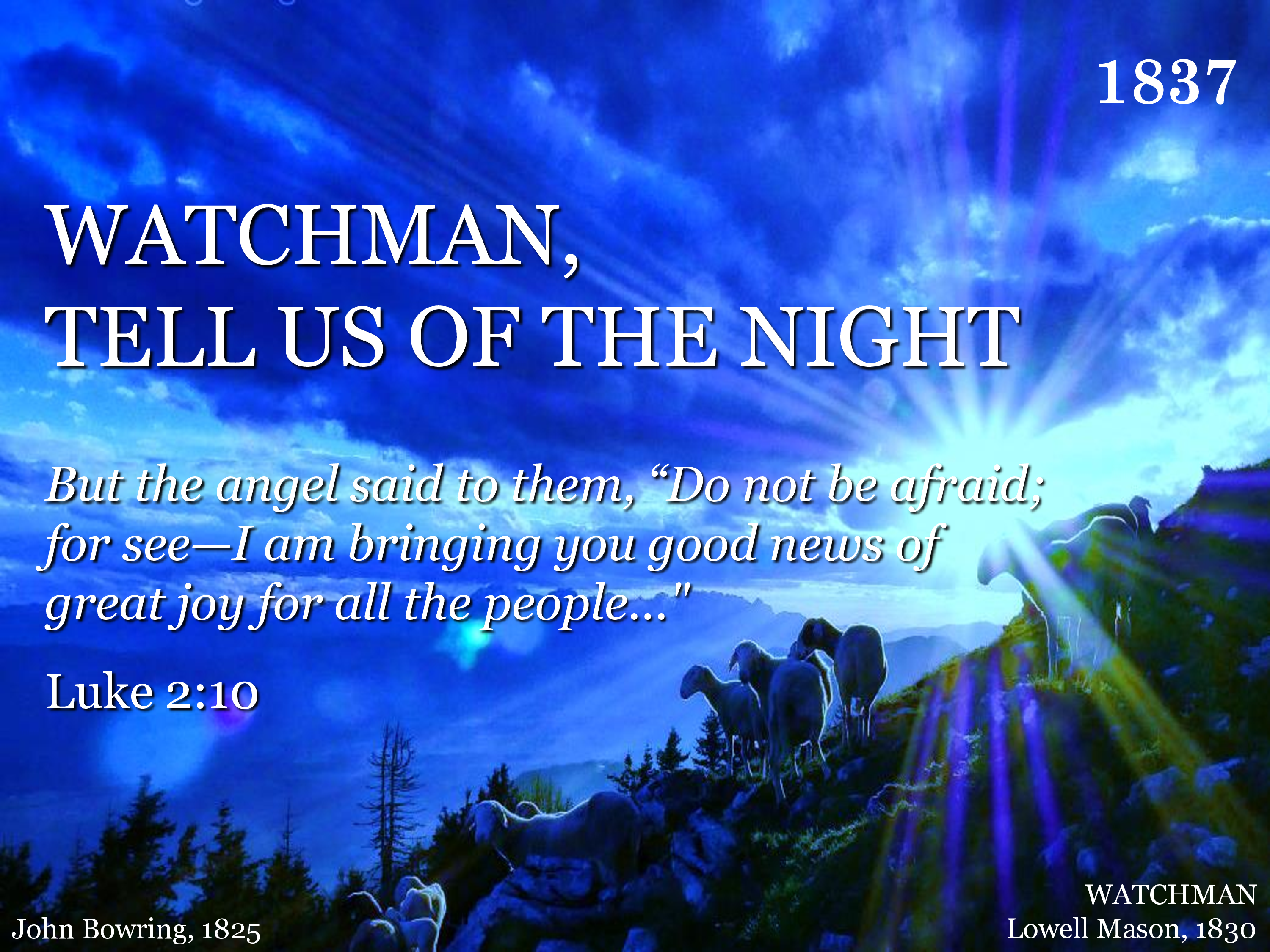 Watchman, tell us of the night, For the morning seems to dawn: Trav'ler, darkness takes its flight; Doubt and terror are withdrawn! Watchman, let thy wand'rings cease; Hie thee to thy quiet home: Trav'ler, lo, the Prince of Peace, Lo, the Son of God is come!