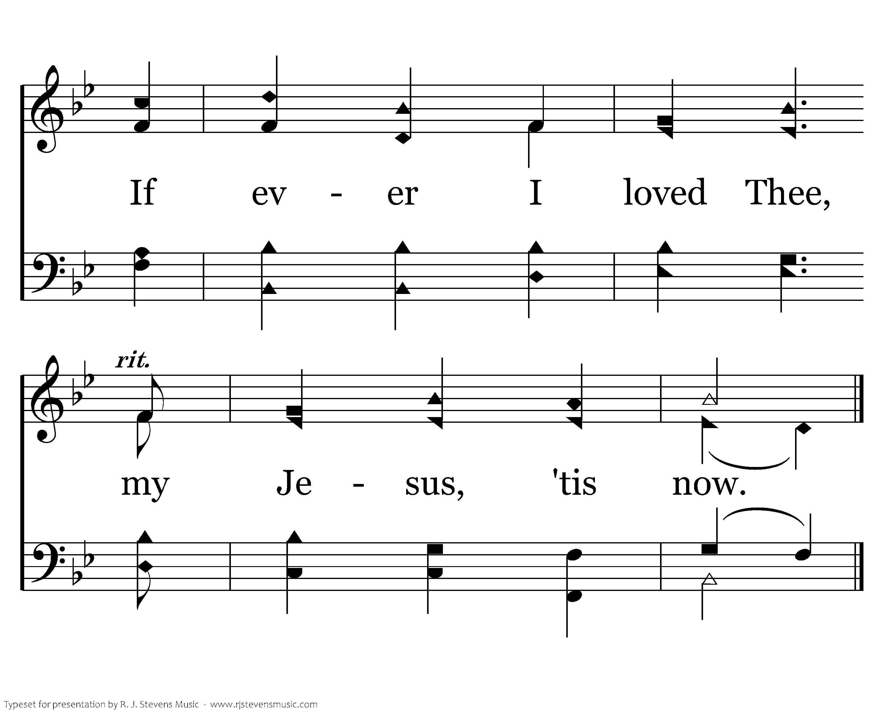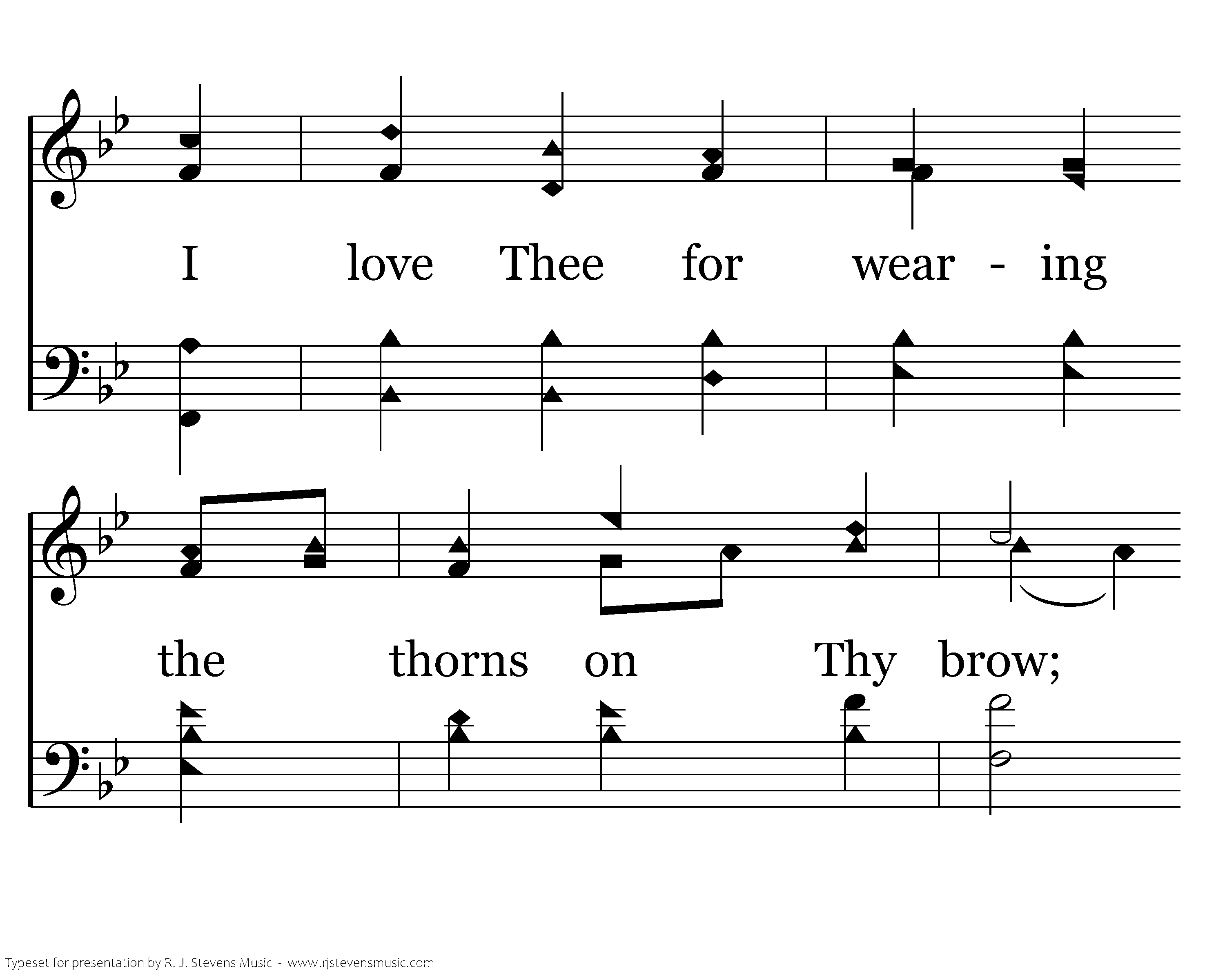 I love Thee because Thou hast first loved me, And purchased my pardon on Calvary's tree; I love Thee for wearing the thorns on Thy brow; If ever I loved Thee, my Jesus, 'tis now.