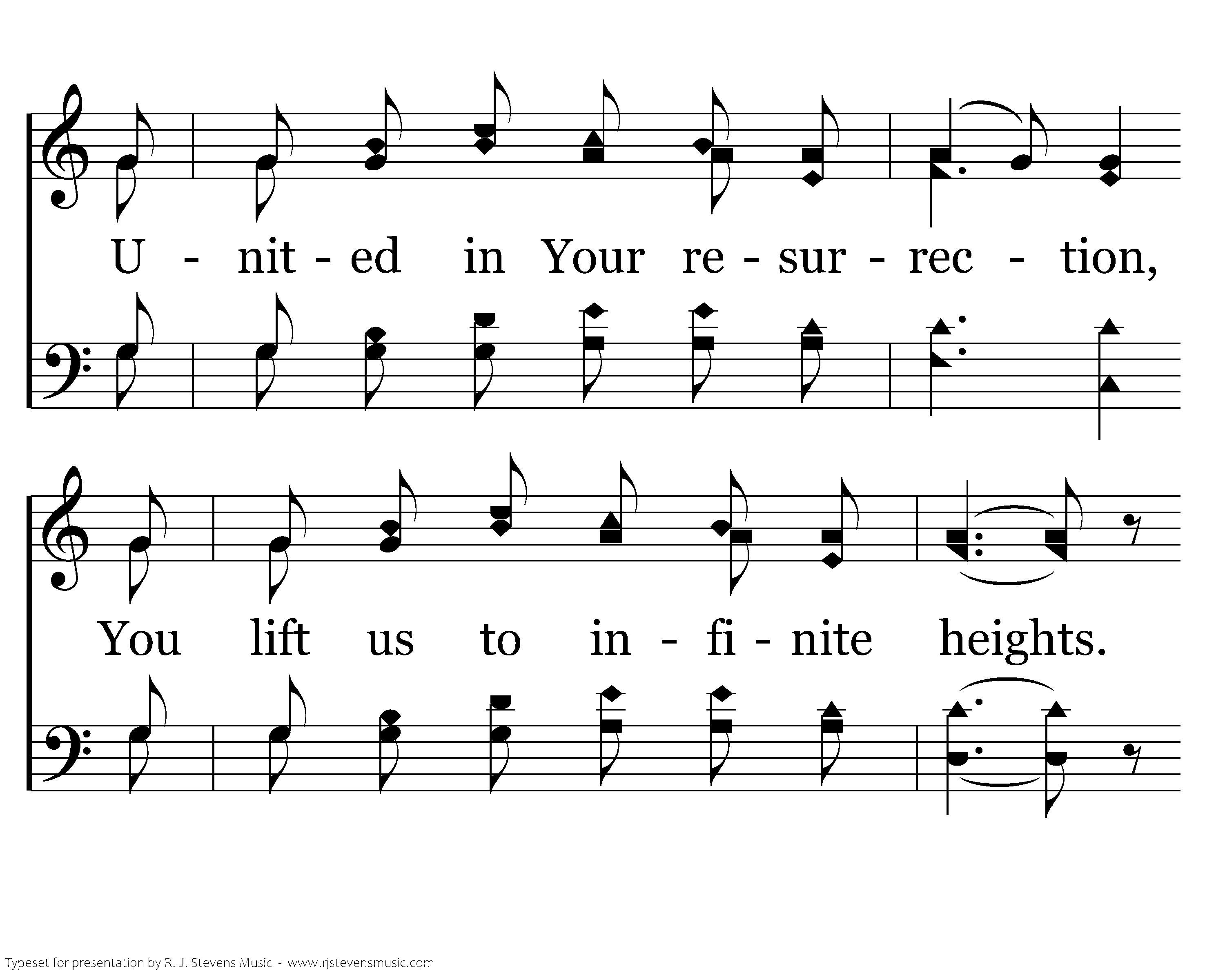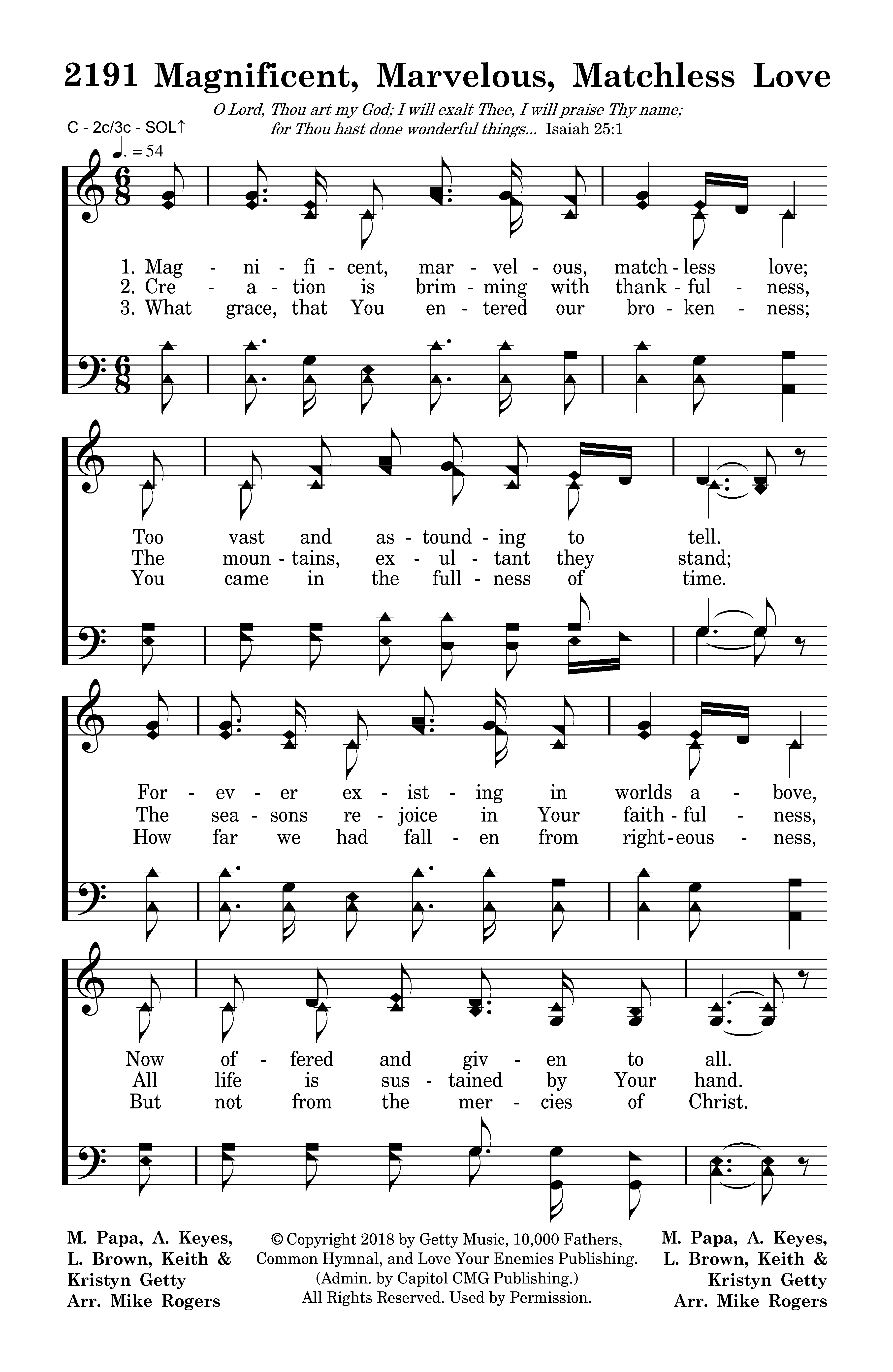 Creation is brimming with thankfulness, The mountains, exultant they stand; The seasons rejoice in Your faithfulness, All life is sustained by Your hand. You crown ev'ry meadow with color; You paint ev'ry shade in the sky; Each day the dawn wakes as an encore of Magnificent, marvelous, matchless love. United in Your resurrection, You lift us to infinite heights. Could anything sever or take us from Magnificent, marvelous, matchless love.