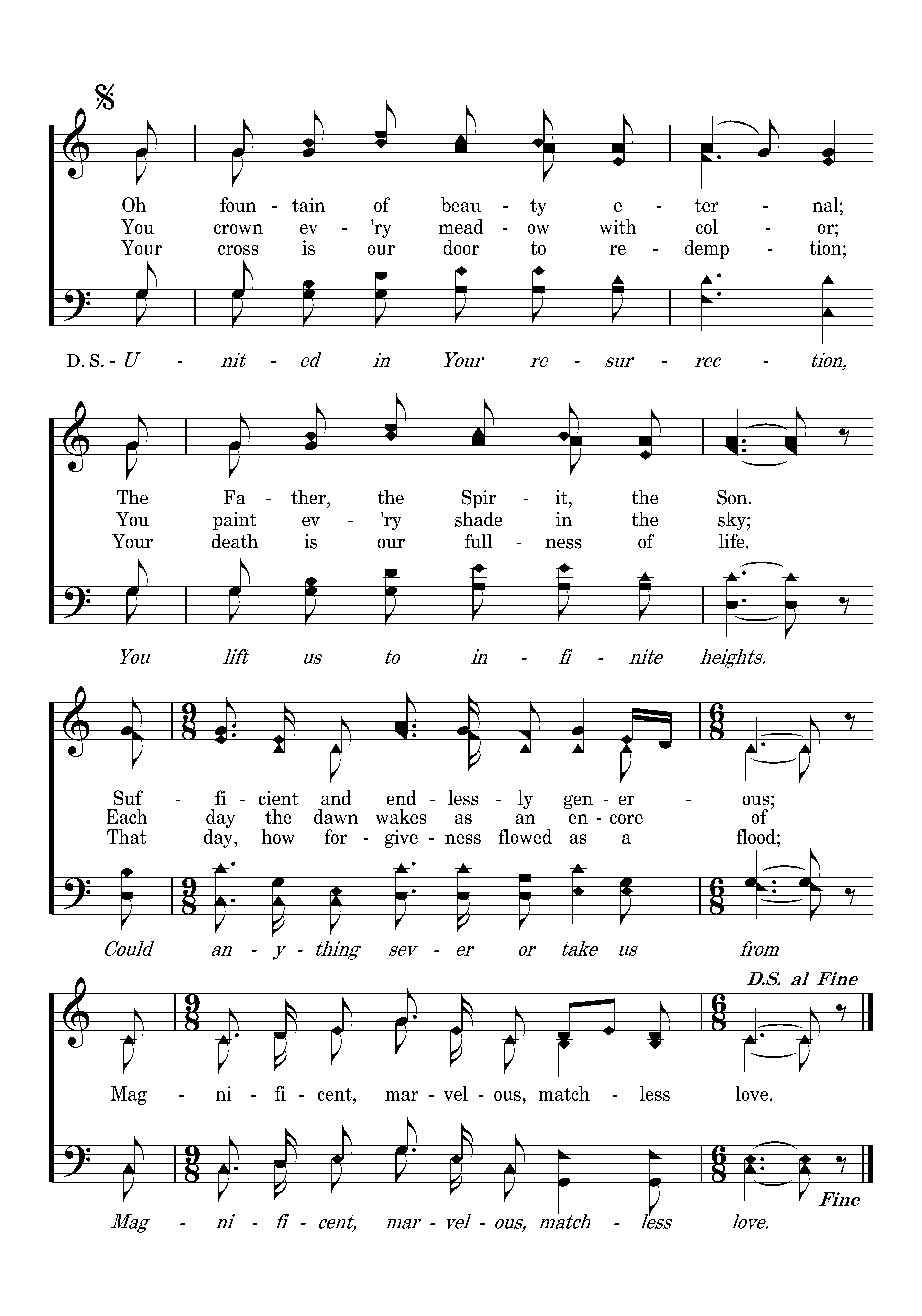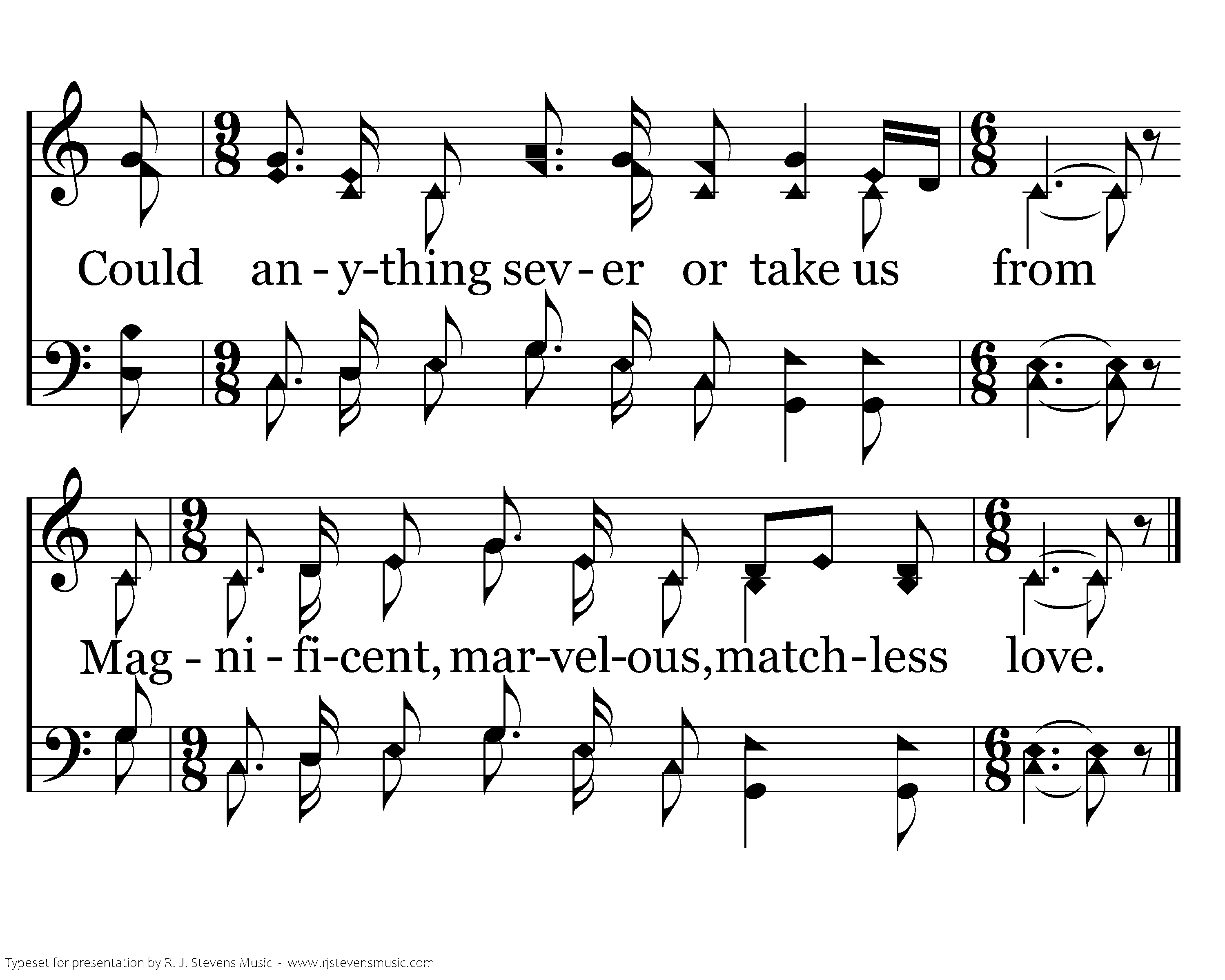 Magnificent, marvelous, matchless love; Too vast and astounding to tell. Forever existing in worlds above, Now offered and given to all. Oh fountain of beauty eternal; The Father, the Spirit, the Son. Sufficient and endlessly generous; Magnificent, marvelous, matchless love. United in Your resurrection, You lift us to infinite heights. Could anything sever or take us from Magnificent, marvelous, matchless love.