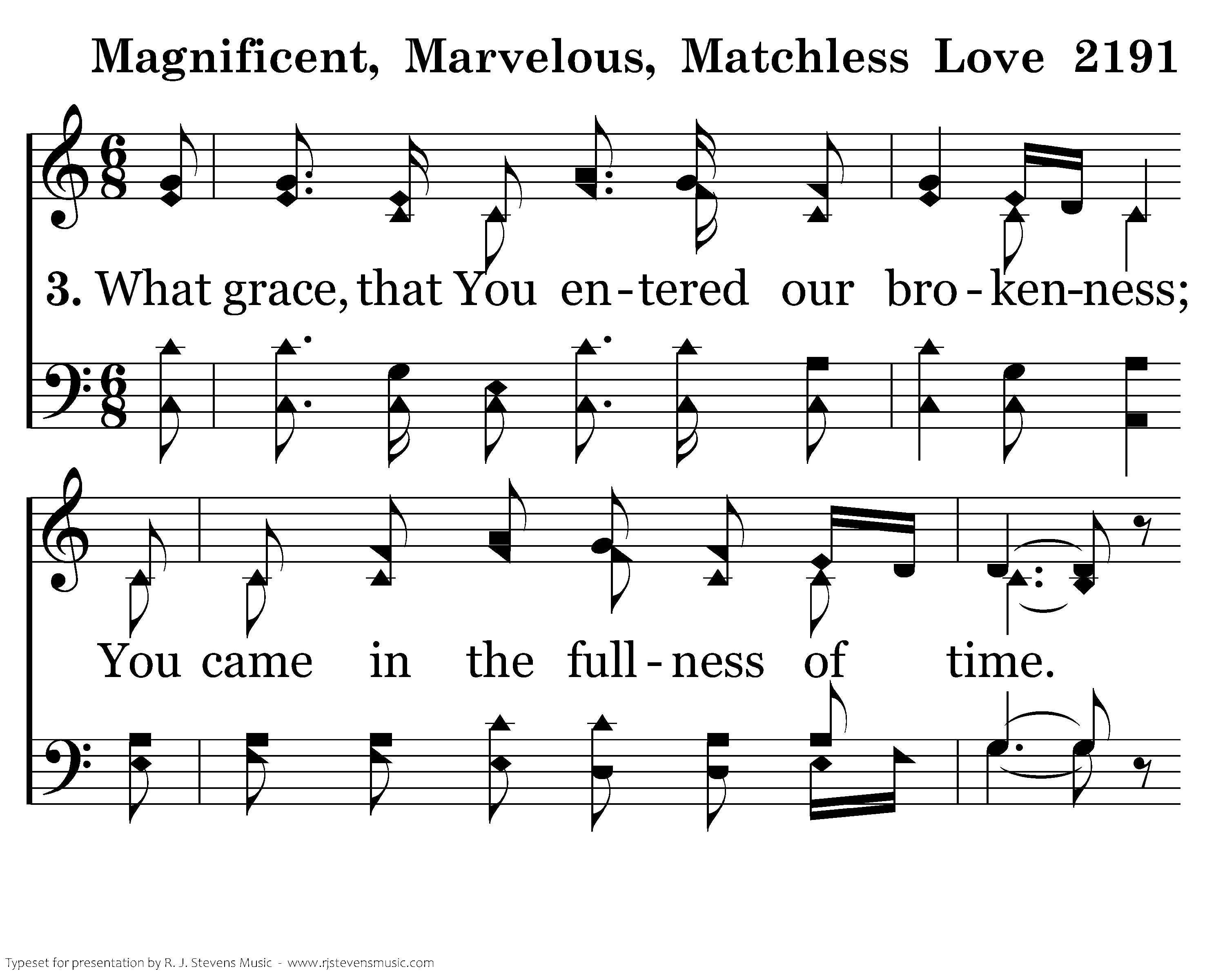 What grace, that You entered our brokenness; You came in the fullness of time. How far we had fallen from righteousness, But not from the mercies of Christ. Your cross is our door to redemption; Your death is our fullness of life. That day, how forgiveness flowed as a flood; Magnificent, marvelous, matchless love. United in Your resurrection, You lift us to infinite heights. Could anything sever or take us from Magnificent, marvelous, matchless love.