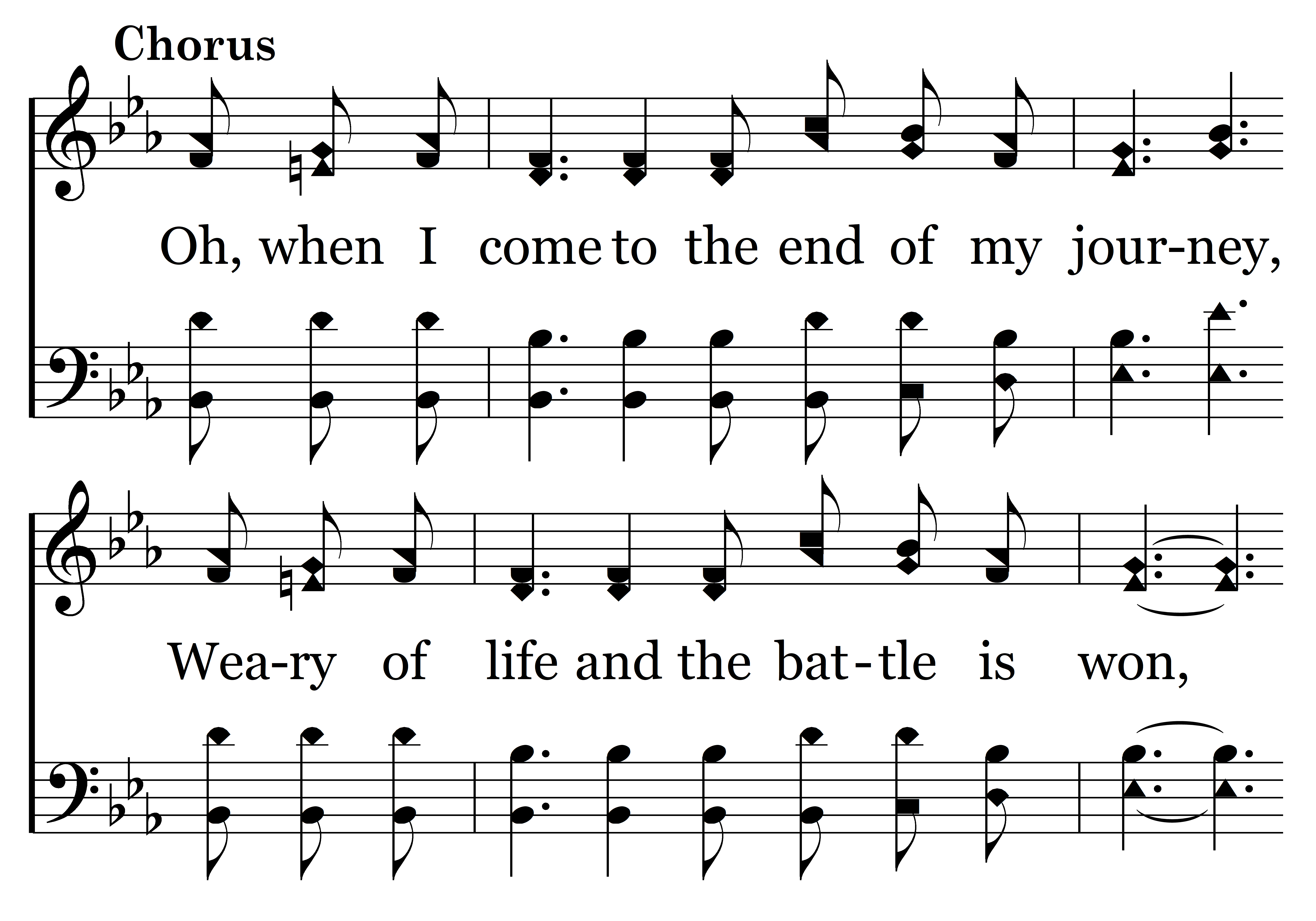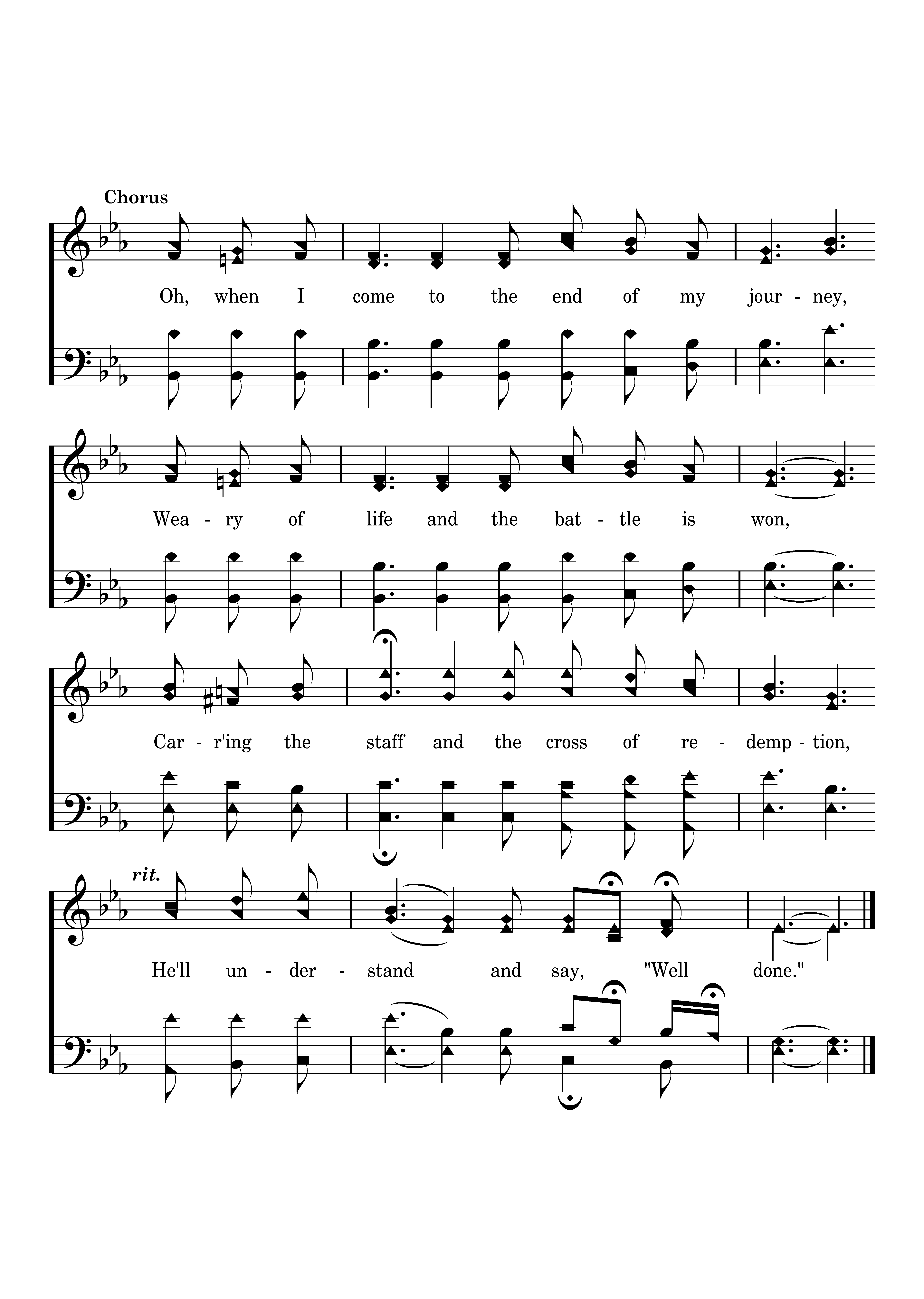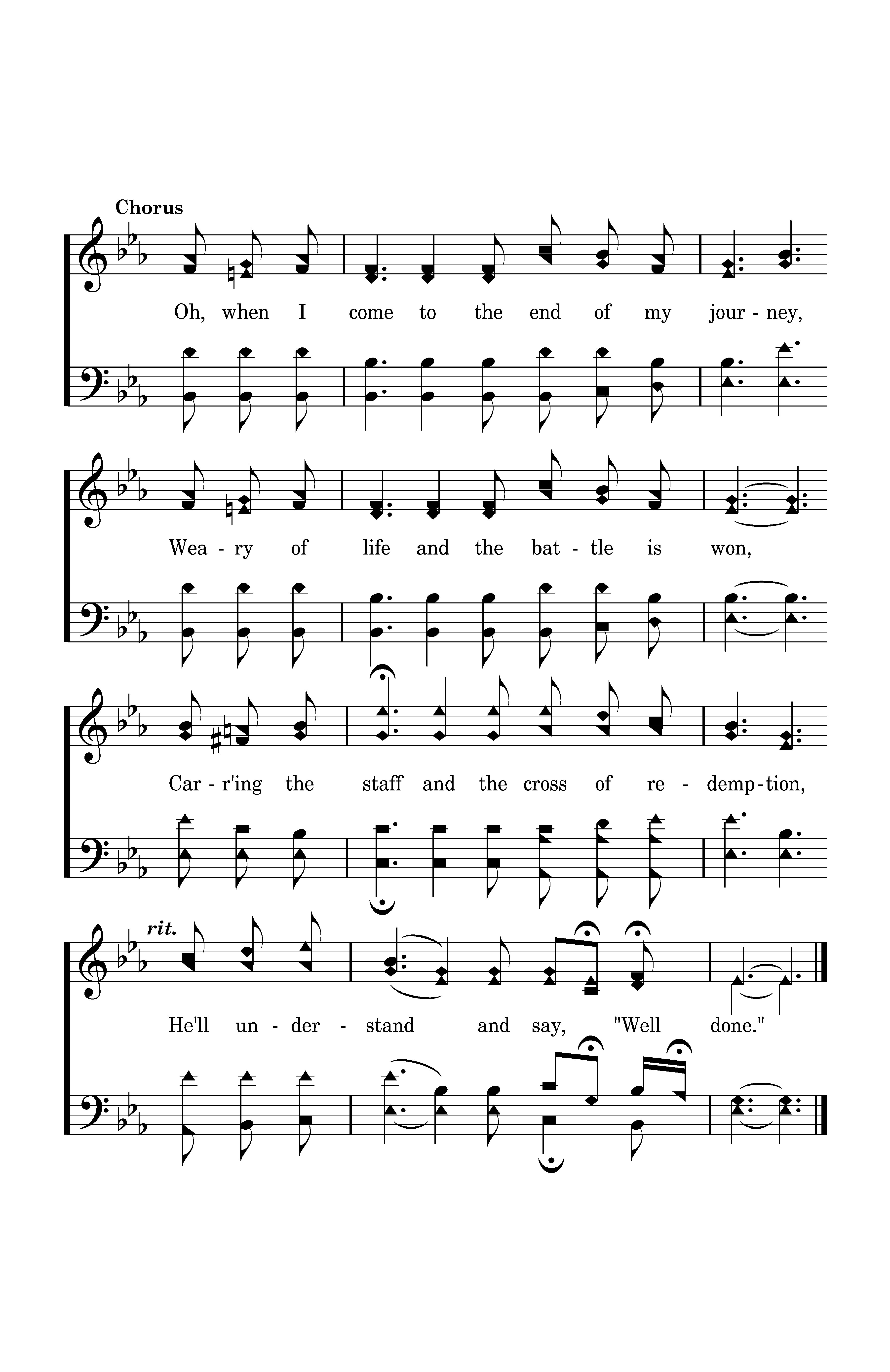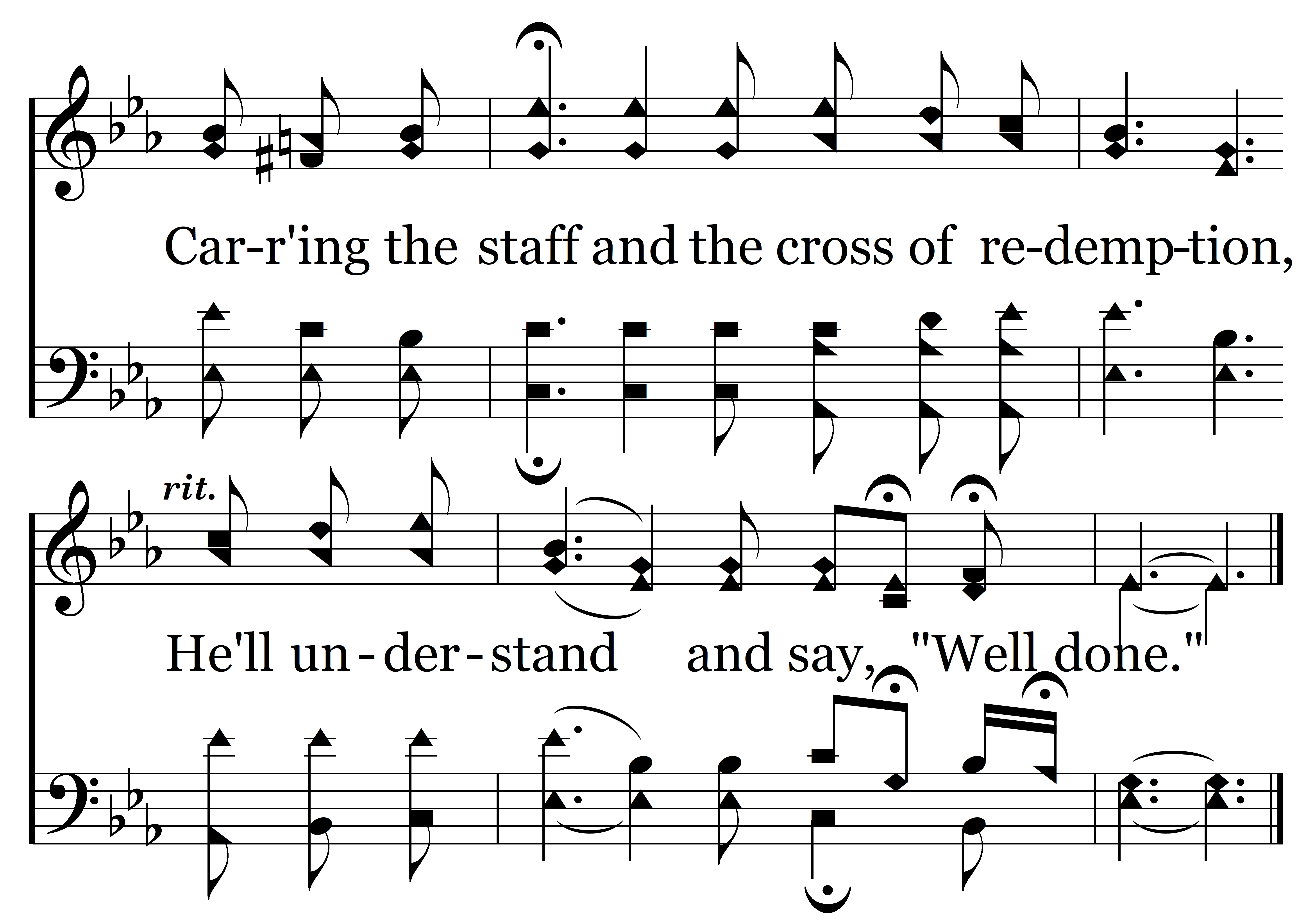 Oh, when I come to the end of my journey, Weary of life and the battle is won, Carrying the staff and the cross of redemption, He'll understand and say, "Well done."