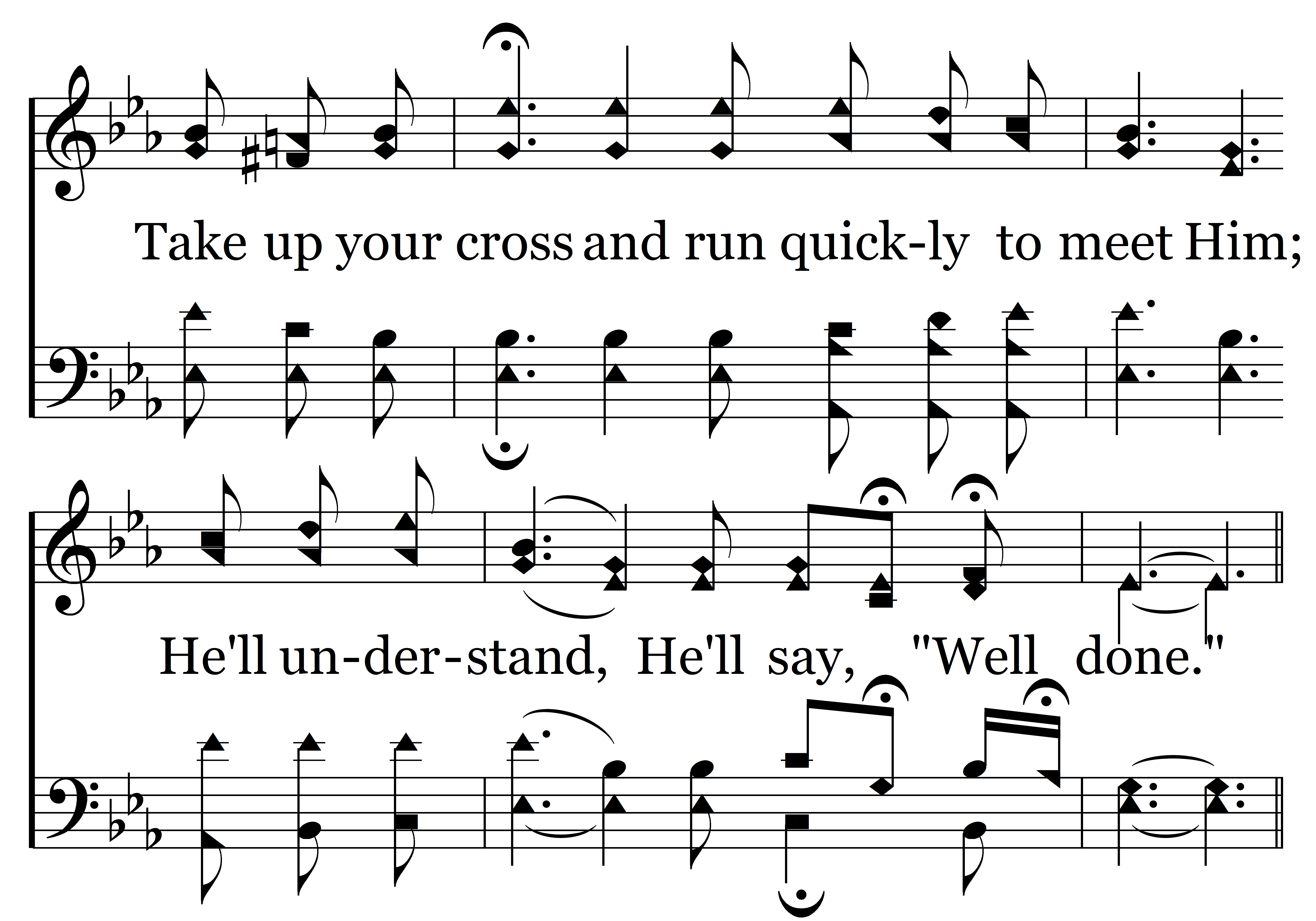 But if you try and fail in your trying, Hands sore and scarred from the work you've begun, Take up your cross and run quickly to meet him; He'll understand, He'll say, "Well done."