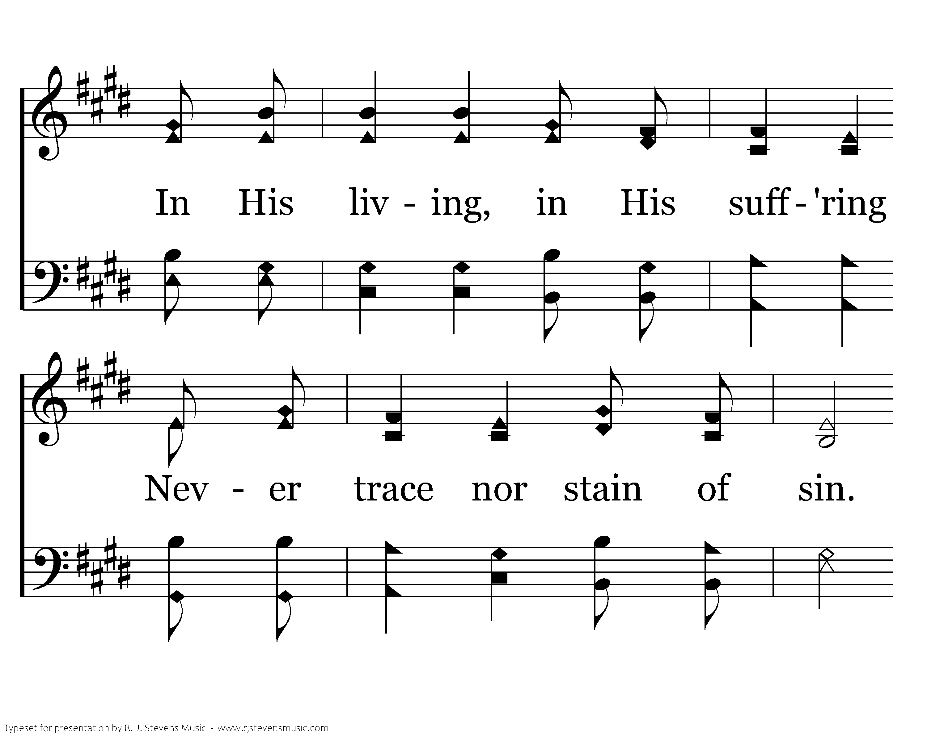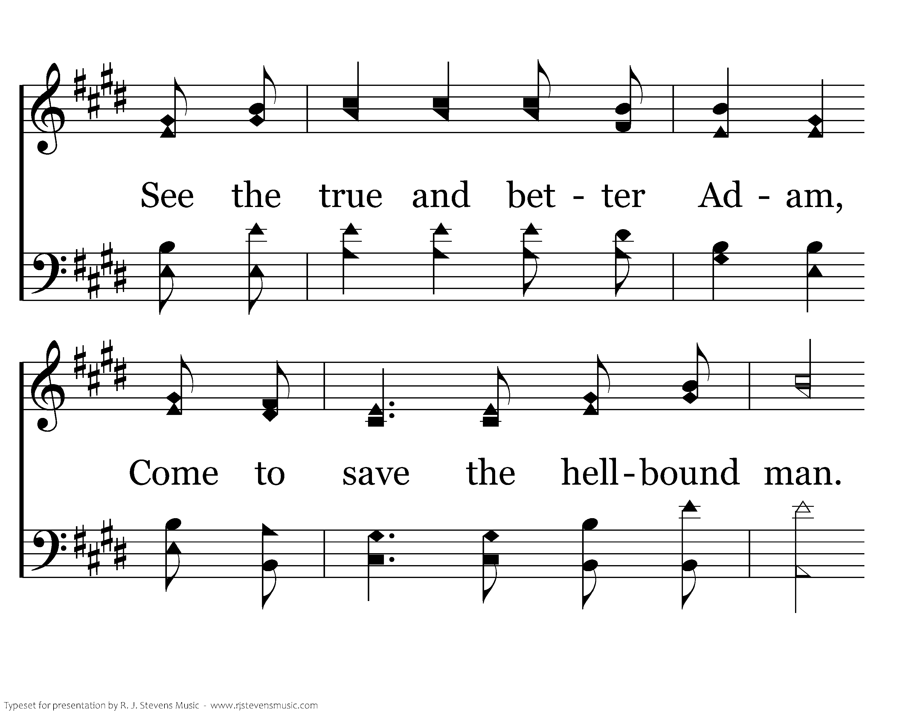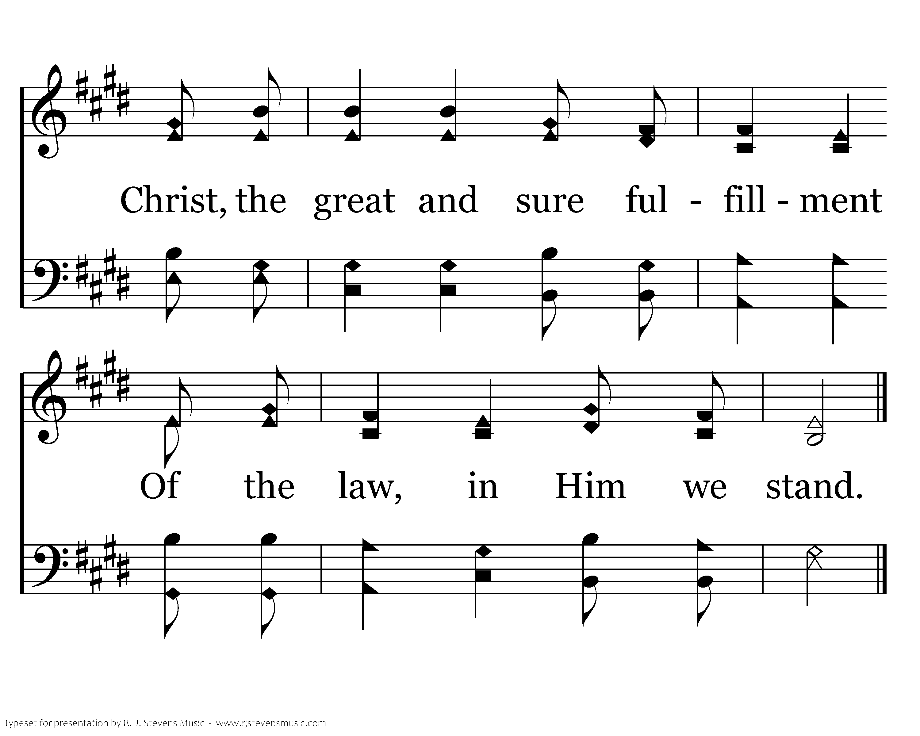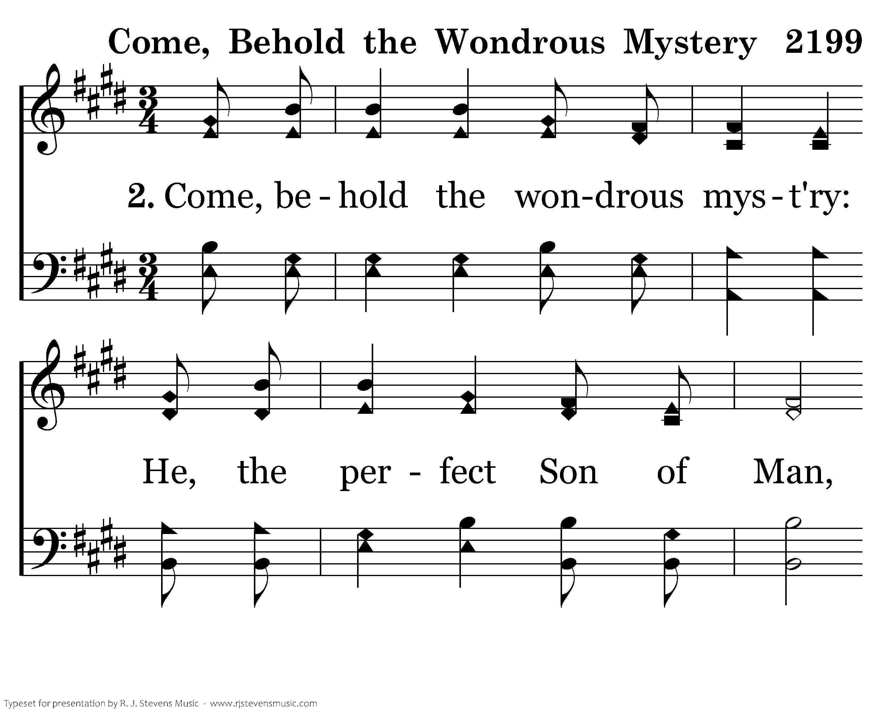 Come, behold the wondrous myst'ry: He, the perfect Son of Man, In His living, in His suff'ring Never trace nor stain of sin. See the true and better Adam, Come to save the hell-bound man. Christ, the great and sure fulfillment Of the law, in Him we stand.