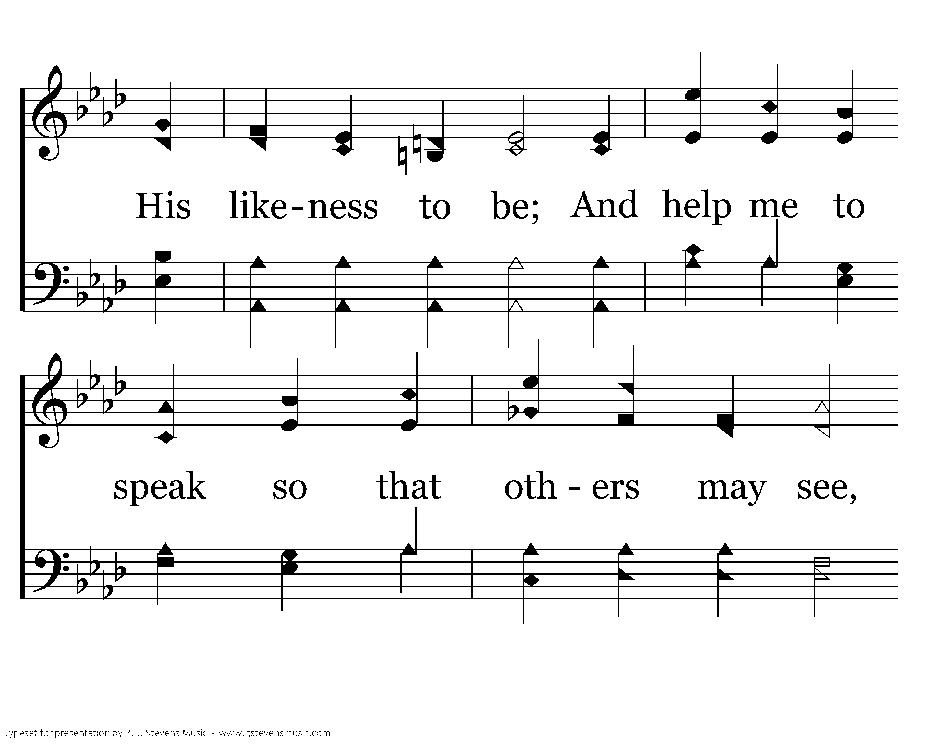 There’s ought of example but Jesus for me, Help me ever, dear Father, His likeness to be; And help me to speak so that others may see, That the Savior is living in me.