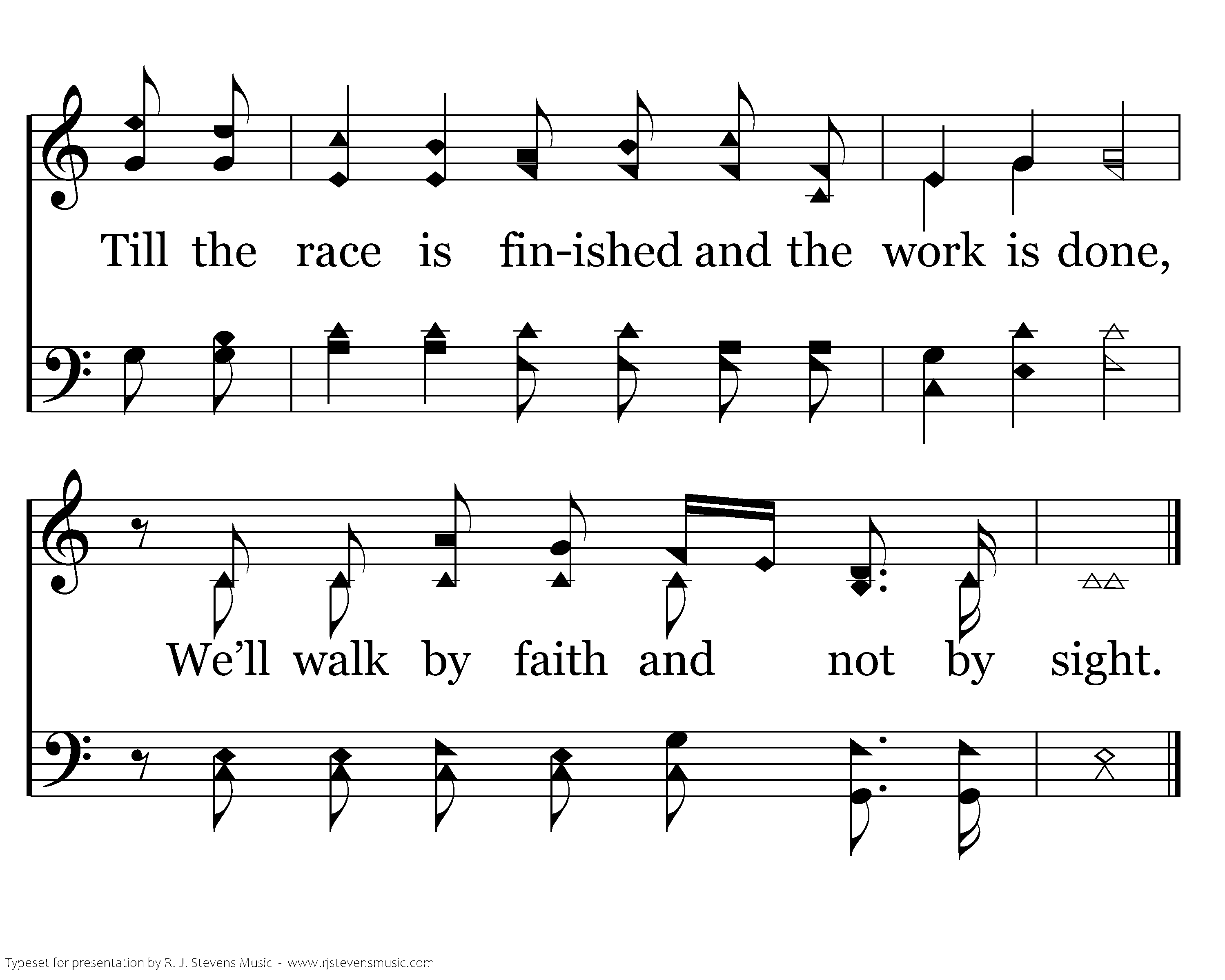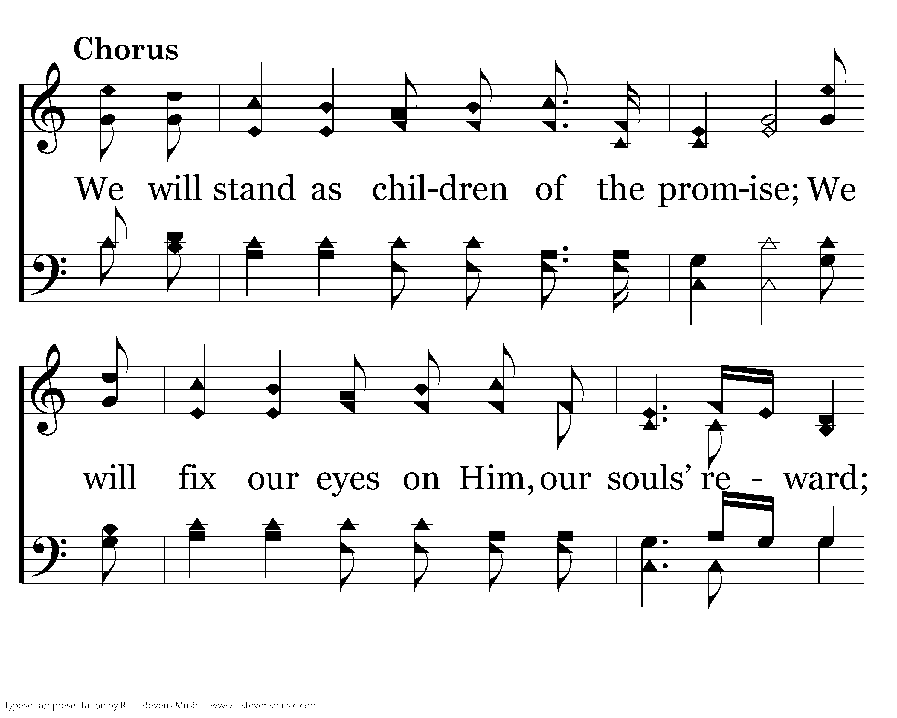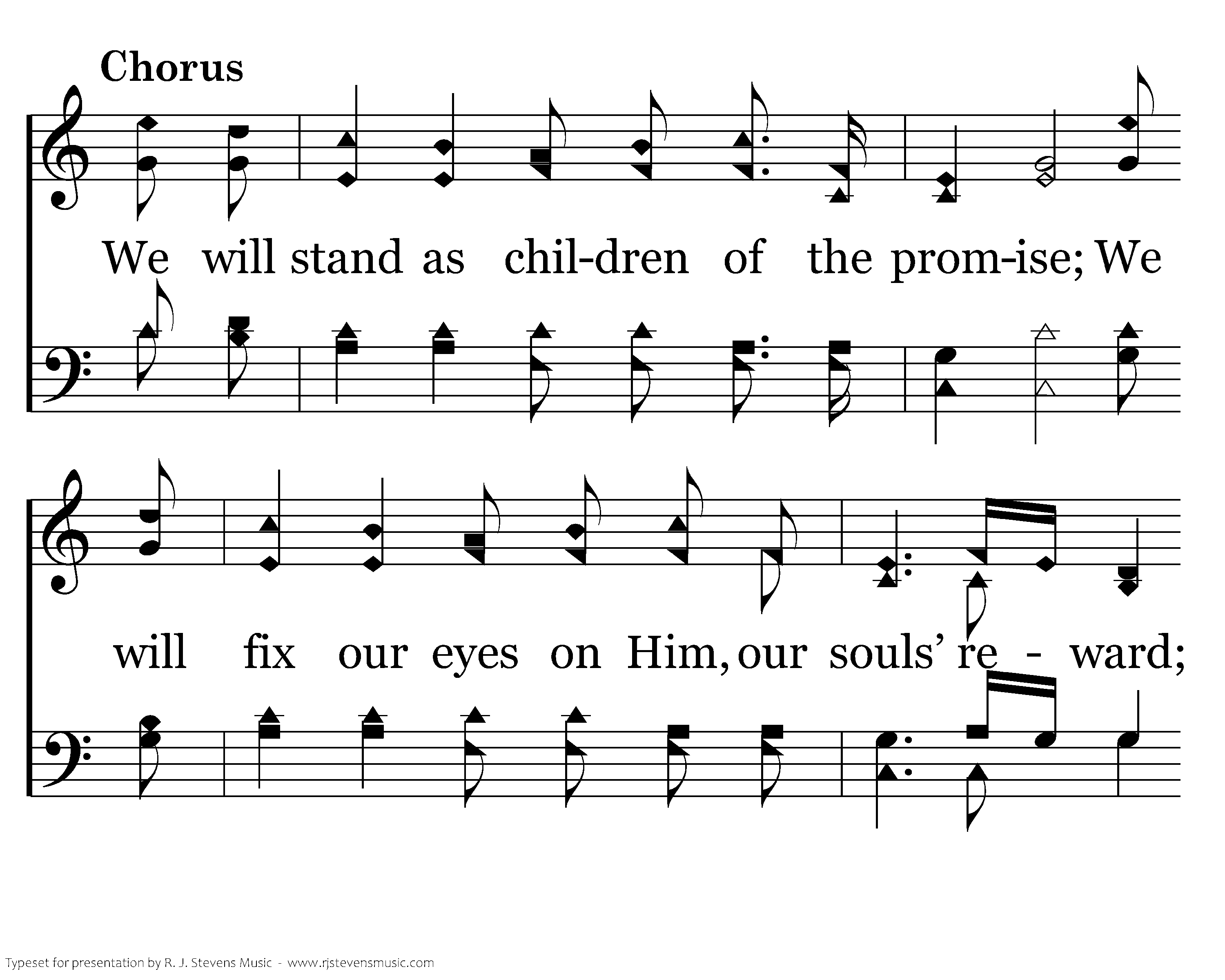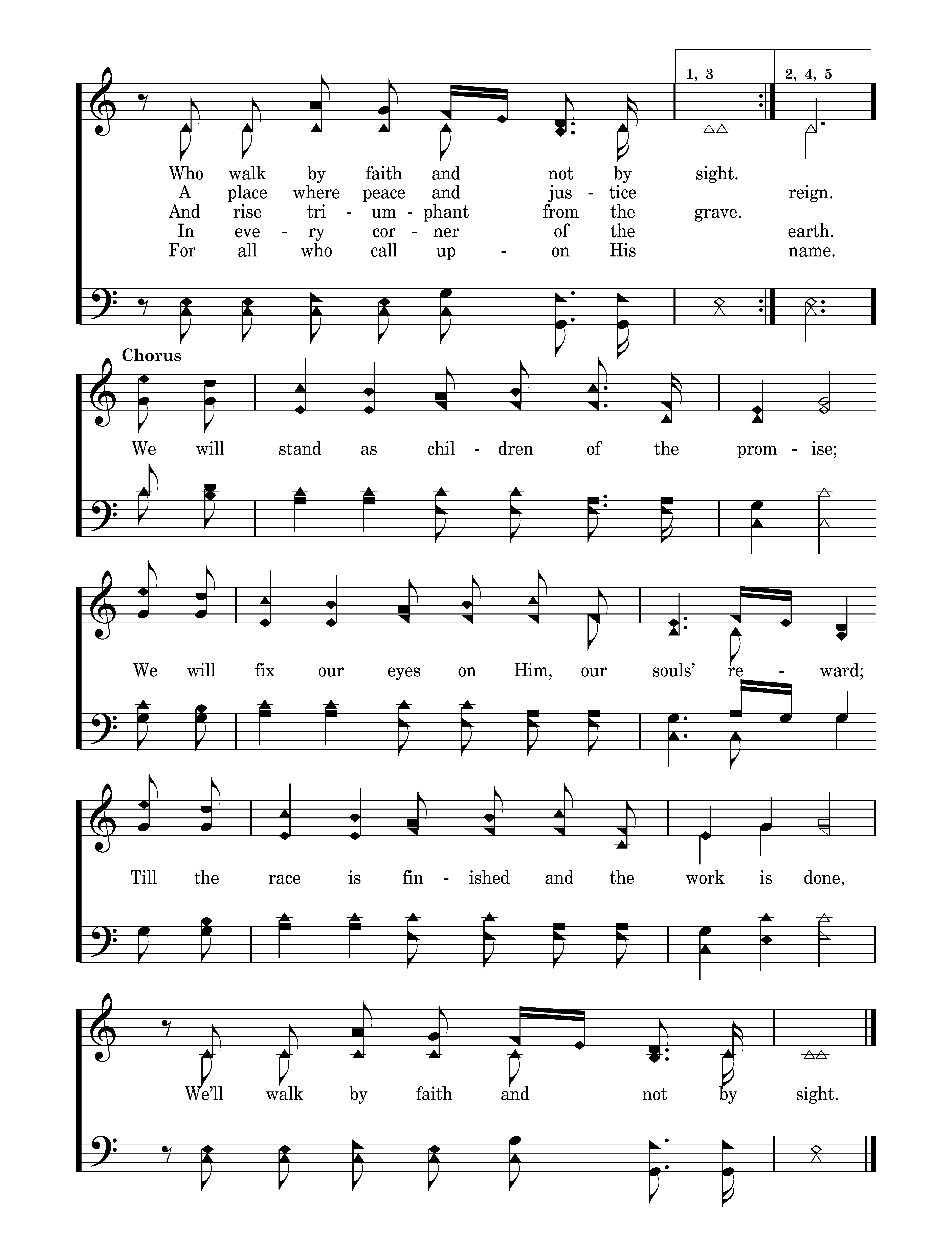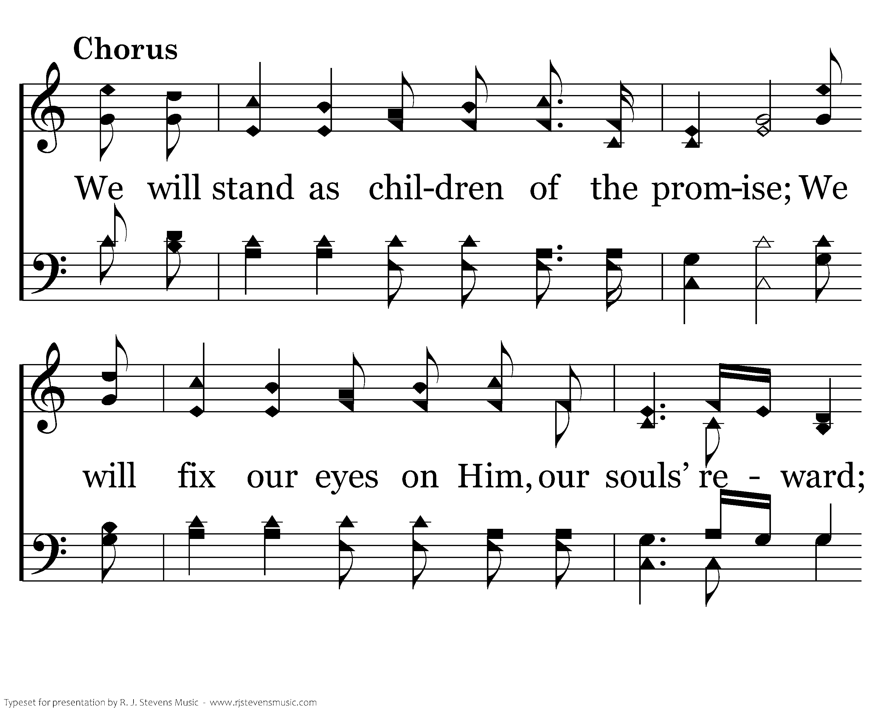 We will stand as children of the promise; We will fix our eyes on Him, our souls’ reward; Till the race is finished and the work is done, We’ll walk by faith and not by sight.