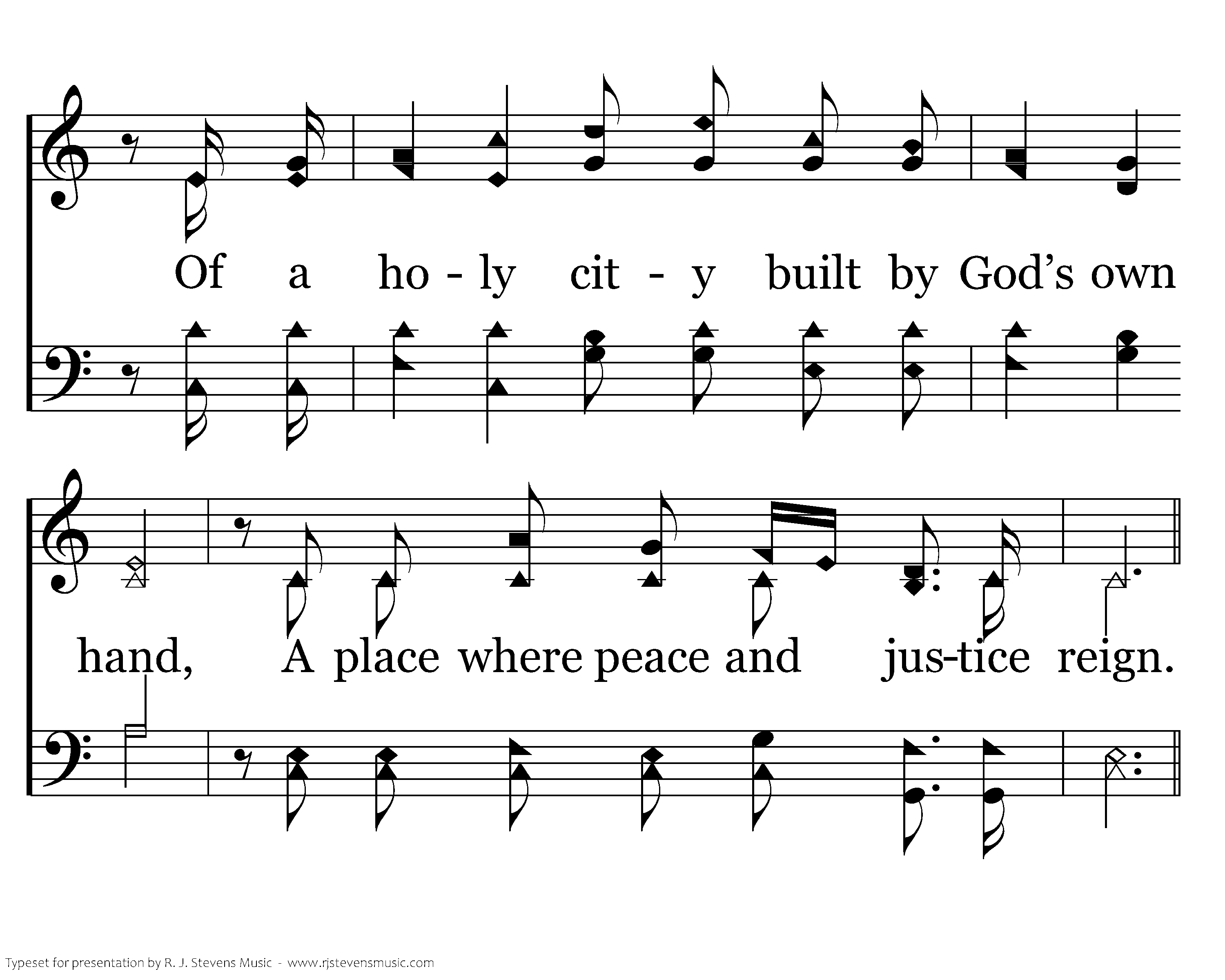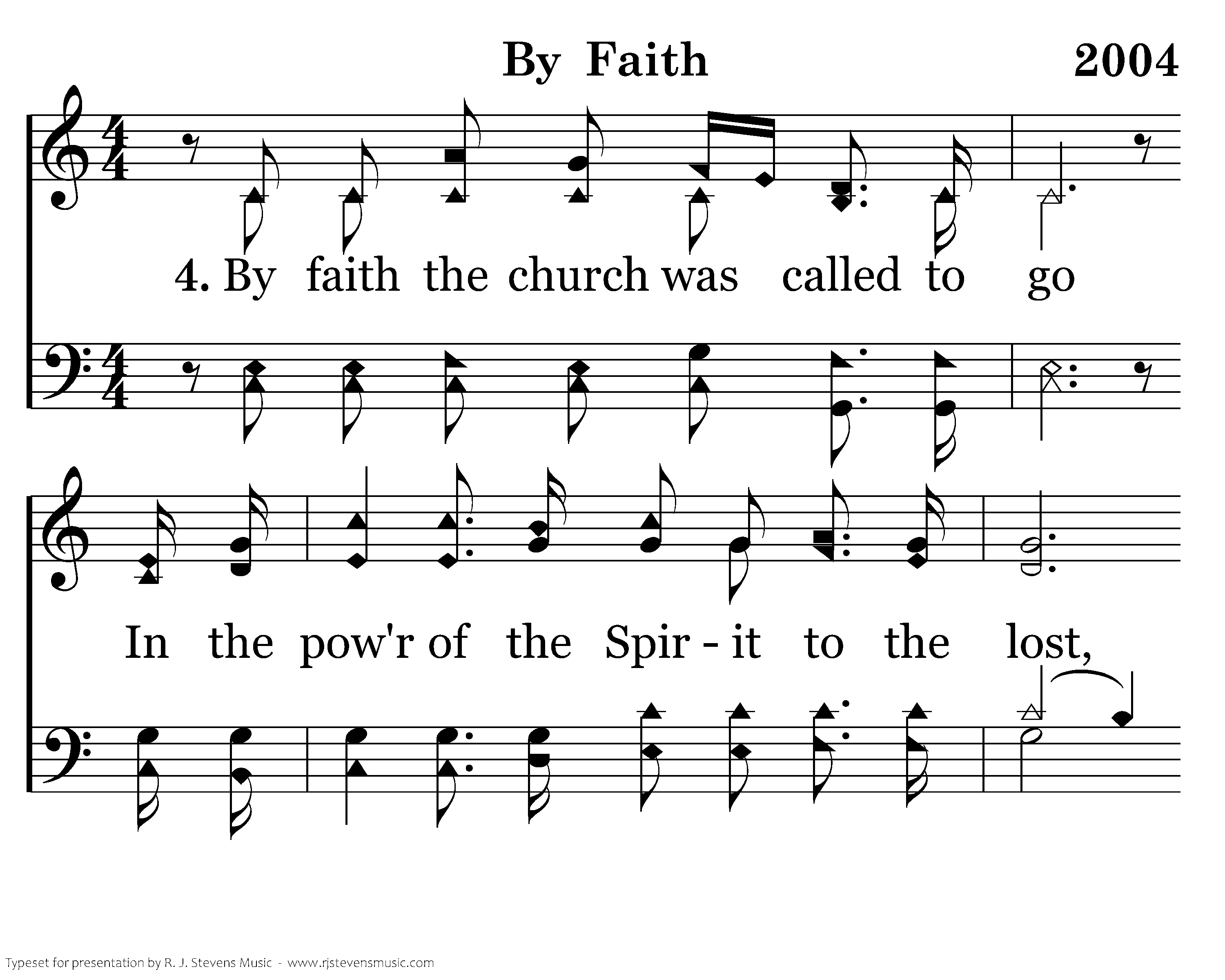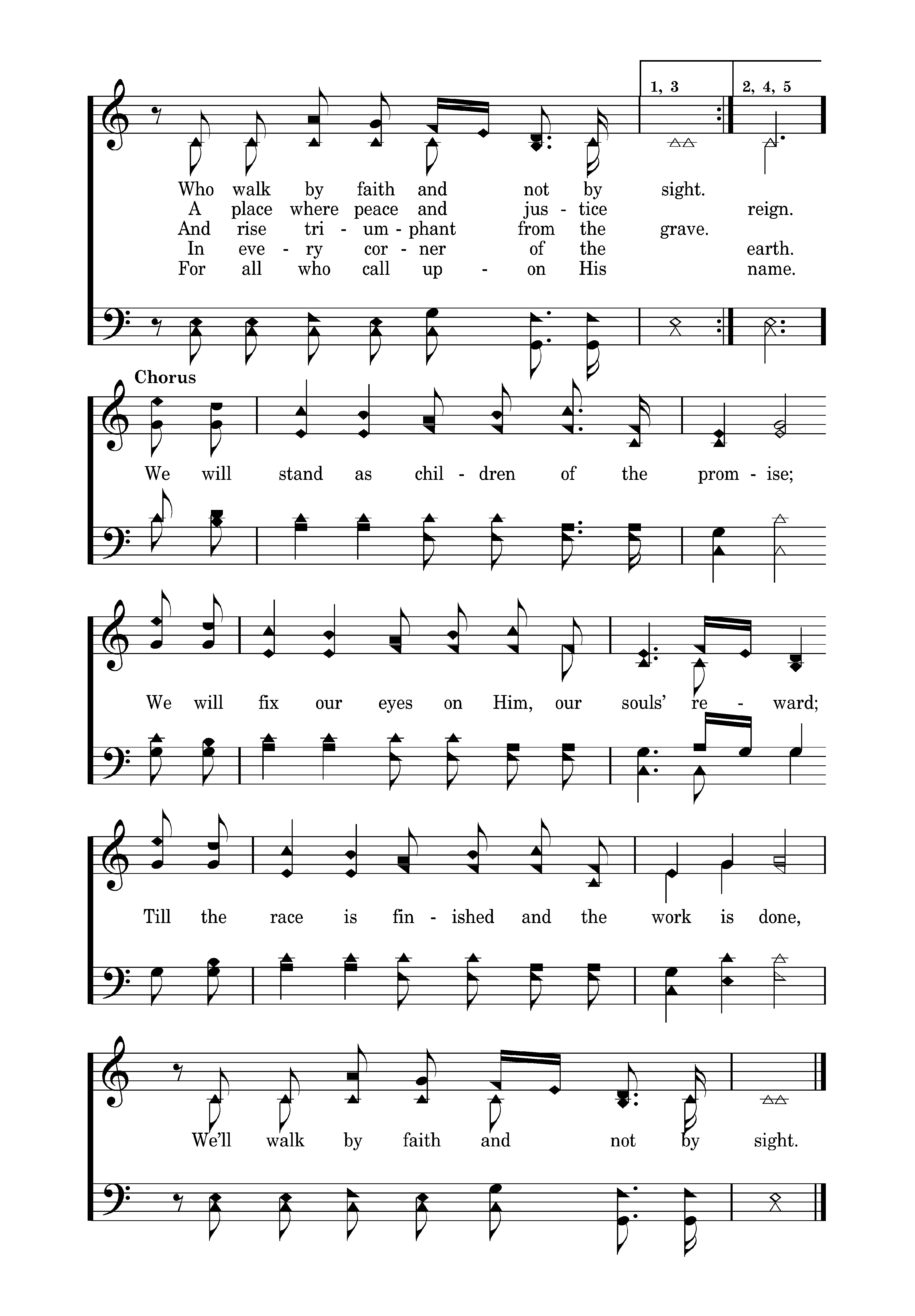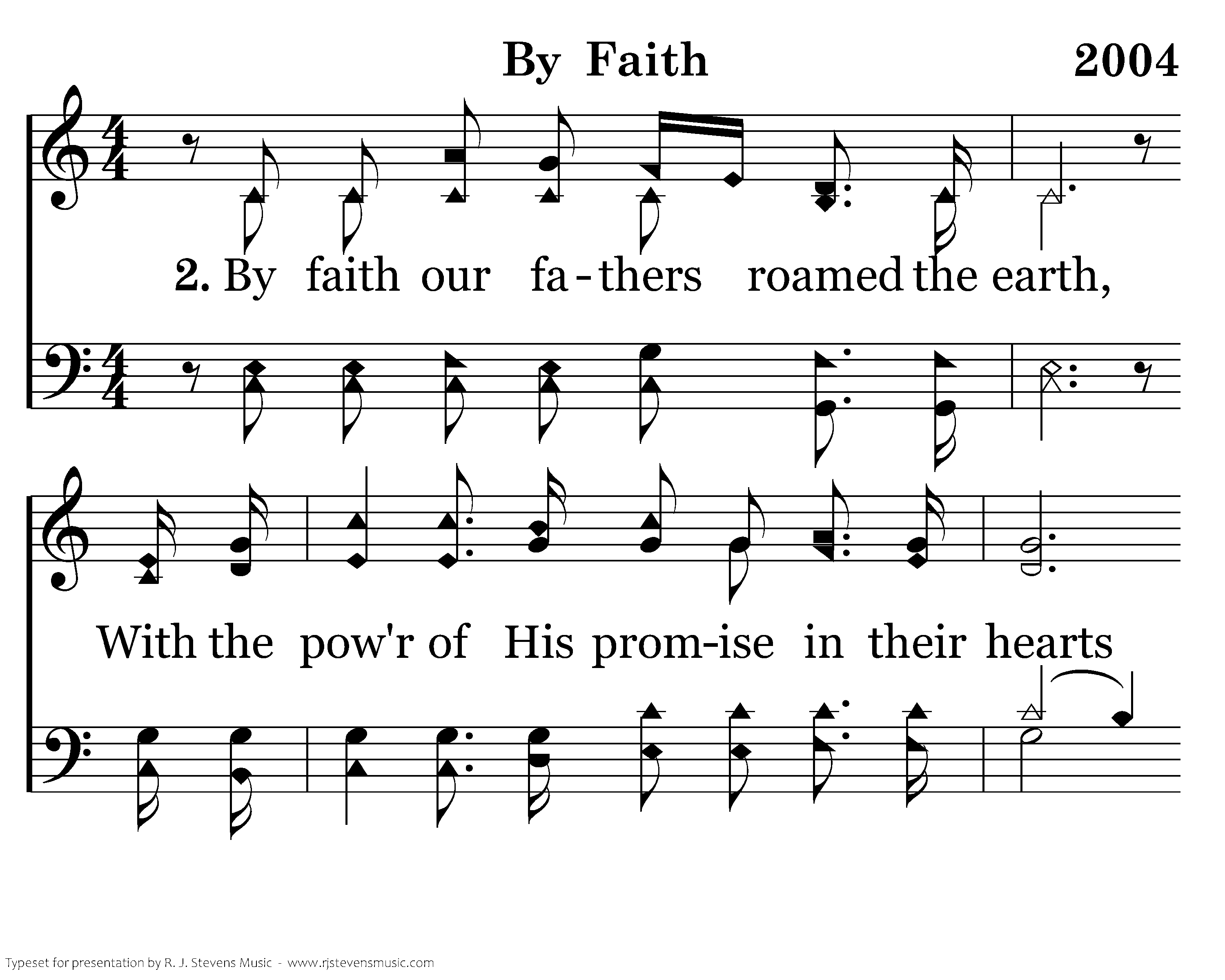 By faith our fathers roamed the earth, With the pow'r of His promise in their hearts Of a holy city built by God’s own hand, A place where peace and justice reign. We will stand as children of the promise; We will fix our eyes on Him, our souls’ reward; Till the race is finished and the work is done, We’ll walk by faith and not