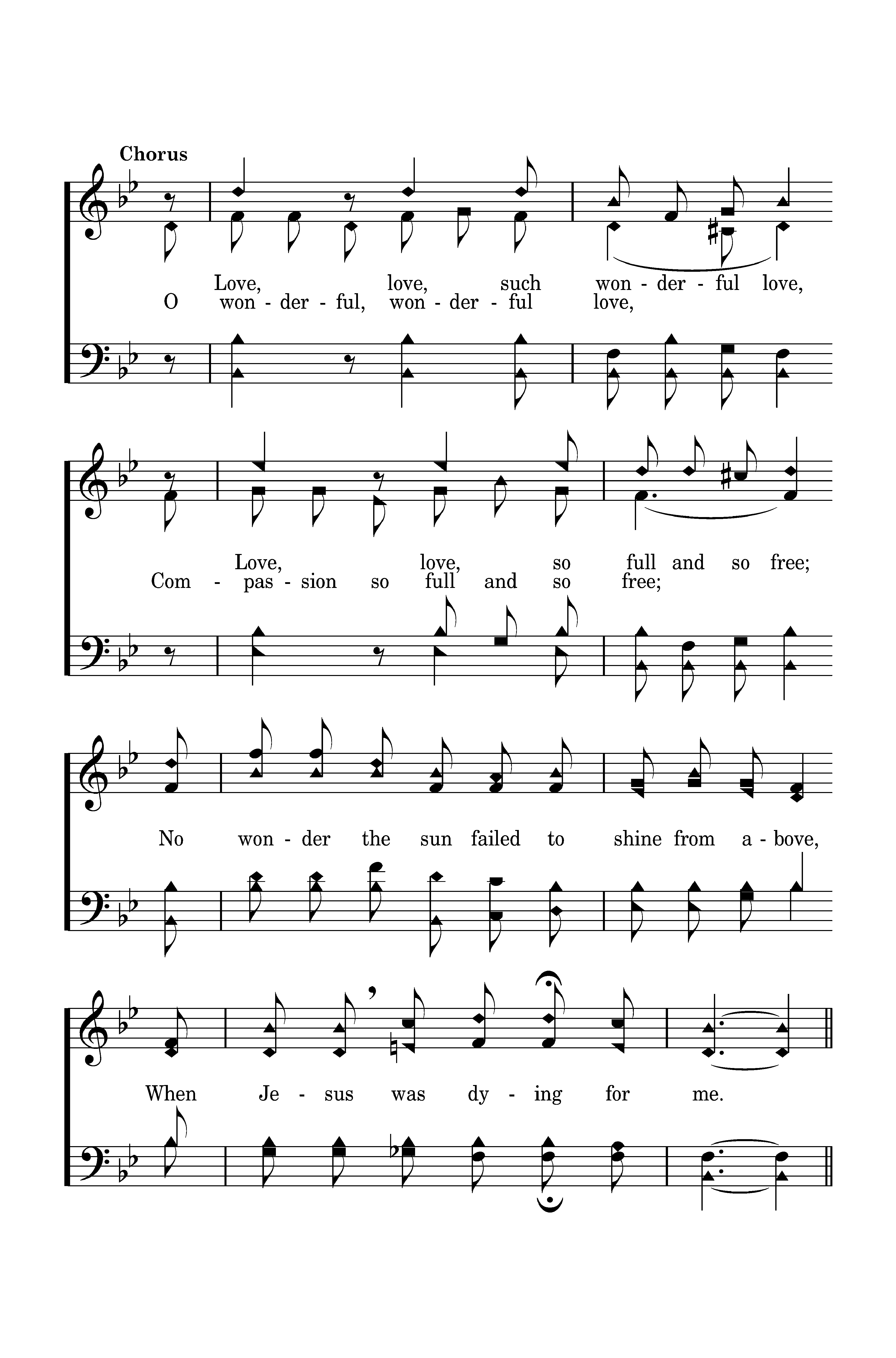 Love, love, such wonderful love, Love, love, so full and so free; No wonder the sun failed to shine from above, When Jesus was dying for me.