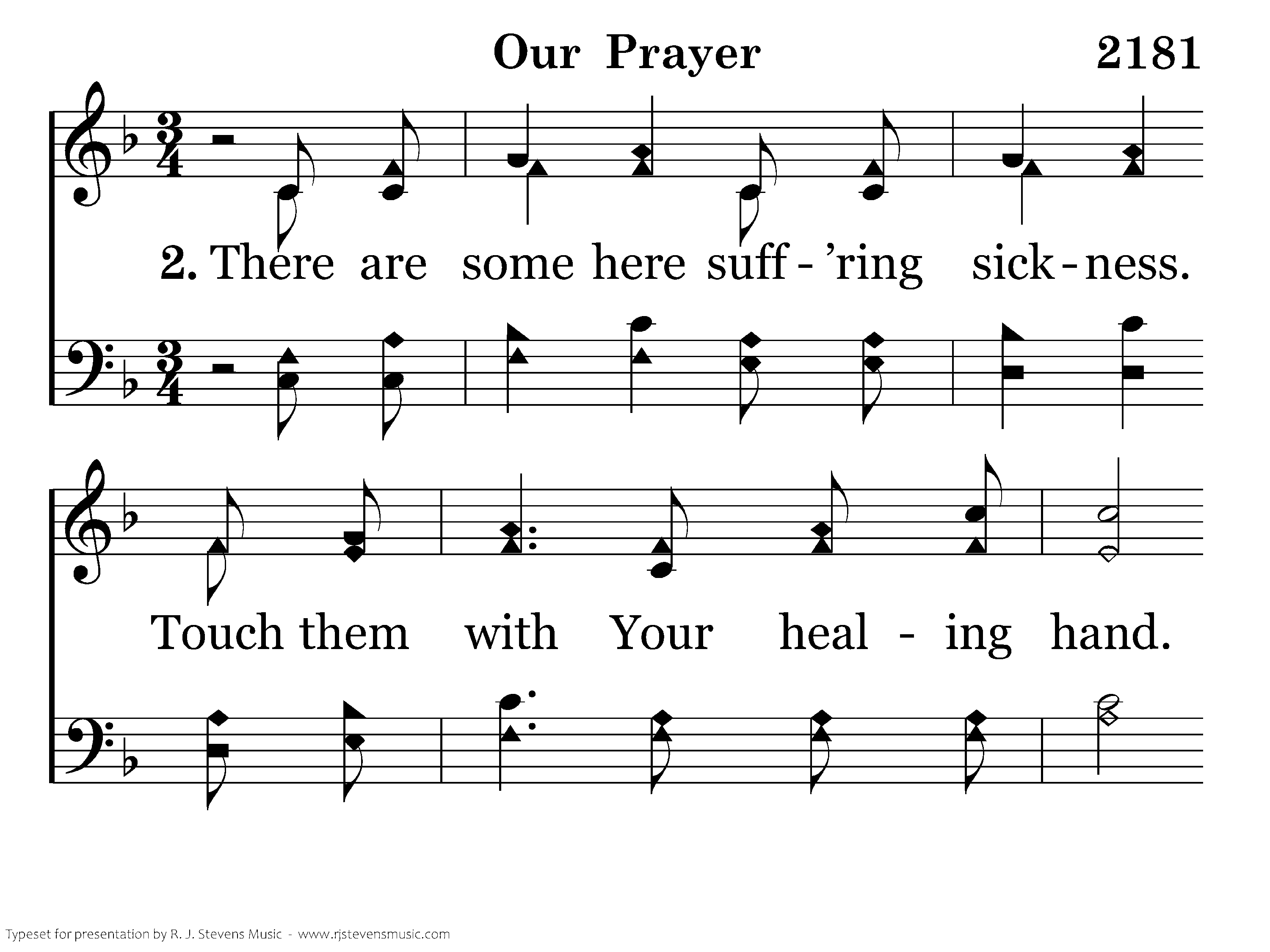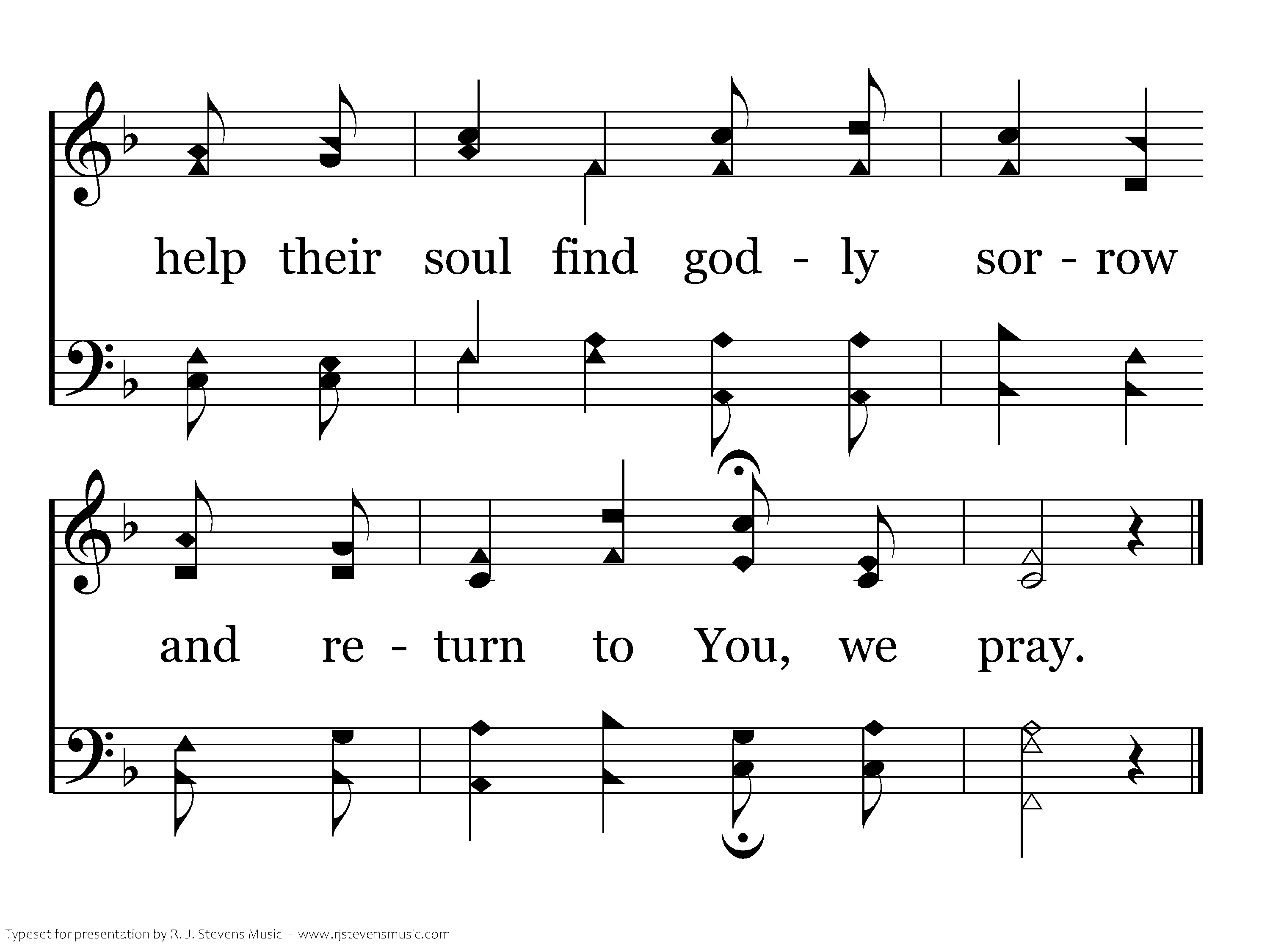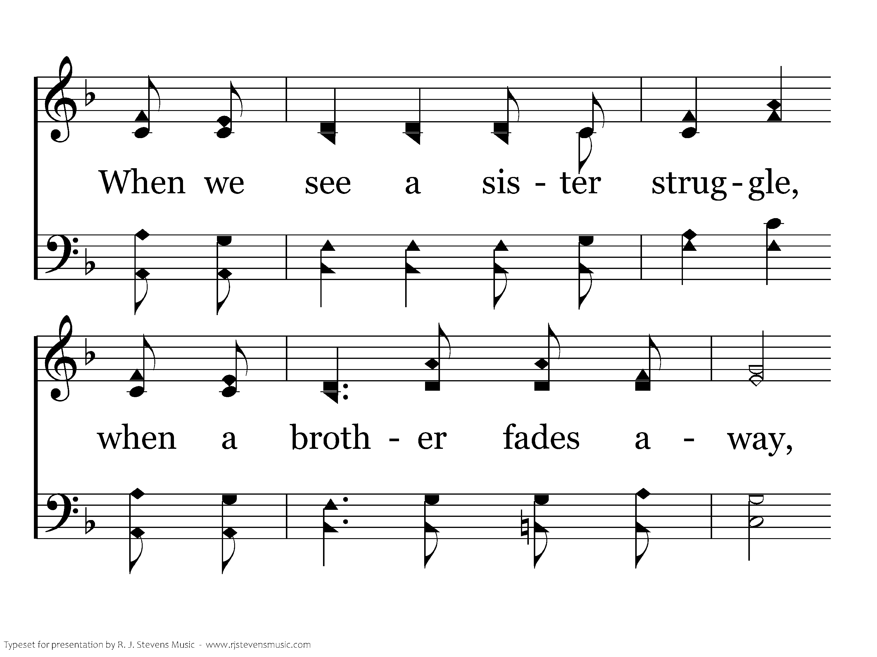 There are some here suff’ring sickness. Touch them with Your healing hand. Others may be broken-hearted. Give them strength in You to stand. When we see a sister struggle, when a brother fades away, help their soul find godly sorrow and return to You, we pray.