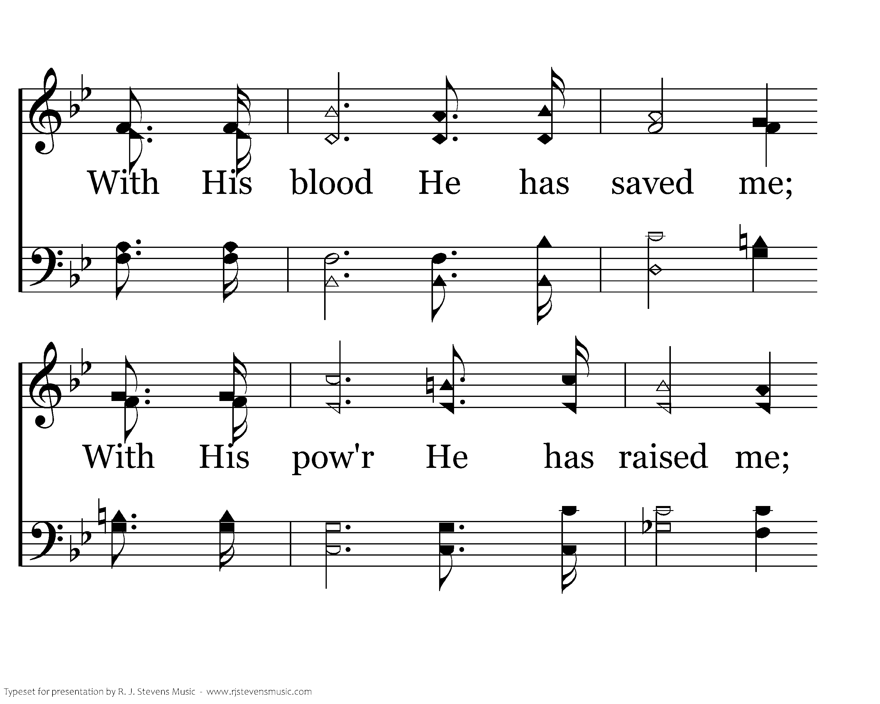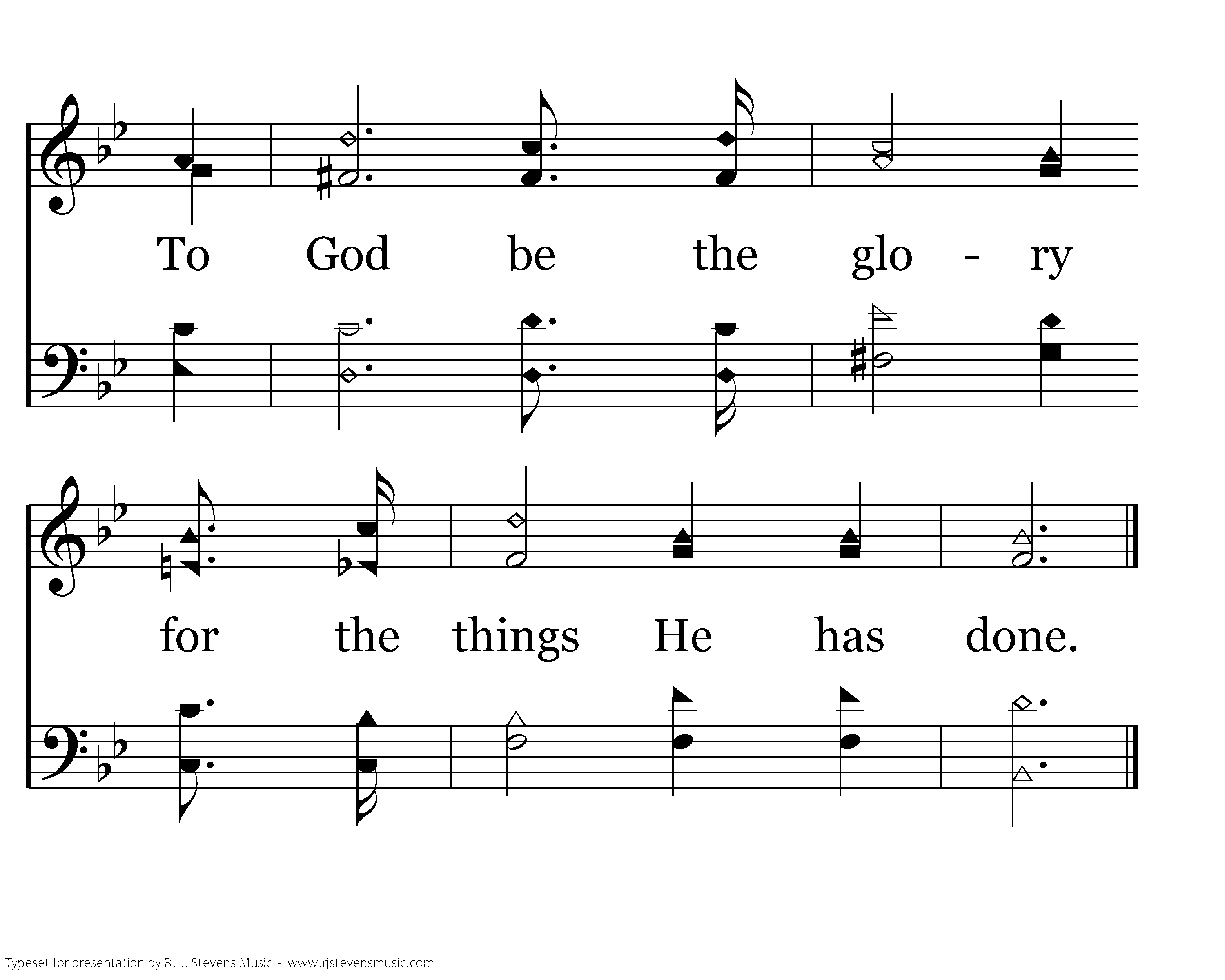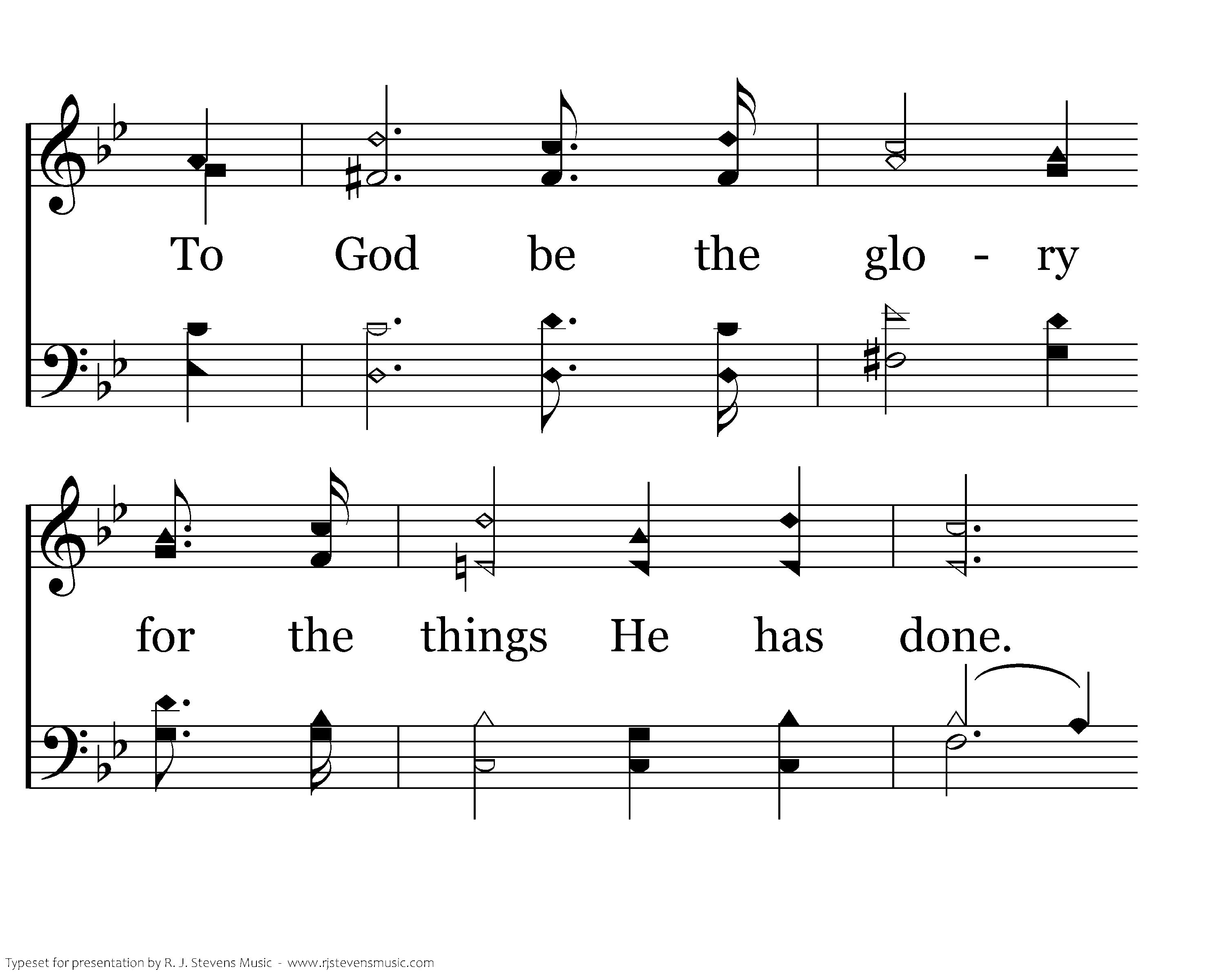 To God be the glory, to God be the glory, To God be the glory for the things He has done. With His blood He has saved me; With His pow'r He has raised me; To God be the glory for the things He has done.