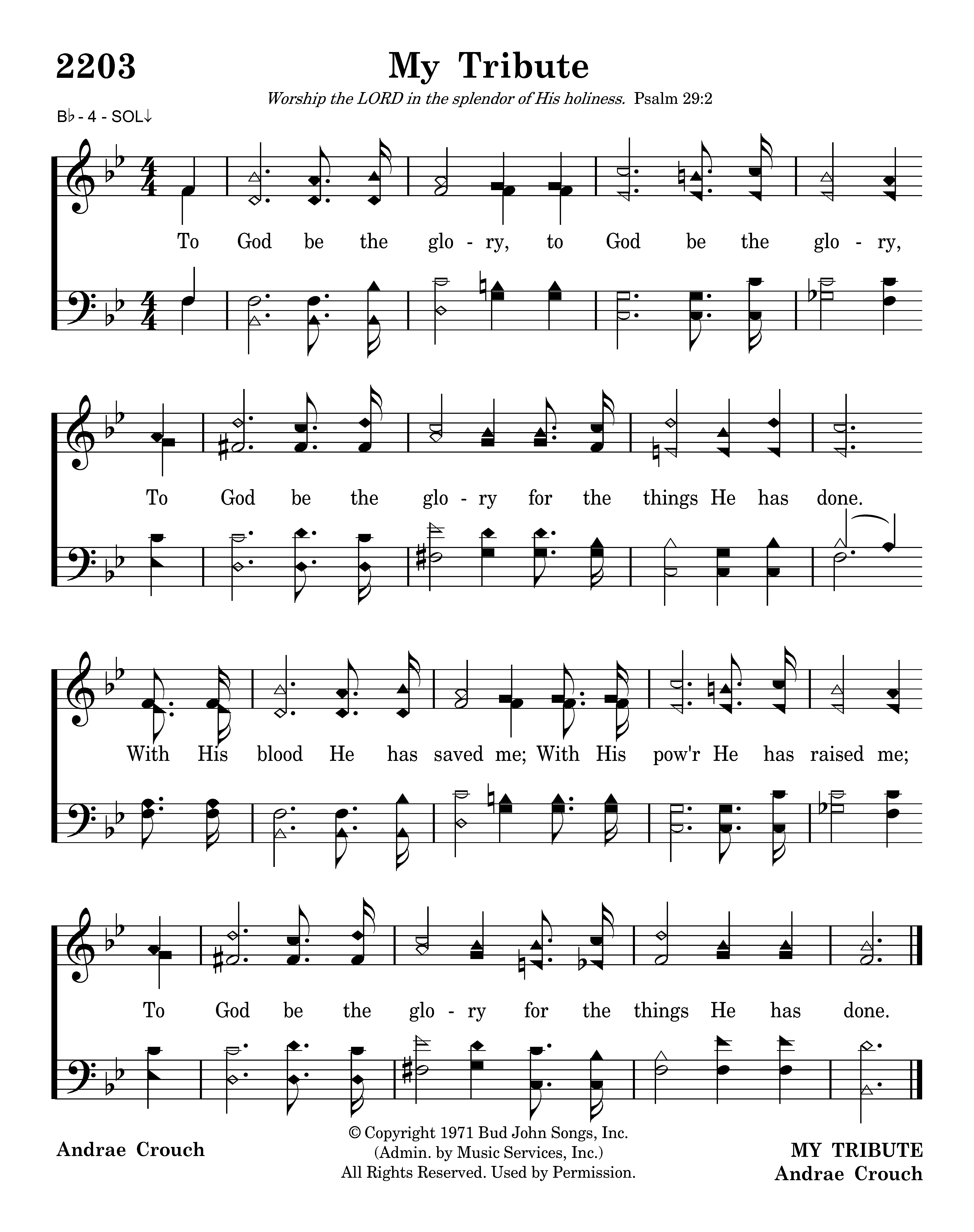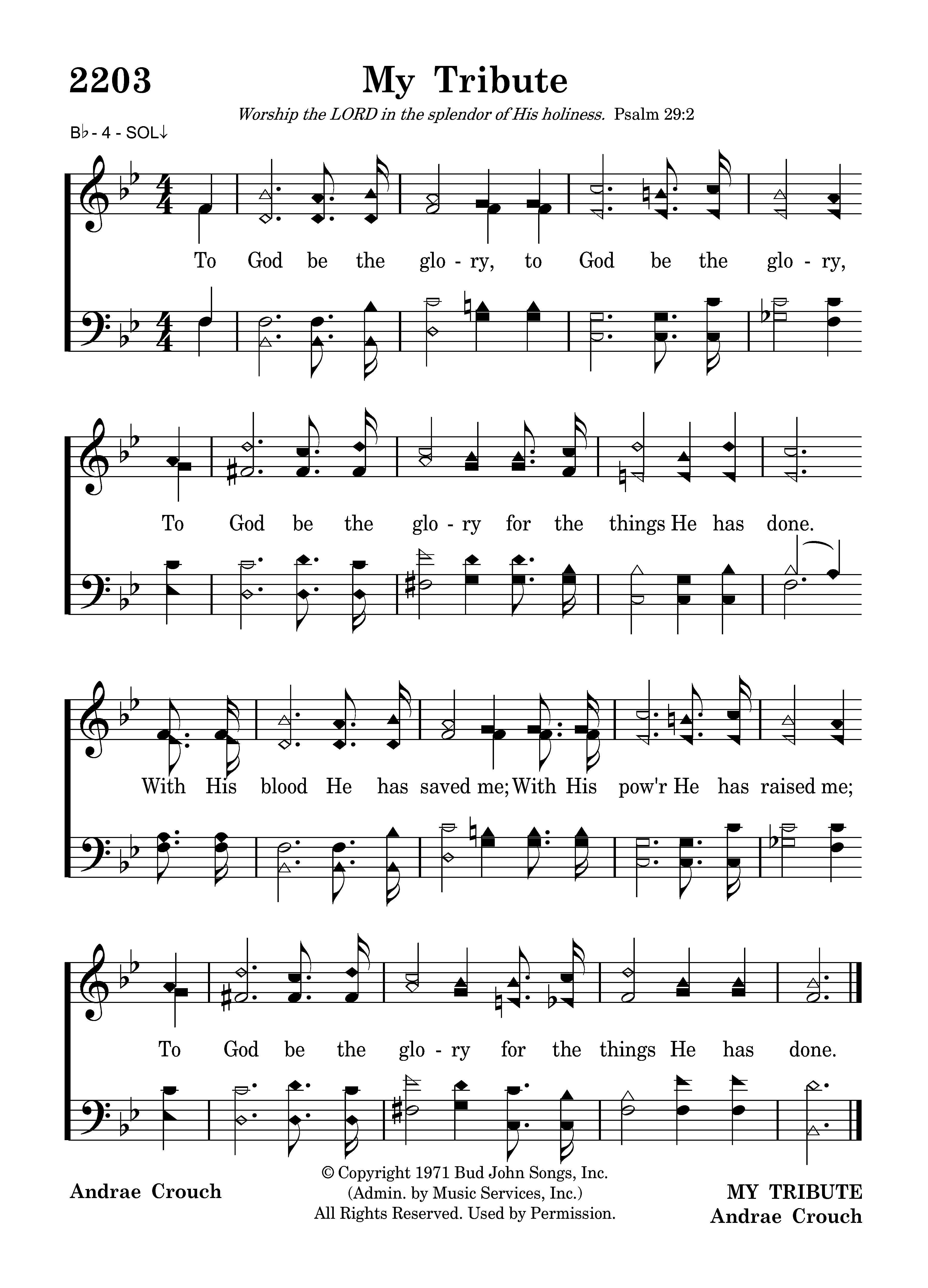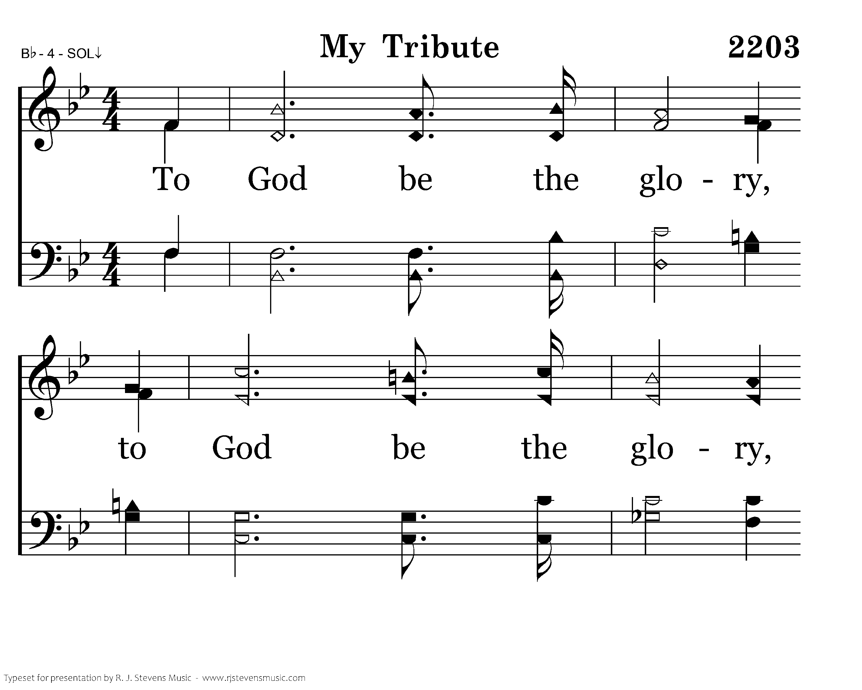 To God be the glory, to God be the glory, To God be the glory for the things He has done. With His blood He has saved me; With His pow'r He has raised me; To God be the glory for the things He has done.