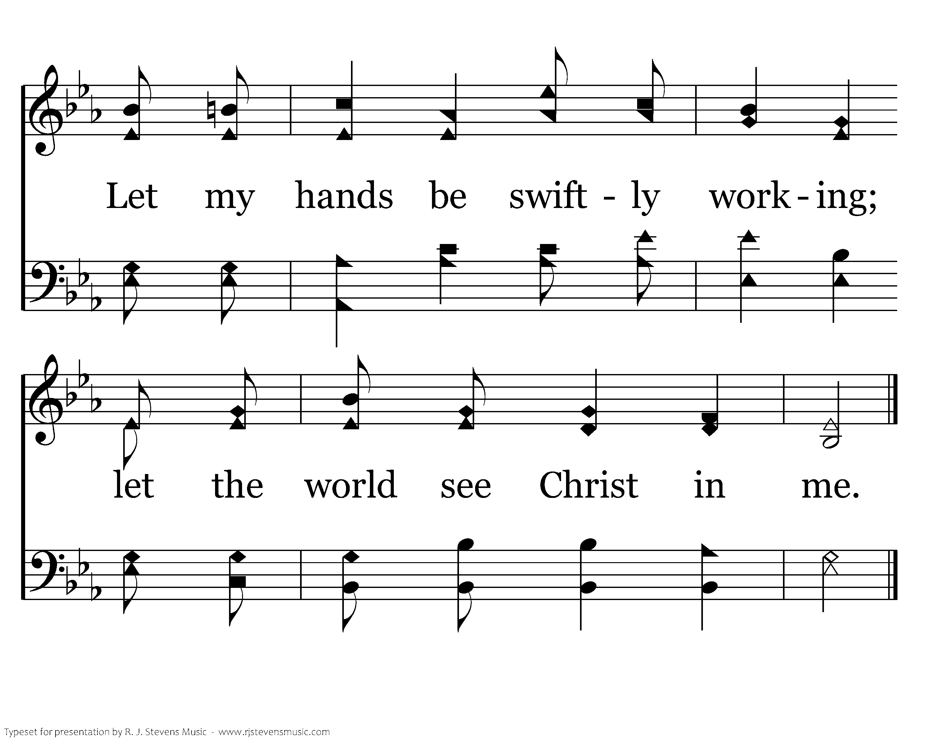 Father free my life of darkness; make it be a light for Thee. Let my hands be swiftly working; let the world see Christ in me.