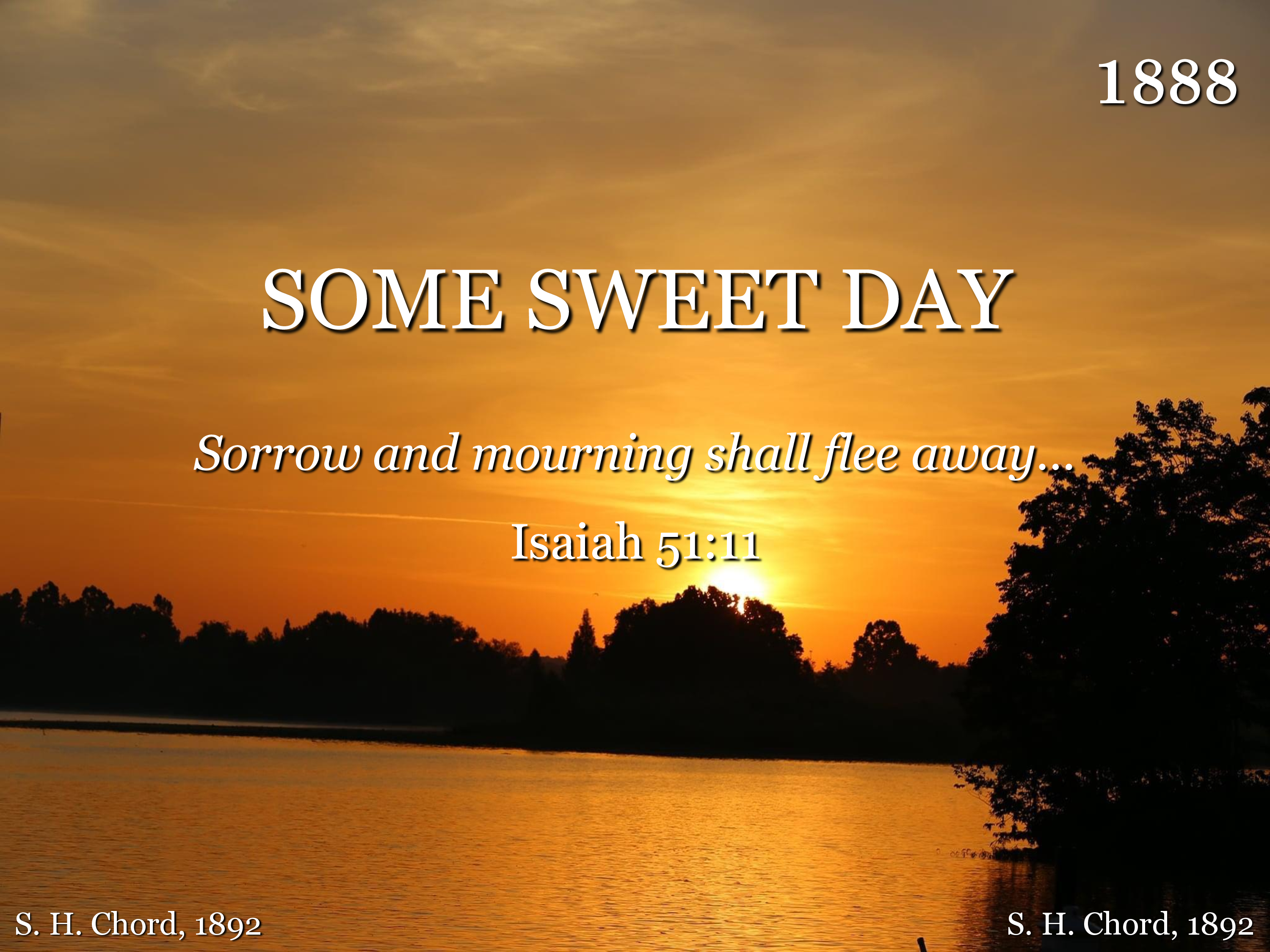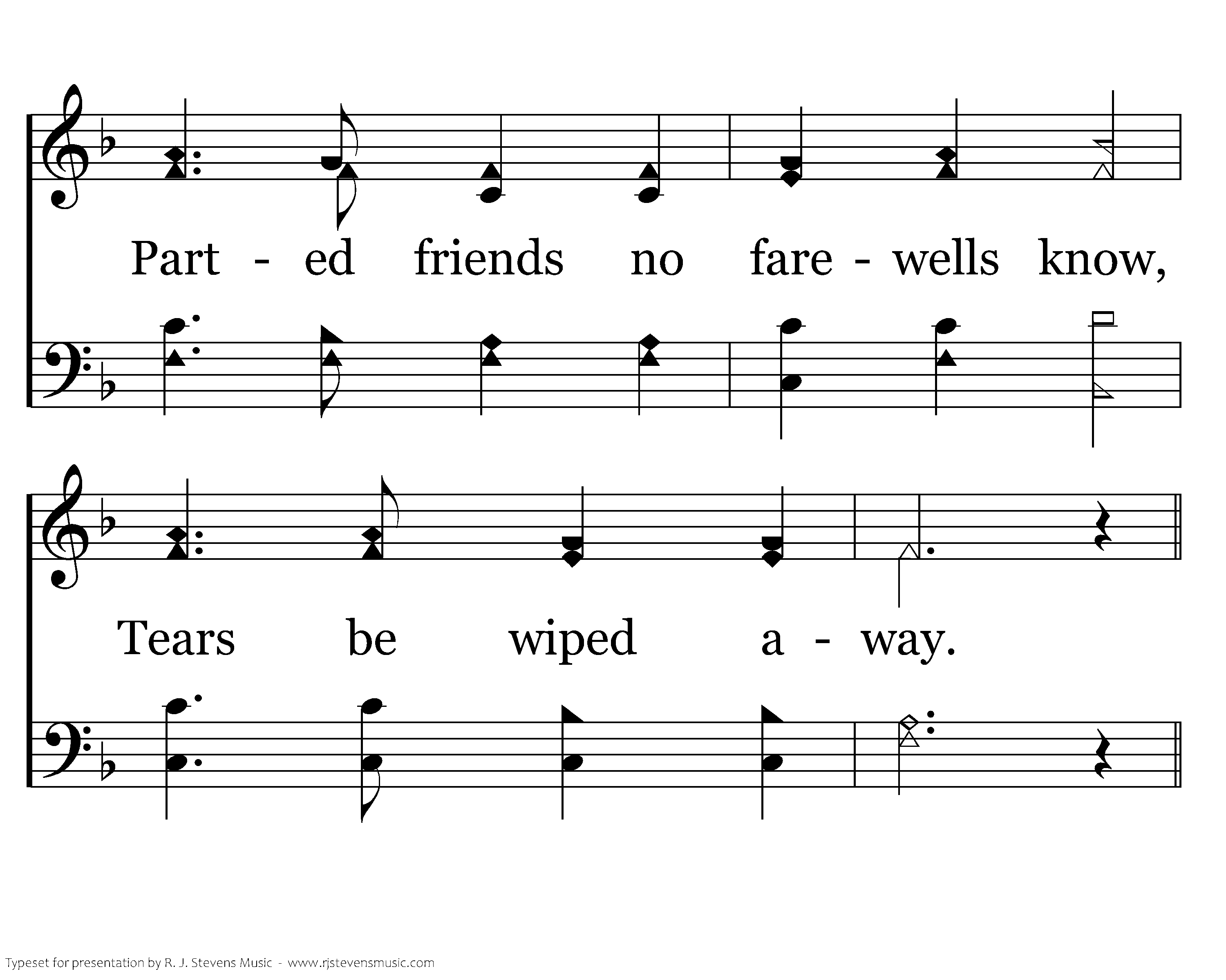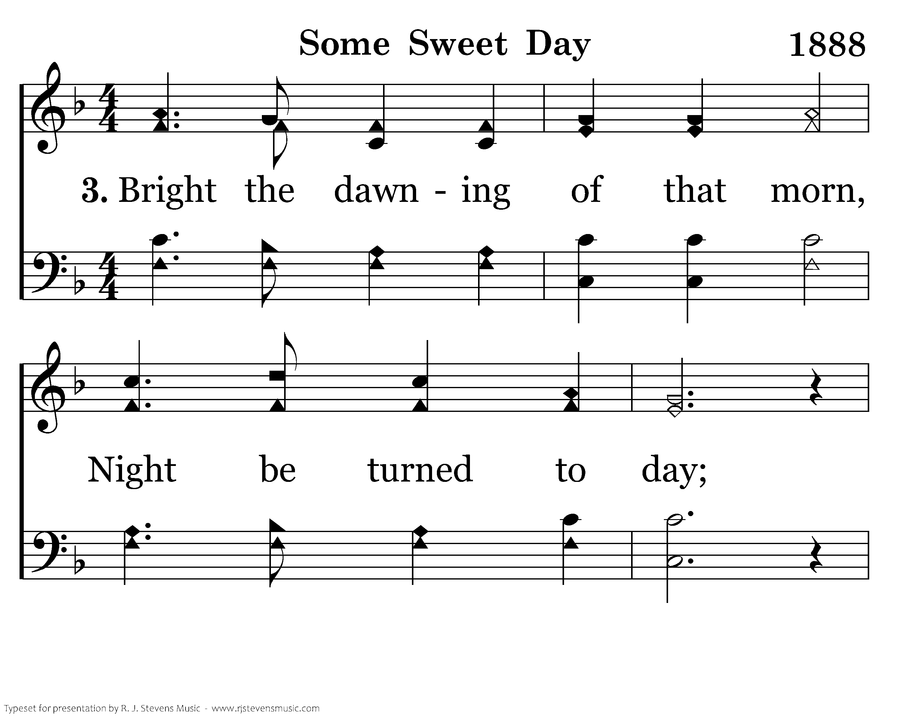 Bright the dawning of that morn, Night be turned to day; Parted friends no farewells know, Tears be wiped away.