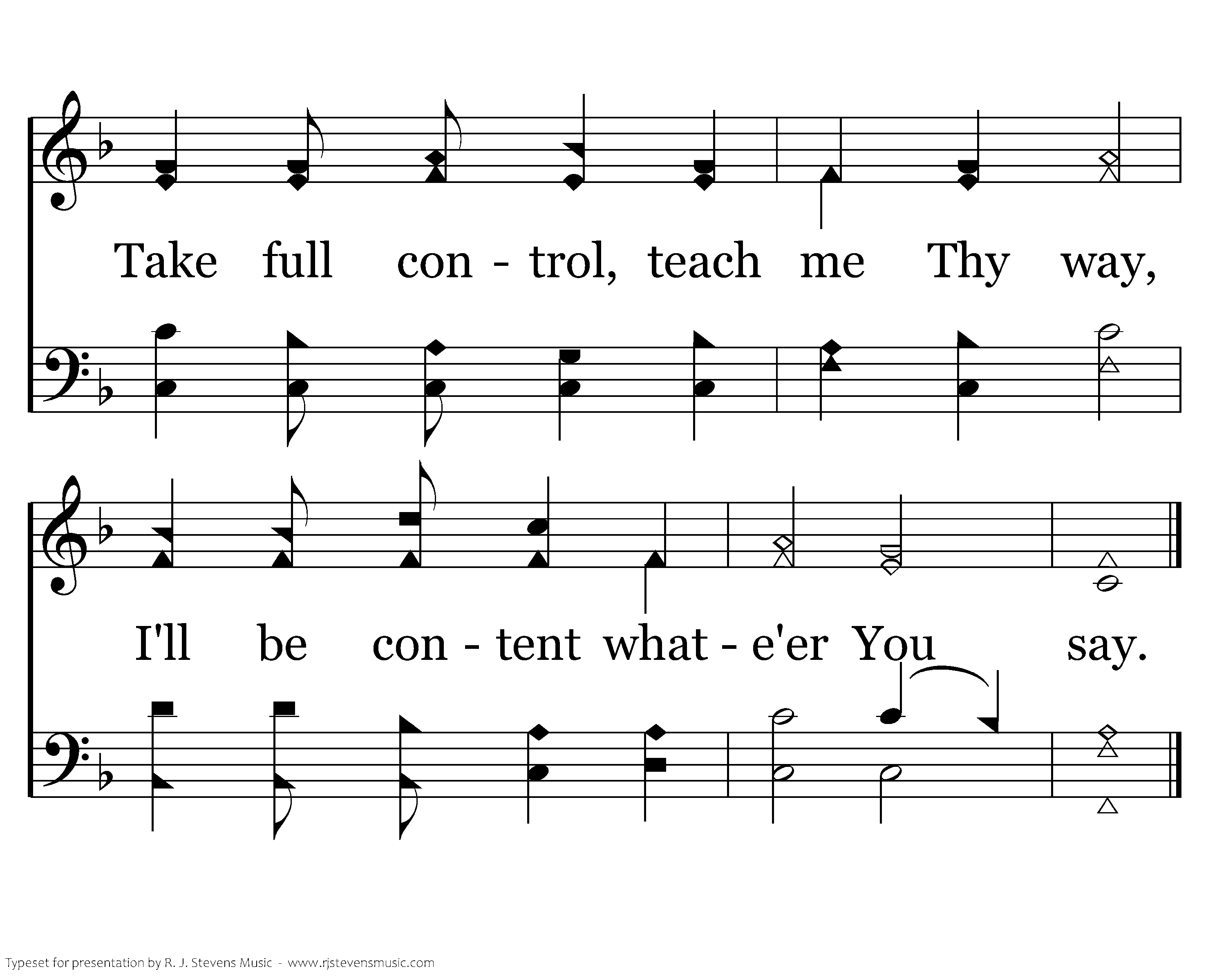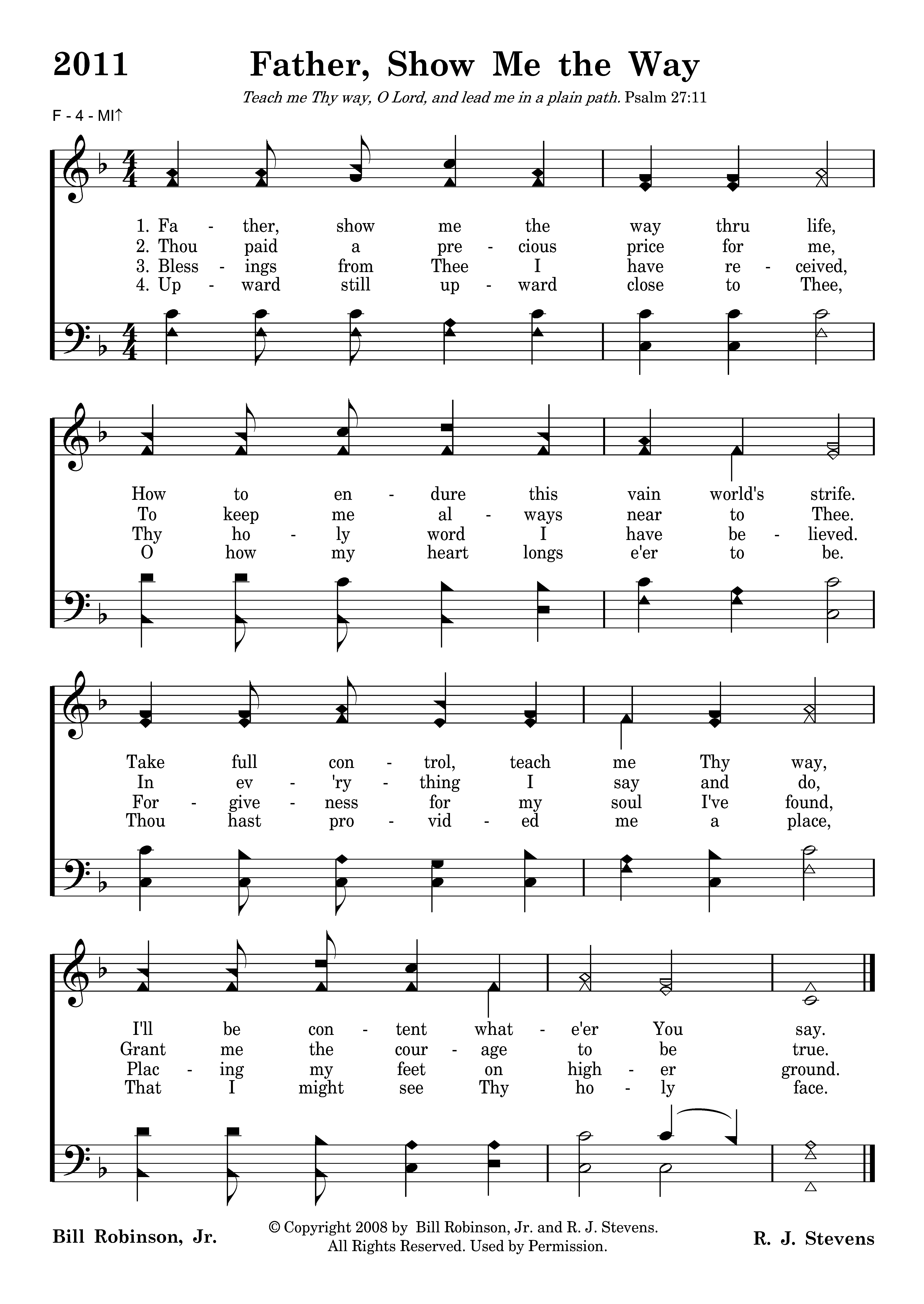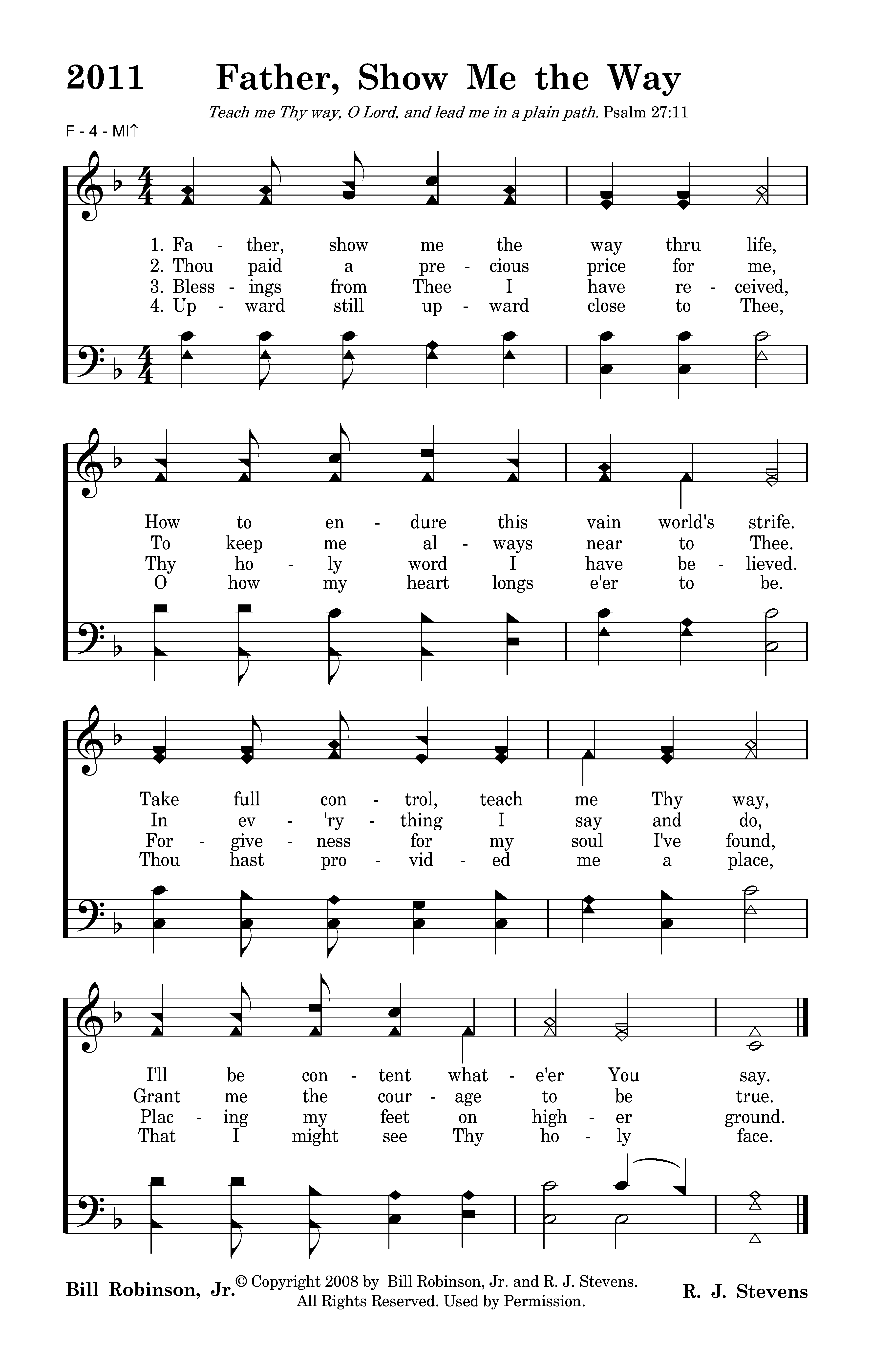 Father, show me the way thru life, How to endure this vain world's strife. Take full control, teach me Thy way, I'll be content whate'er You say.