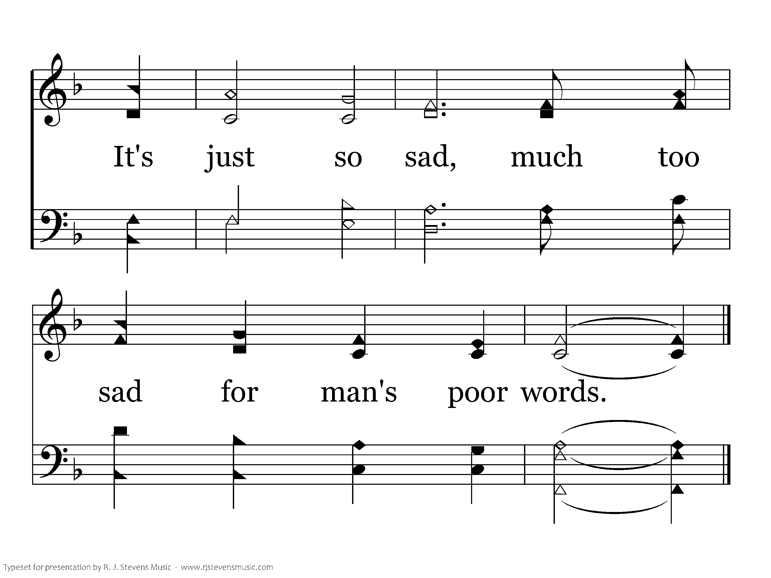 Look at His head, feel the stinging of the thorns, Those bloody stripes, awful terror of the scourge. His outstretched hands; piercing anguish from those nails, It's just so sad, much too sad for man's poor words.