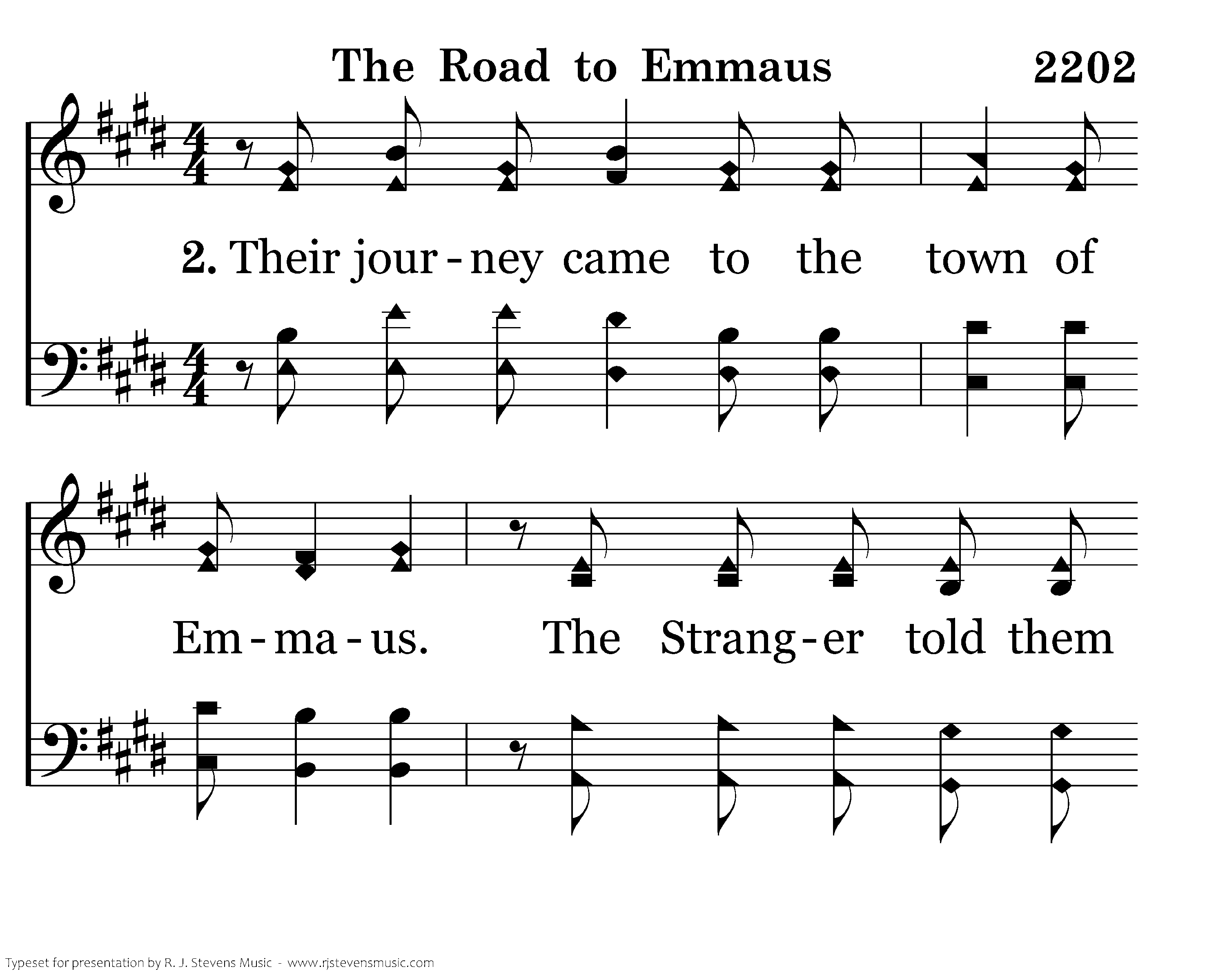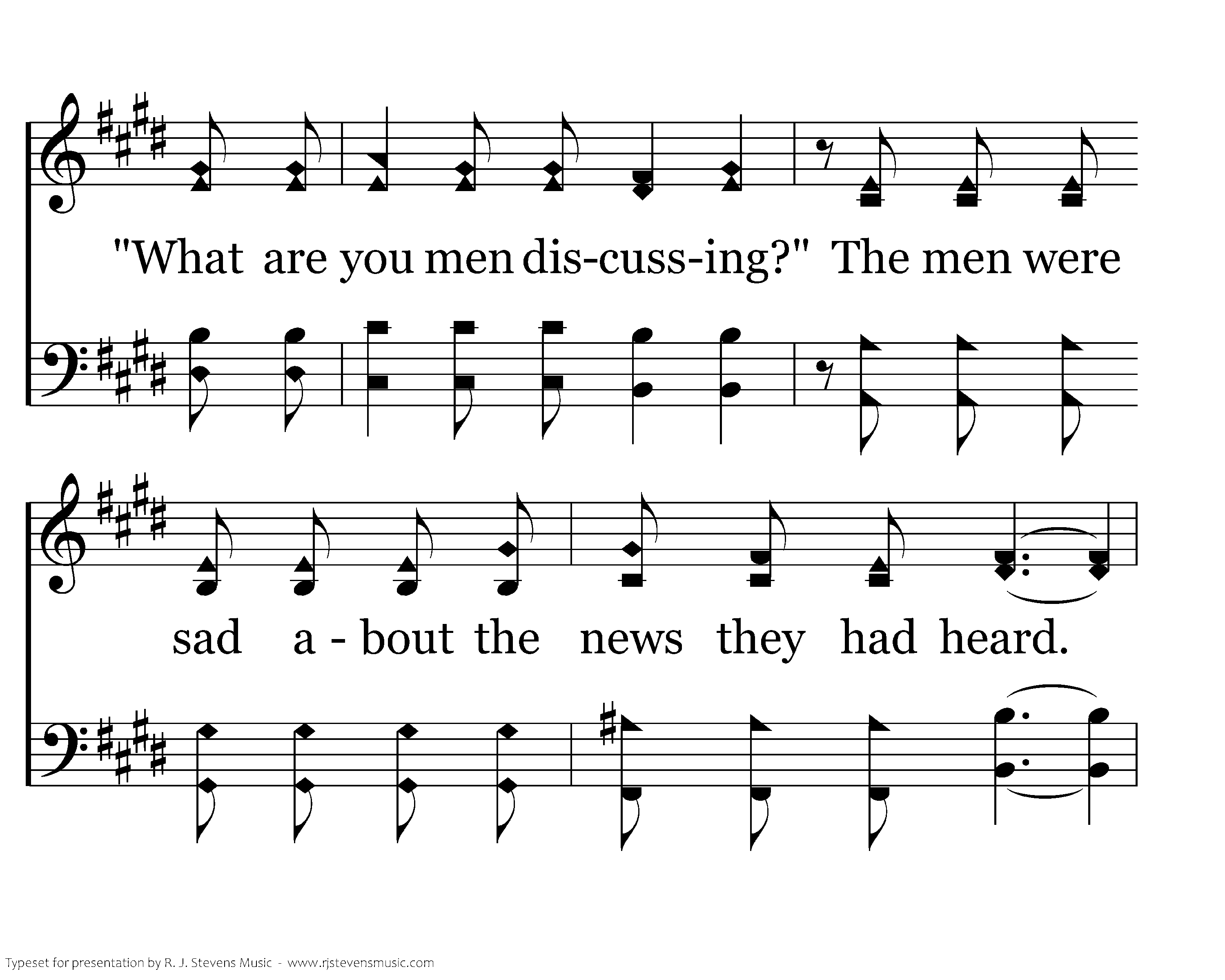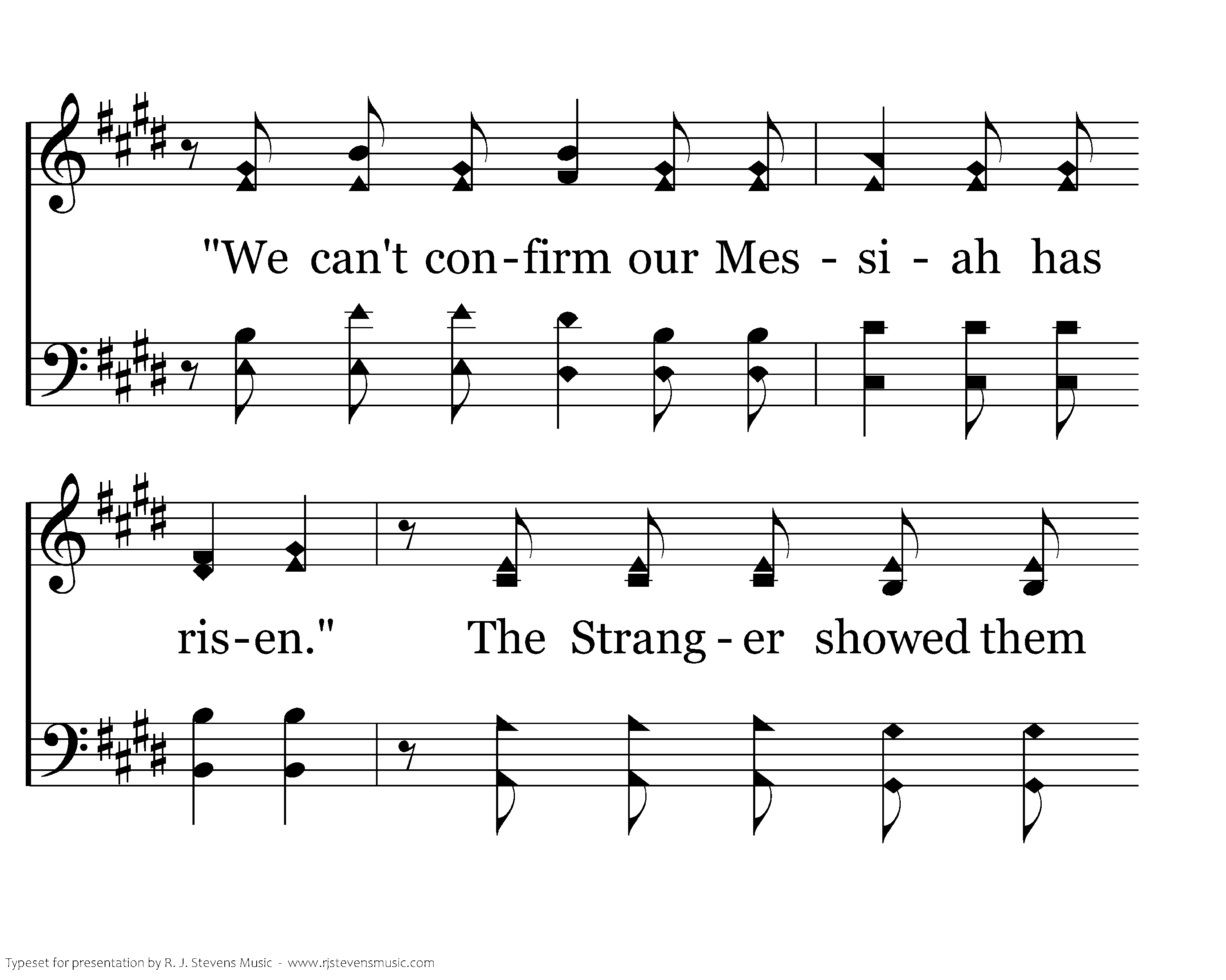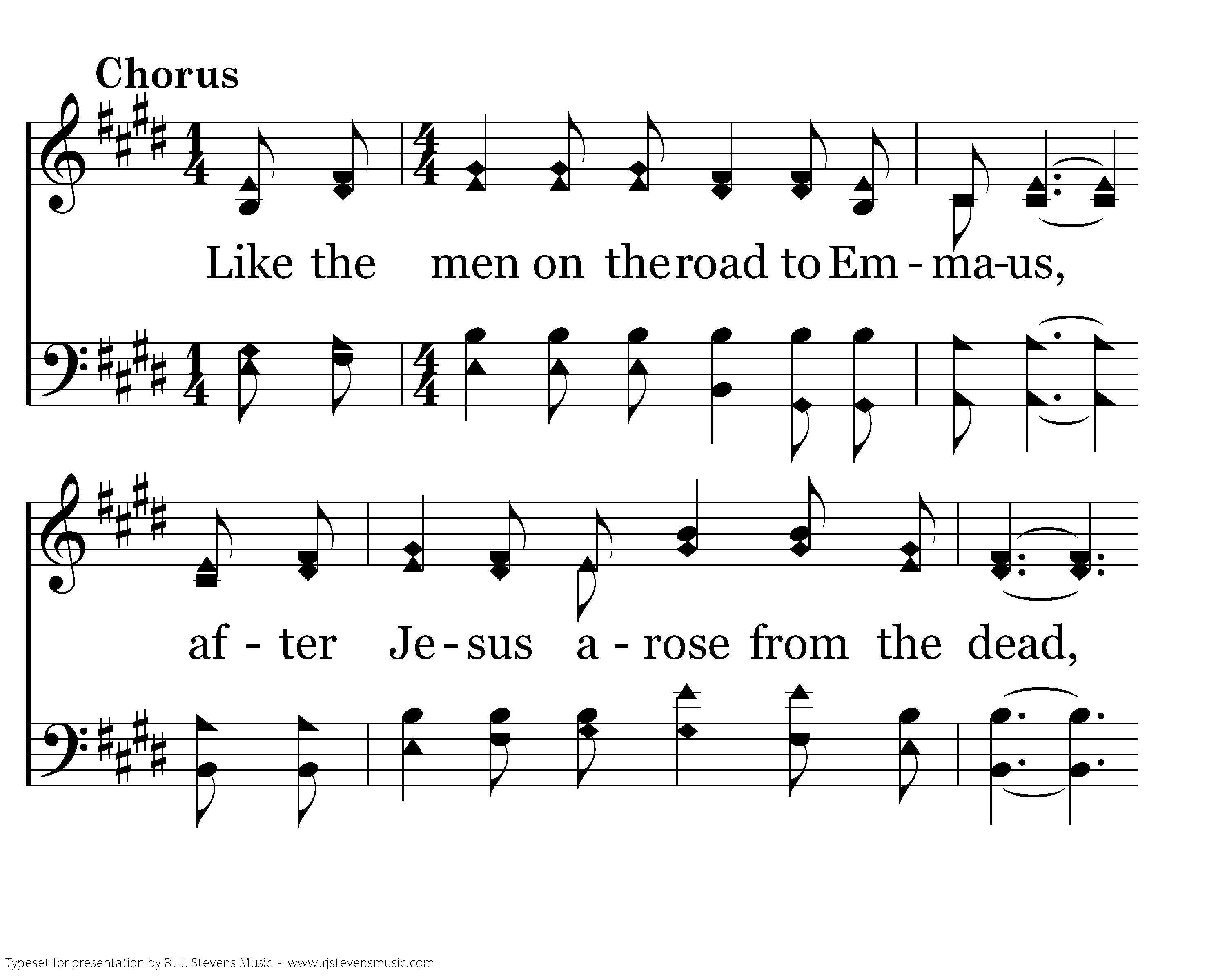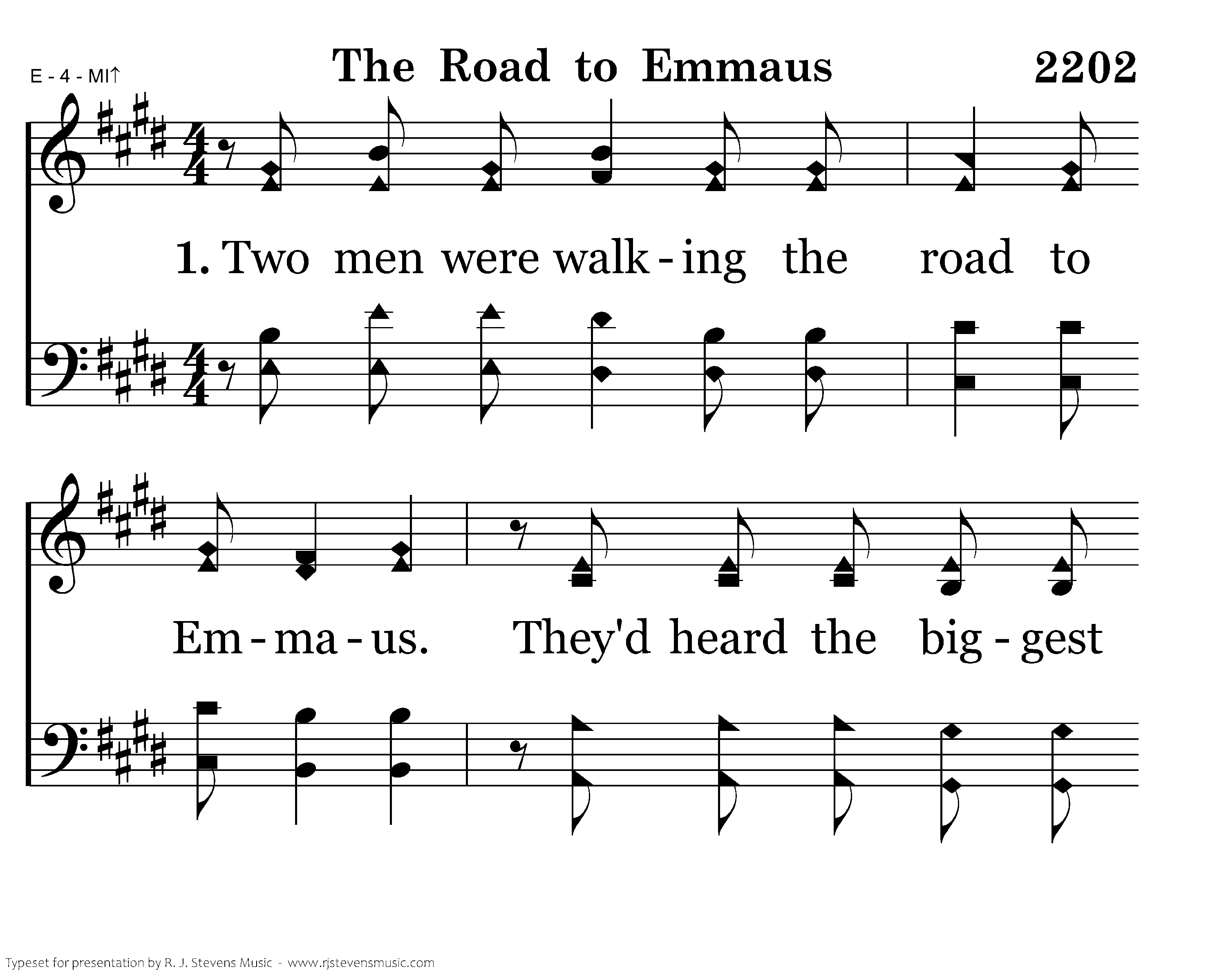 Two men were walking the road to Emmaus. They'd heard the biggest thing the world's ever seen. The Jews' Messiah had come to save Israel, At least they thought He was the one to redeem. A Stranger came, "What are you men discussing?" The men were sad about the news they had heard. "We can't confirm our Messiah has risen." The Stranger showed them from His Holy Word.
