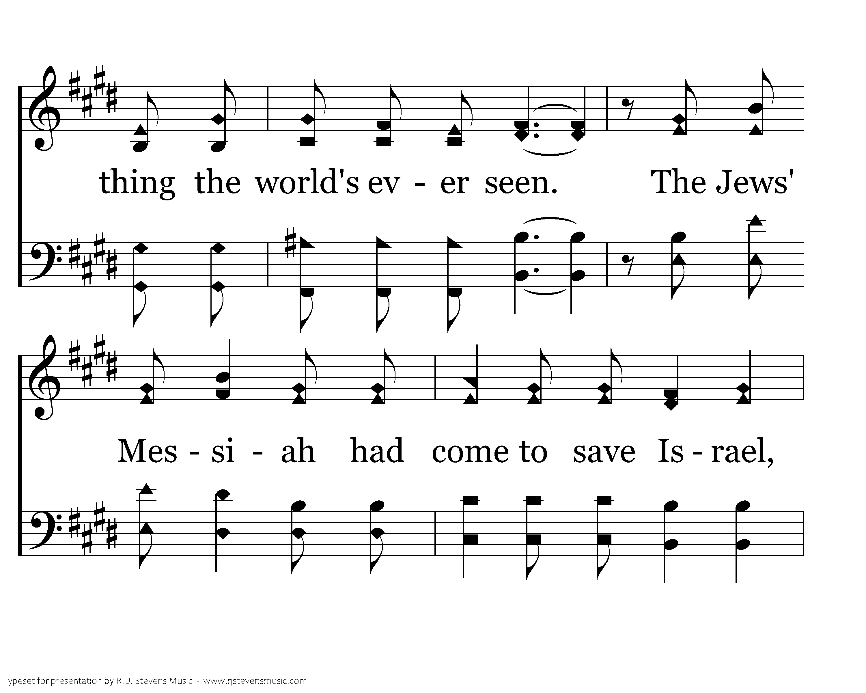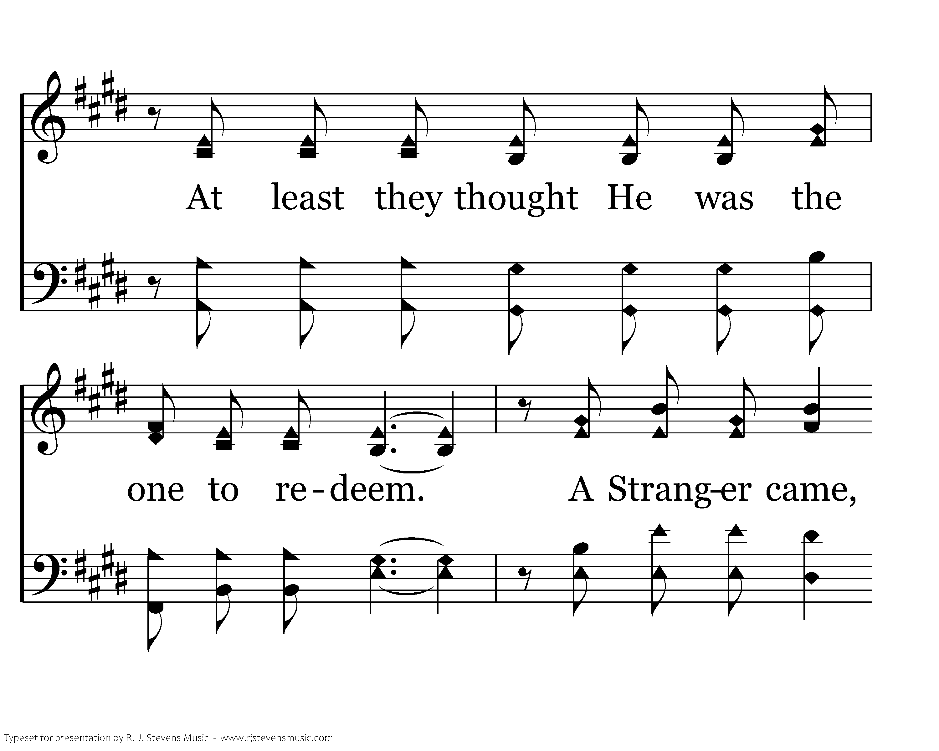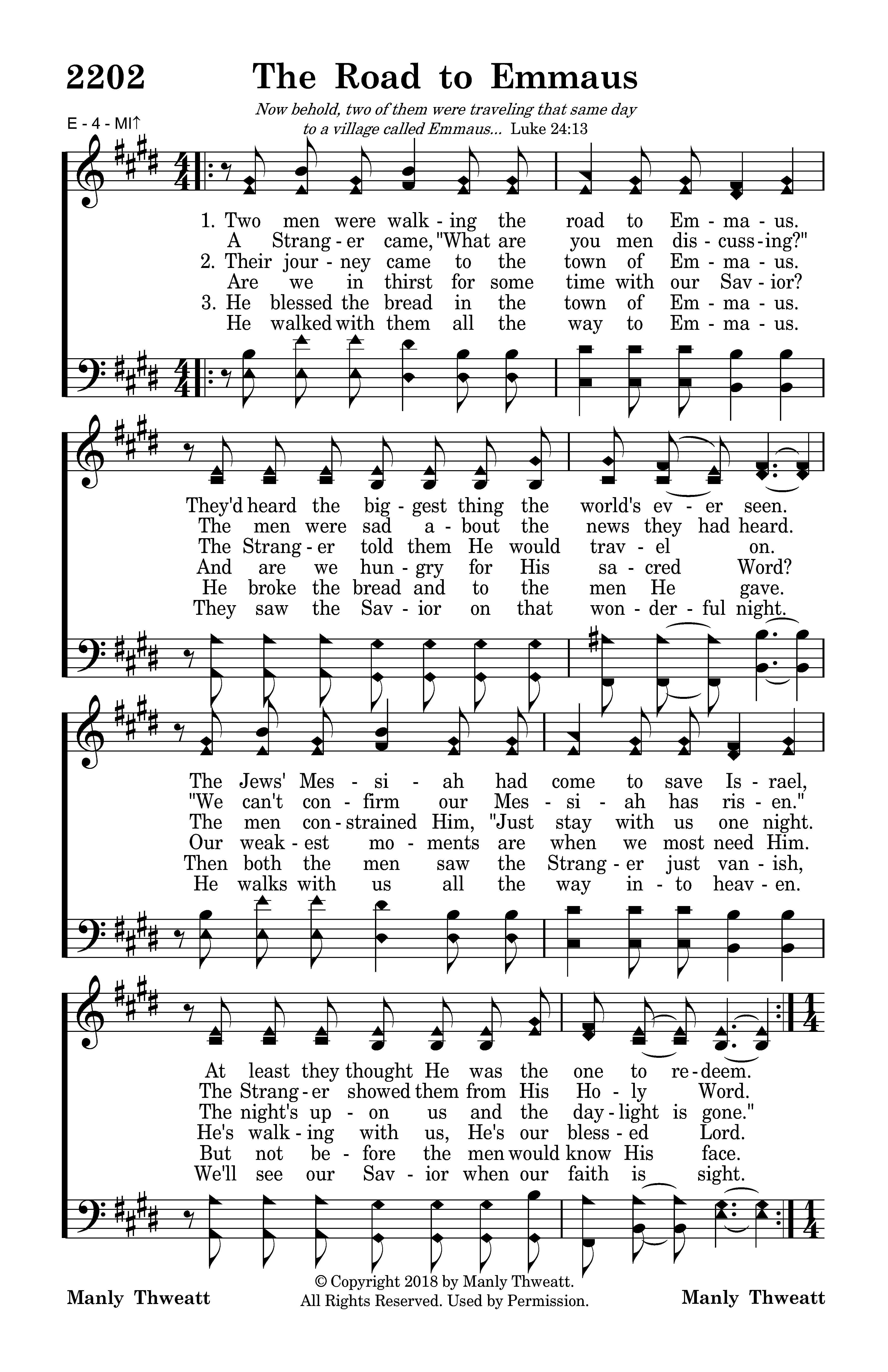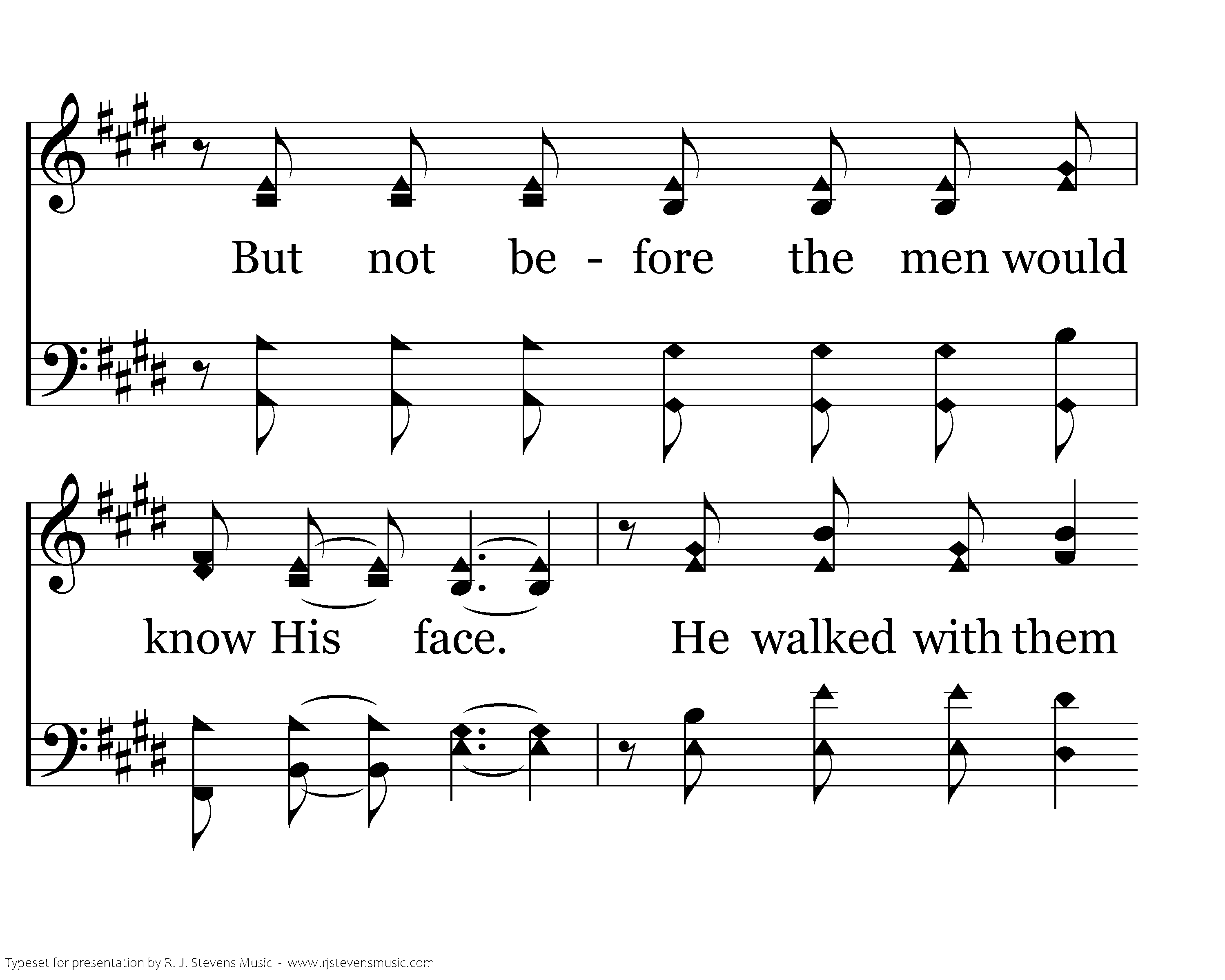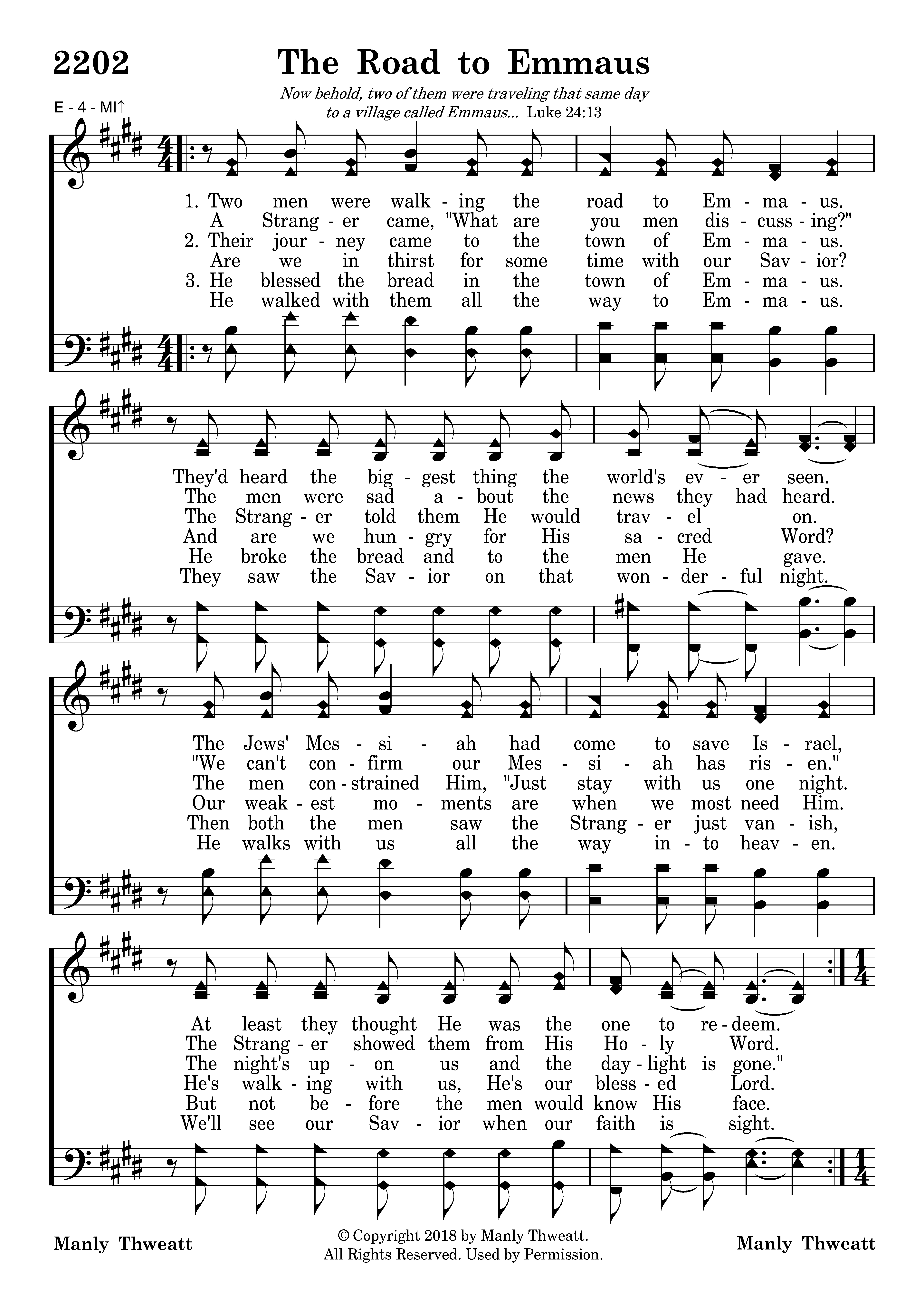 Two men were walking the road to Emmaus. They'd heard the biggest thing the world's ever seen. The Jews' Messiah had come to save Israel, At least they thought He was the one to redeem. A Stranger came, "What are you men discussing?" The men were sad about the news they had heard. "We can't confirm our Messiah has risen." The Stranger showed them from His Holy Word.
