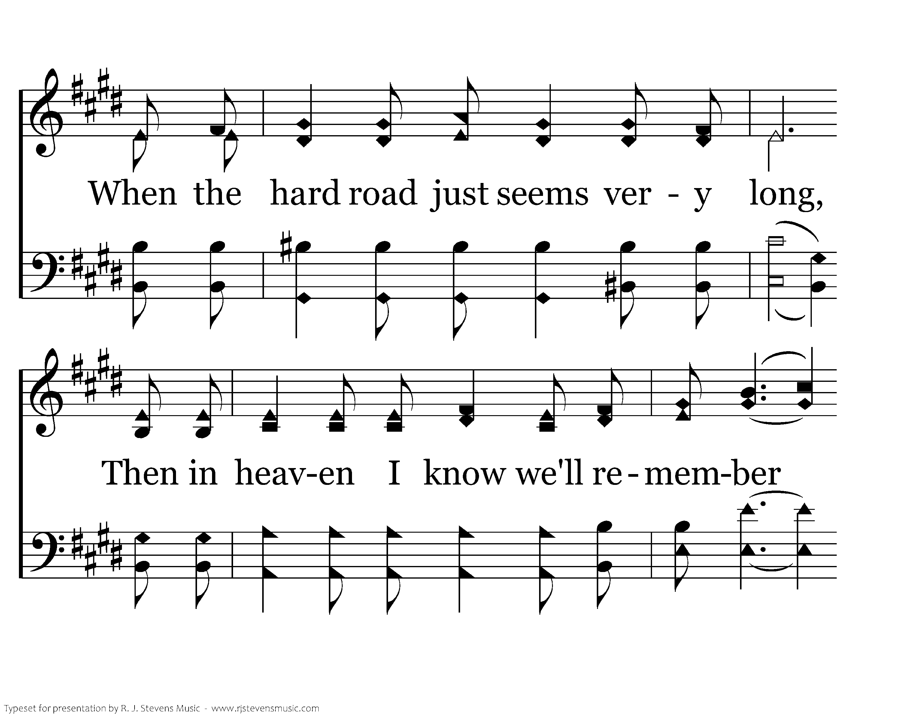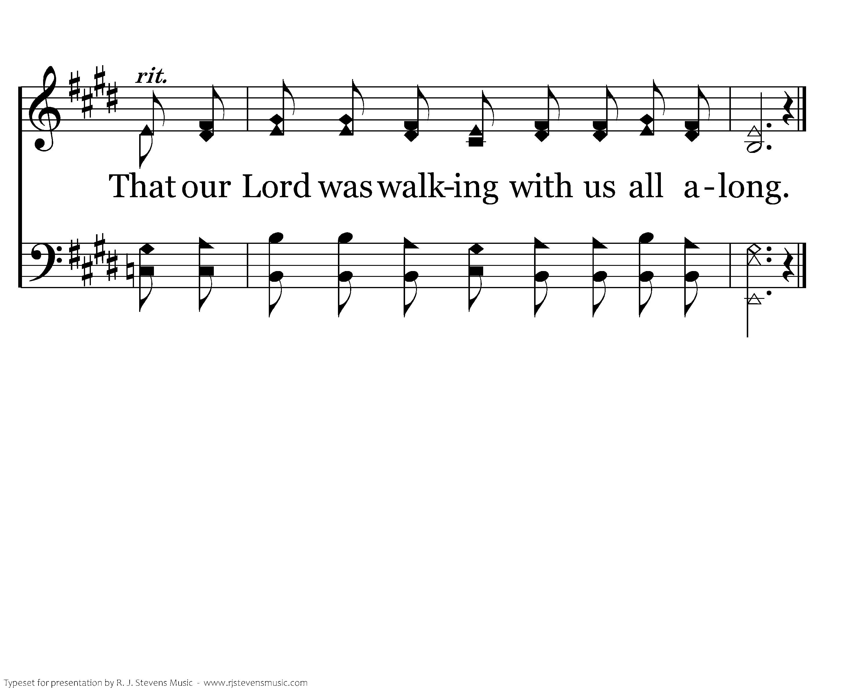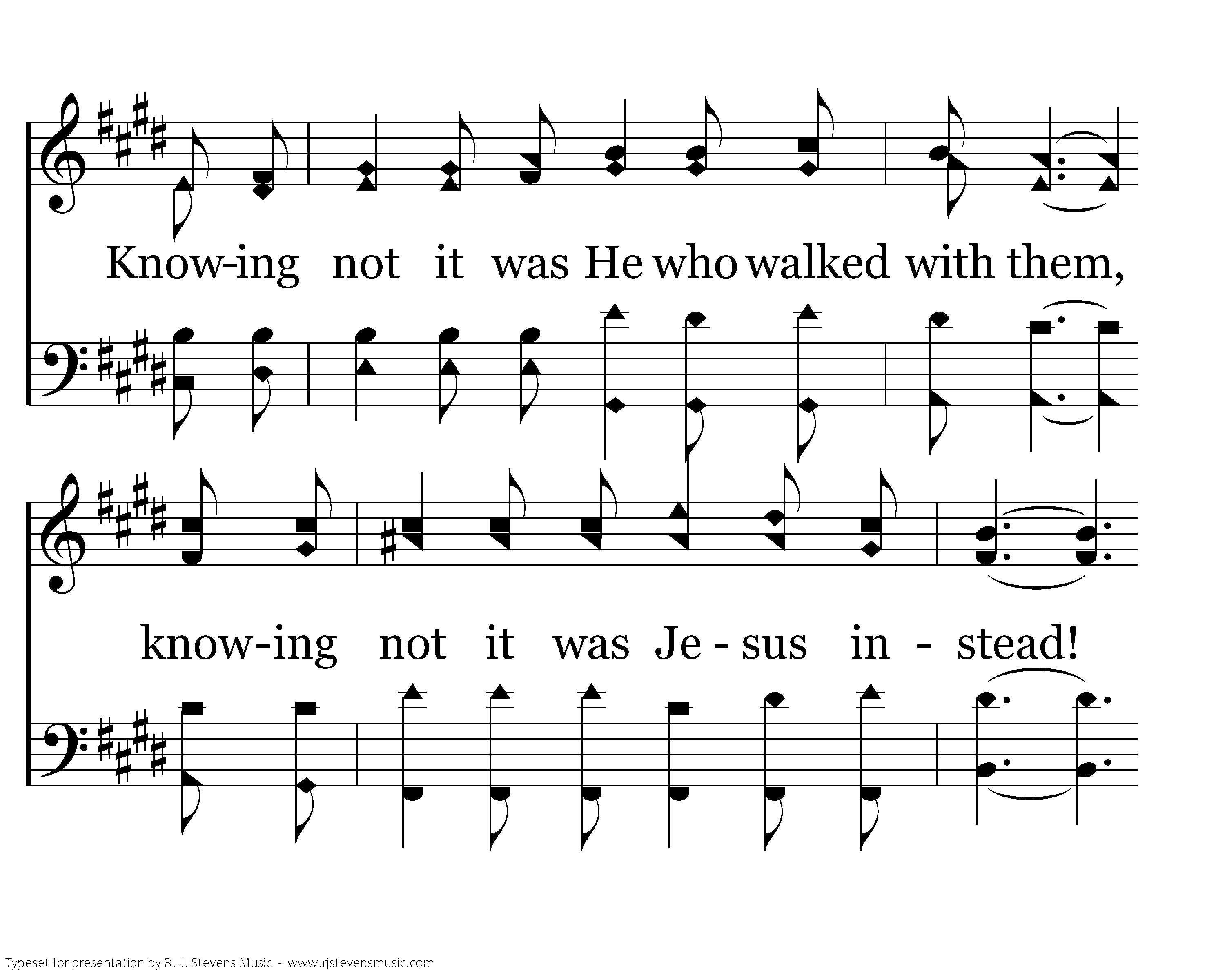 Like the men on the road to Emmaus, after Jesus arose from the dead, Knowing not it was He who walked with them, knowing not it was Jesus instead! So when darkness and doubt come upon us, When the hard road just seems very long, Then in heaven I know we'll remember That our Lord was walking with us all along.