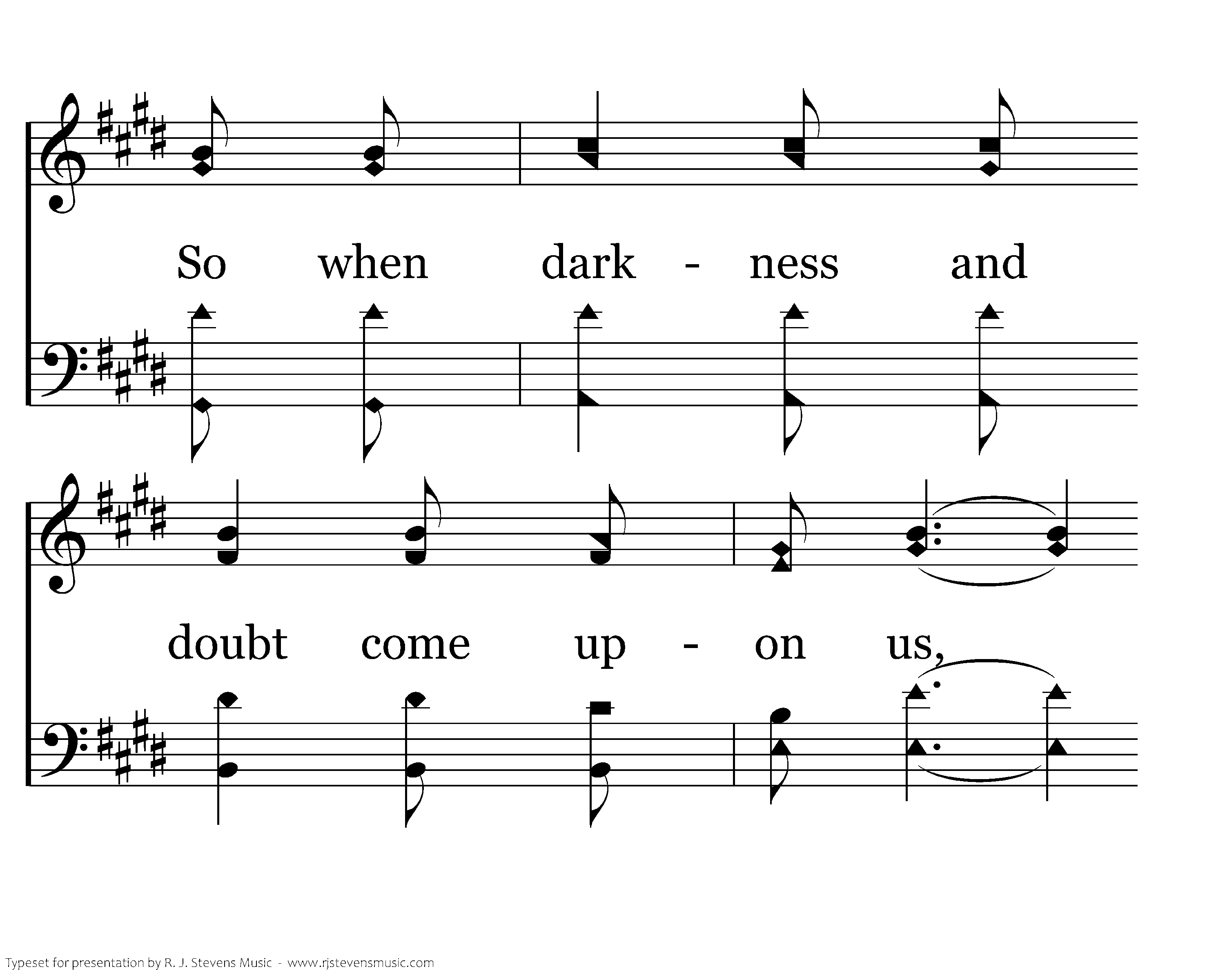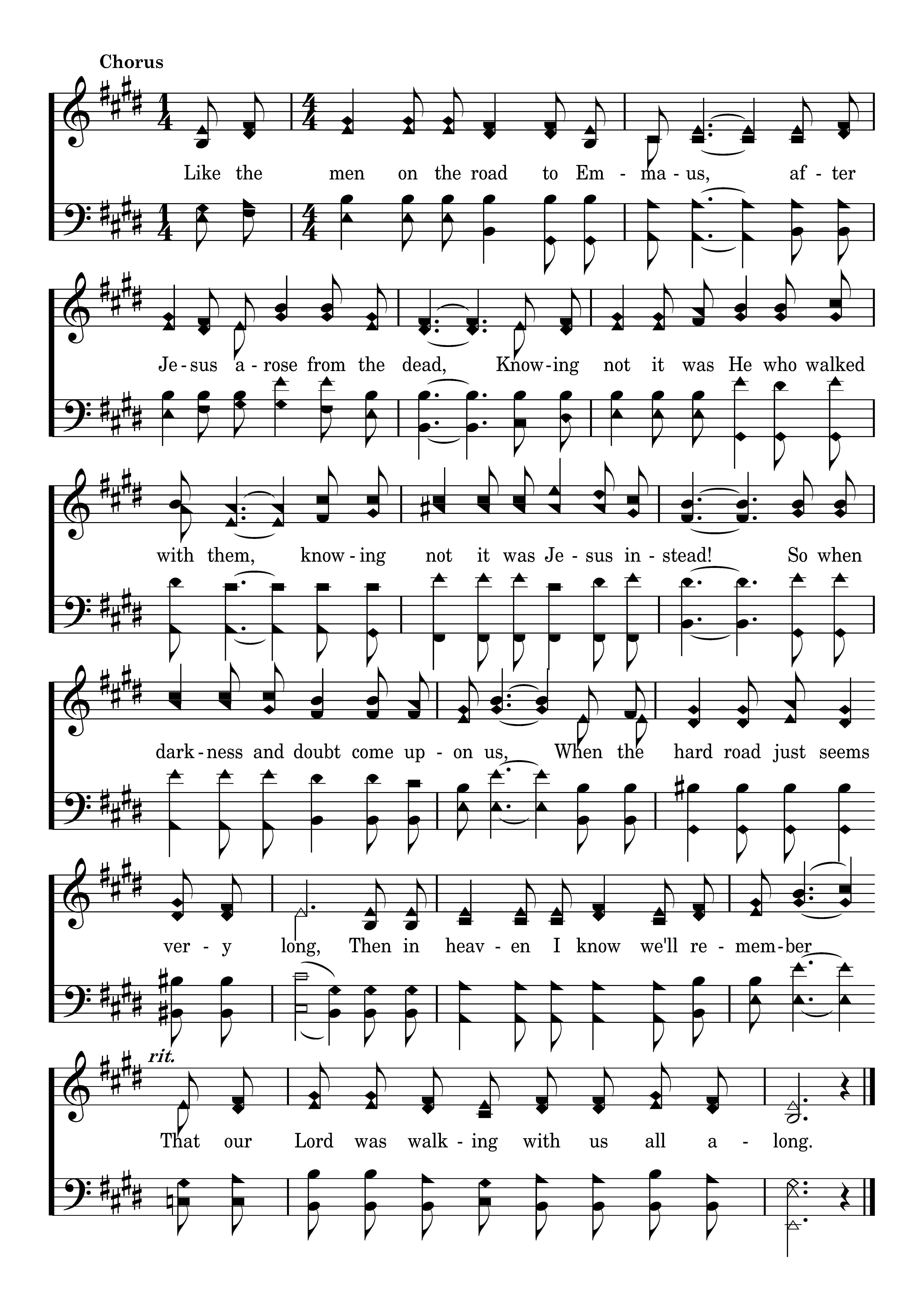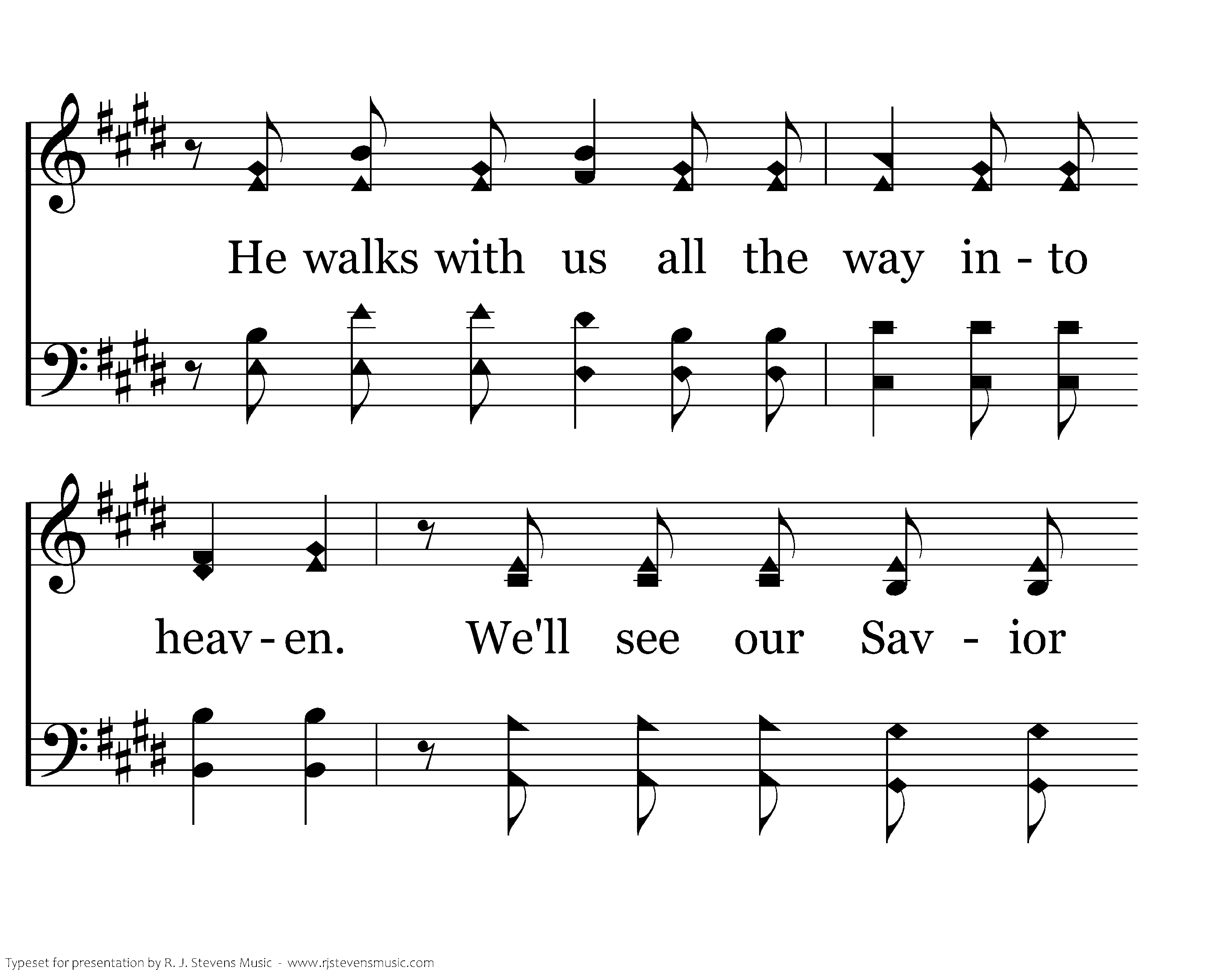 Like the men on the road to Emmaus, after Jesus arose from the dead, Knowing not it was He who walked with them, knowing not it was Jesus instead! So when darkness and doubt come upon us, When the hard road just seems very long, Then in heaven I know we'll remember That our Lord was walking with us all along.