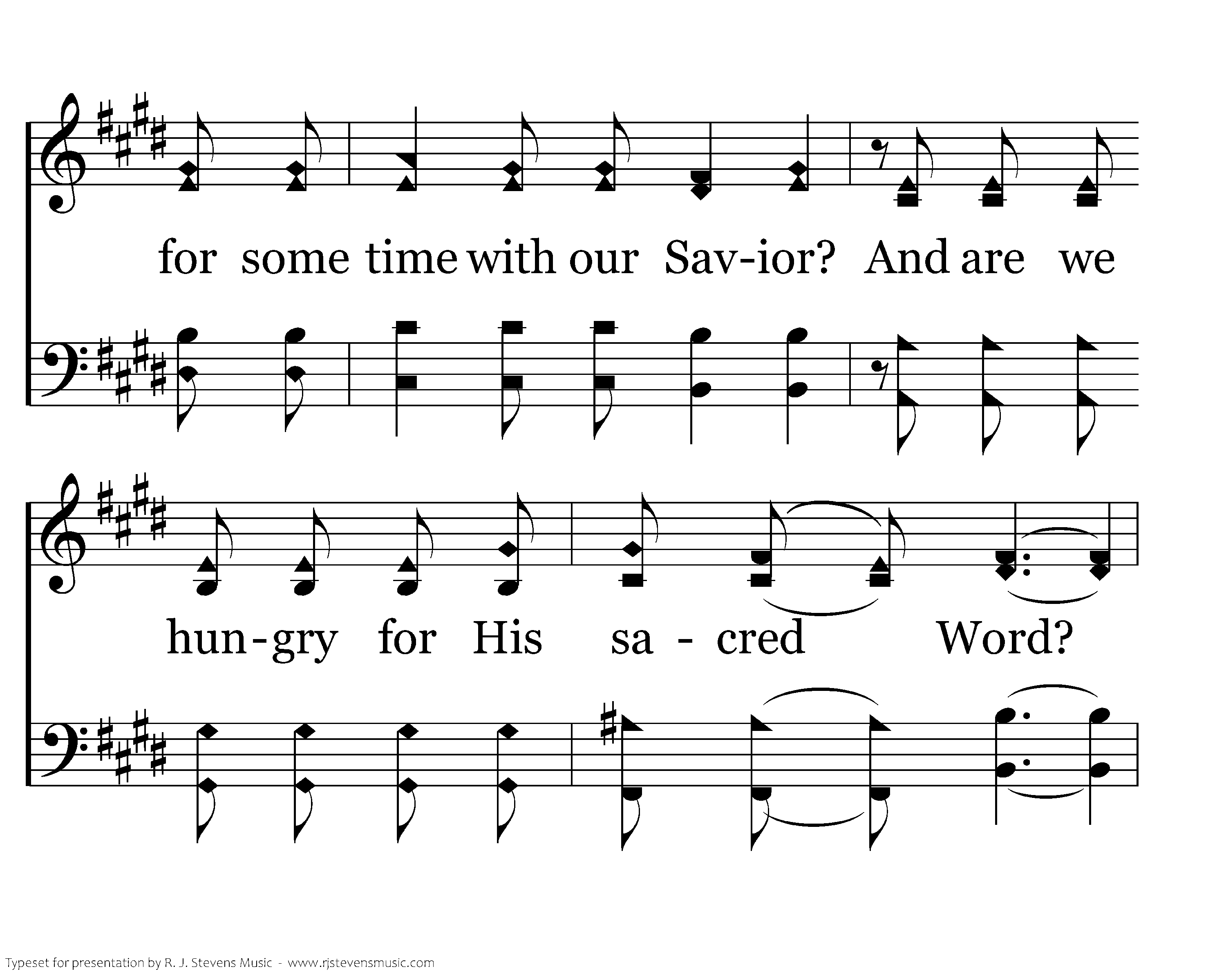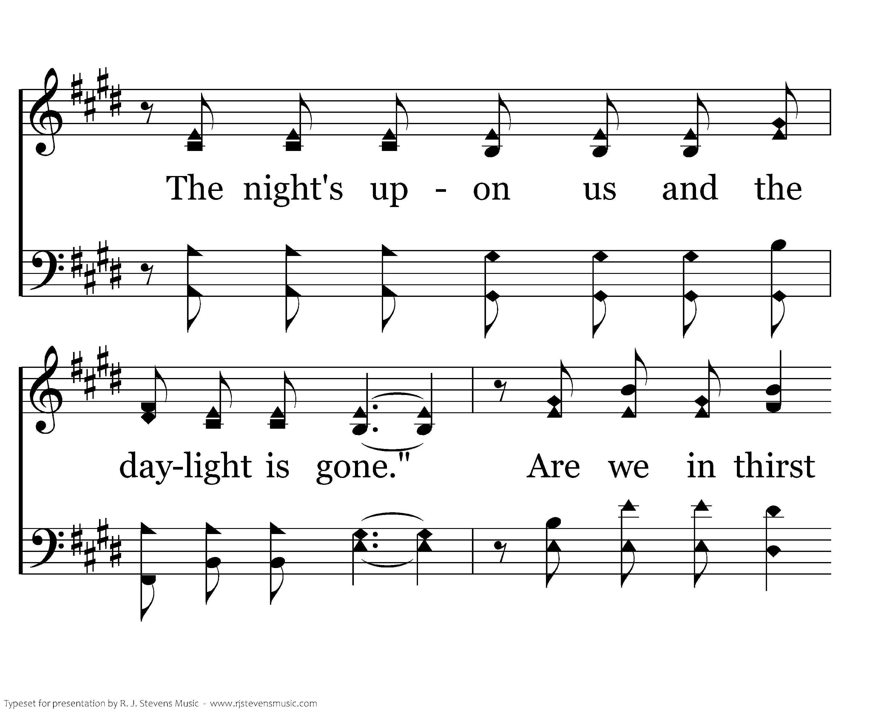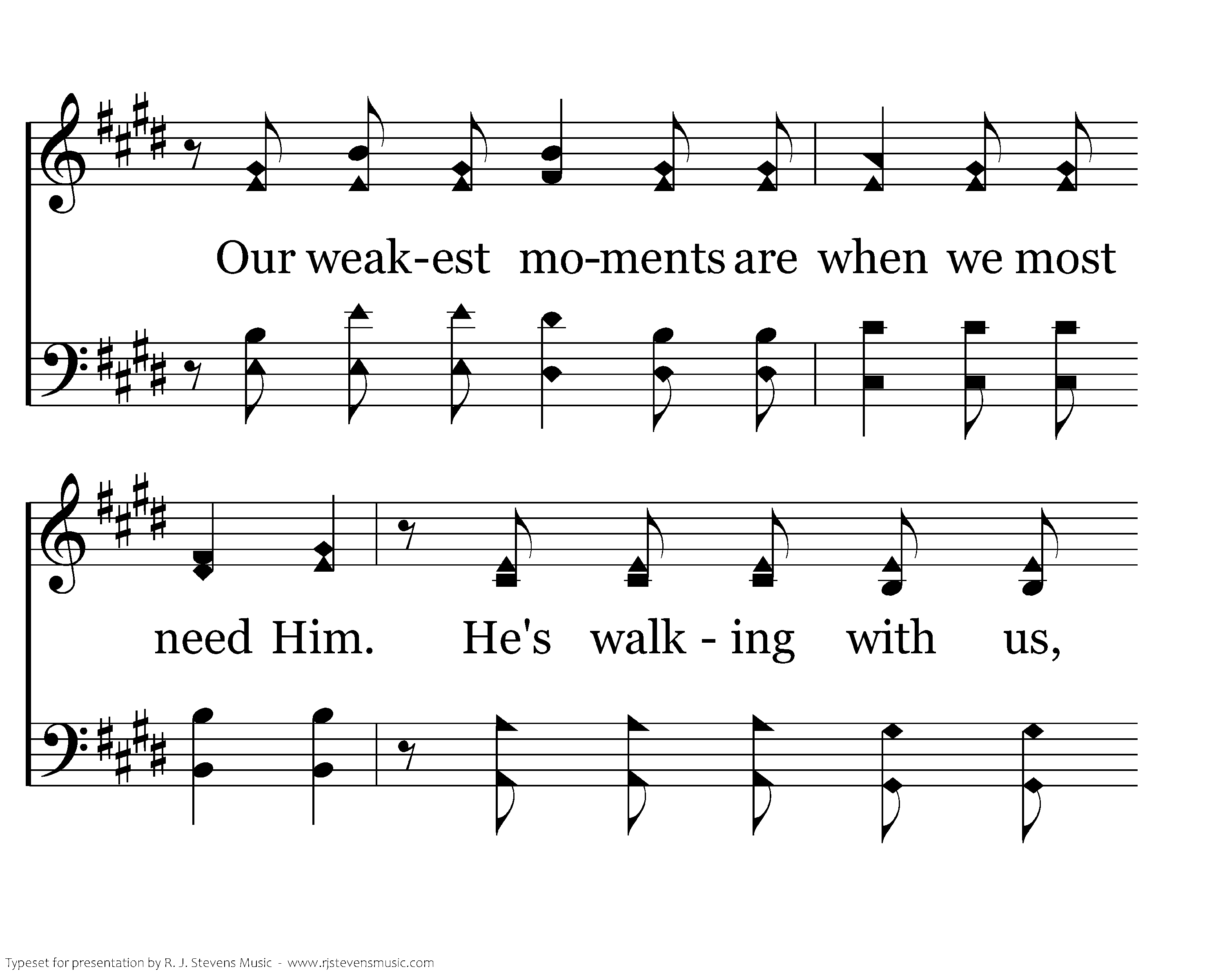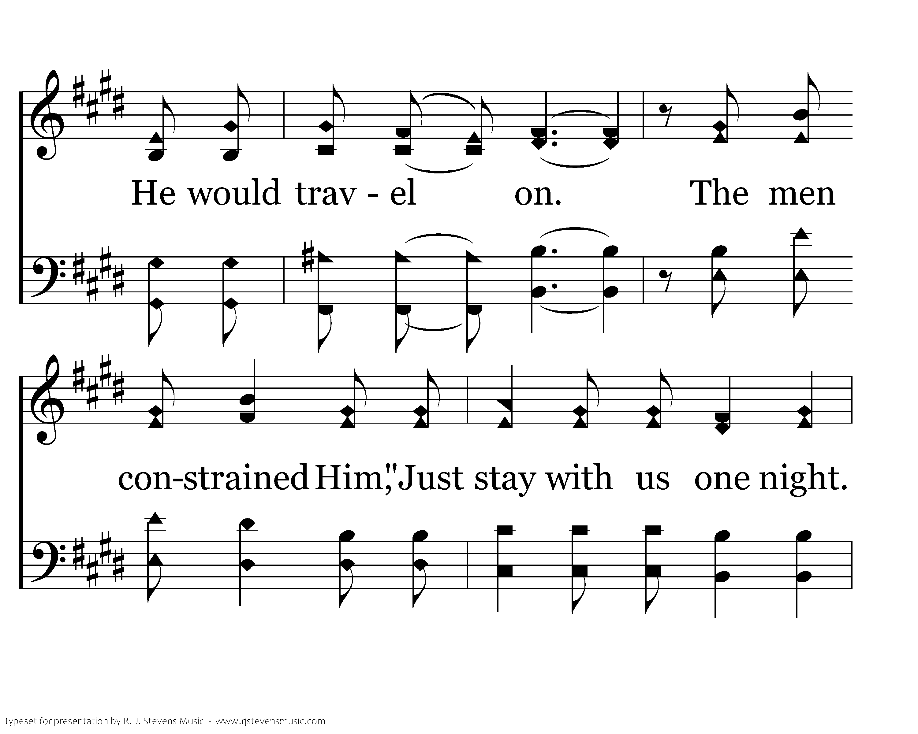 Their journey came to the town of Emmaus. The Stranger told them He would travel on. The men constrained Him, "Just stay with us one night. The night's upon us and the daylight is gone." Are we in thirst for some time with our Savior? And are we hungry for His sacred Word? Our weakest moments are when we most need Him. He's walking with us, He's our blessed Lord.