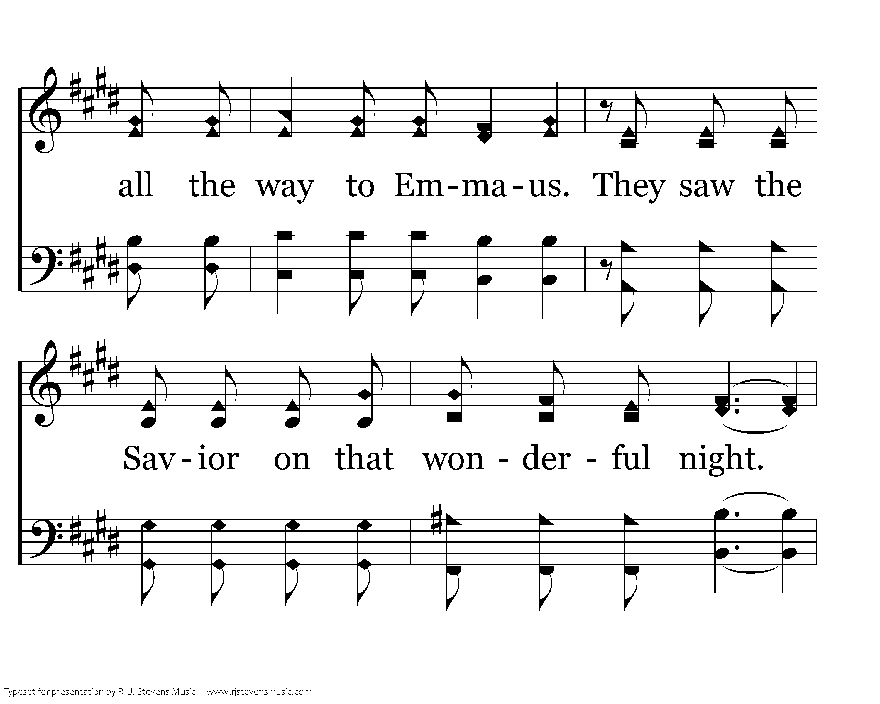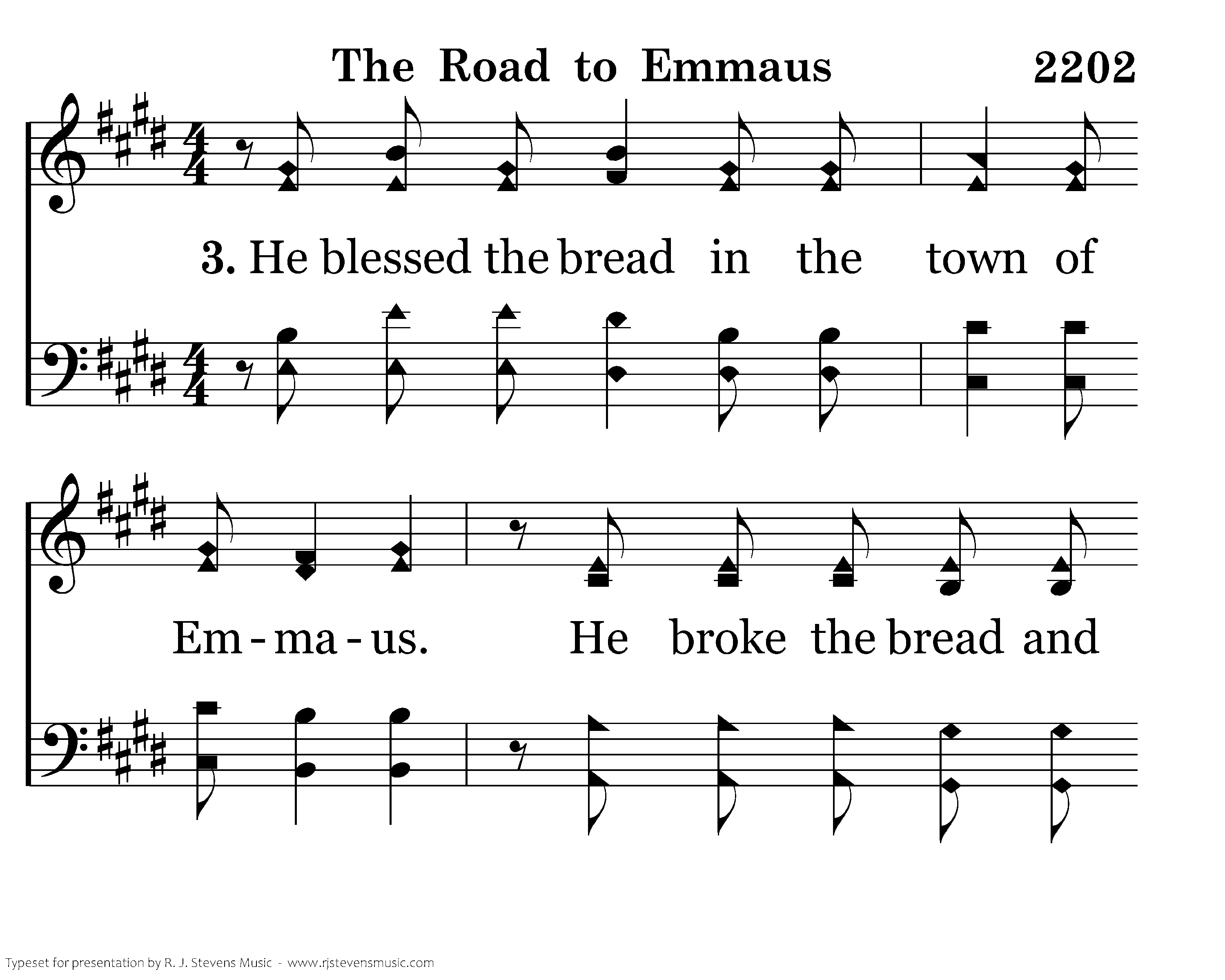 He blessed the bread in the town of Emmaus. He broke the bread and to the men He gave. Then both the men saw the Stranger just vanish, But not before the men would know His face. He walked with them all the way to Emmaus. They saw the Savior on that wonderful night. He walks with us all the way into heaven. We'll see our Savior when our faith is sight.