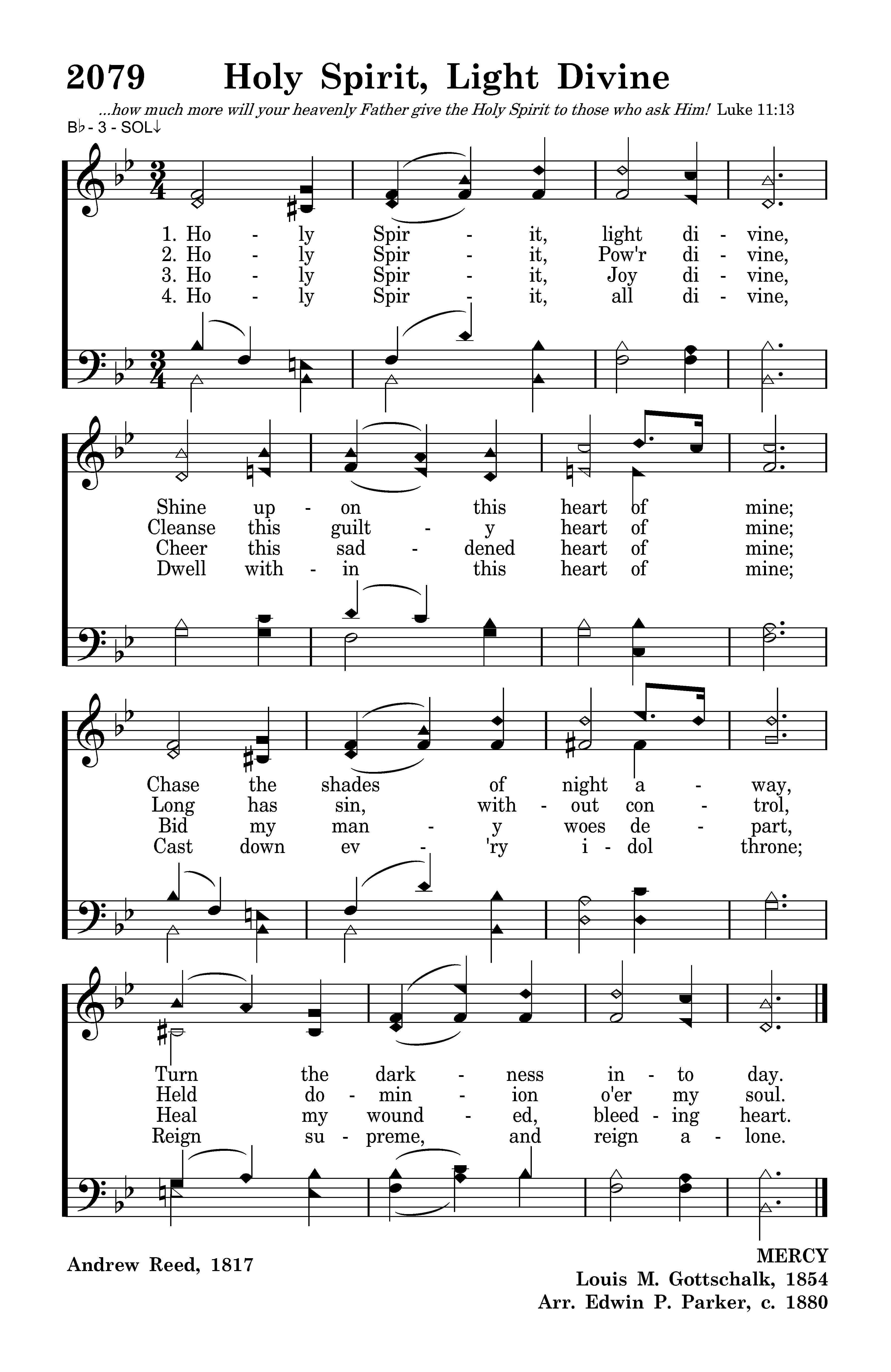 Holy Spirit, light divine, Shine upon this heart of mine; Chase the shades of night away, Turn the darkness into day.