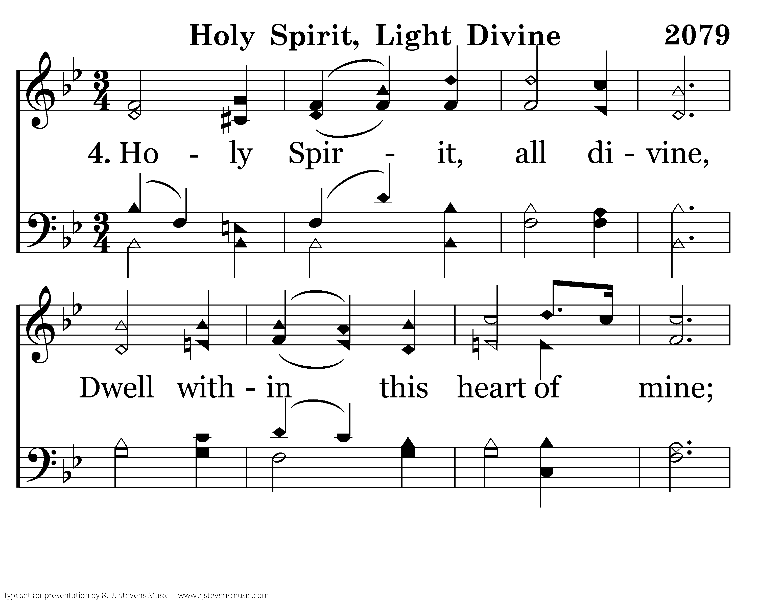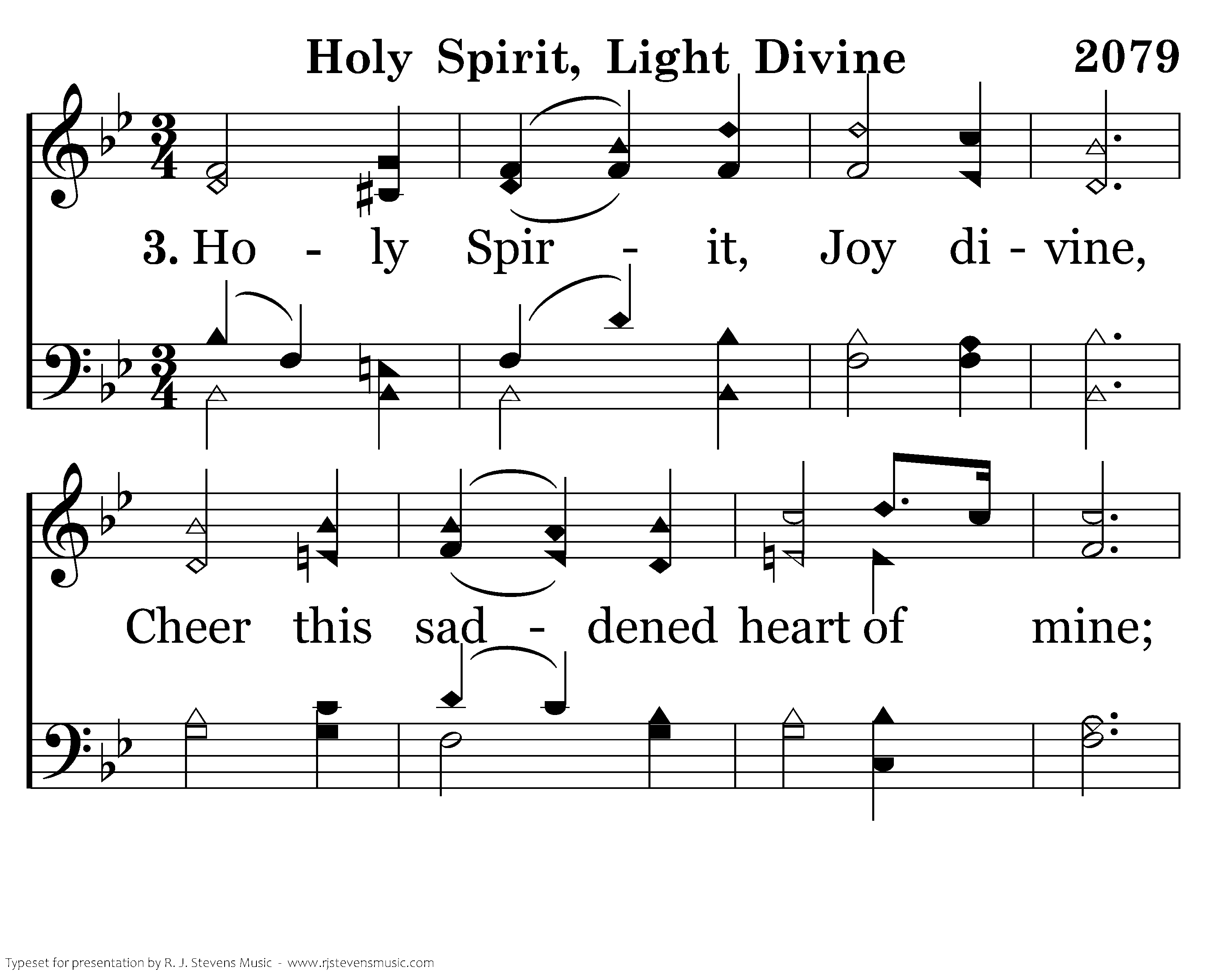 Holy Spirit, Joy divine, Cheer this saddened heart of mine; Bid my many woes depart, Heal my wounded, bleeding heart.