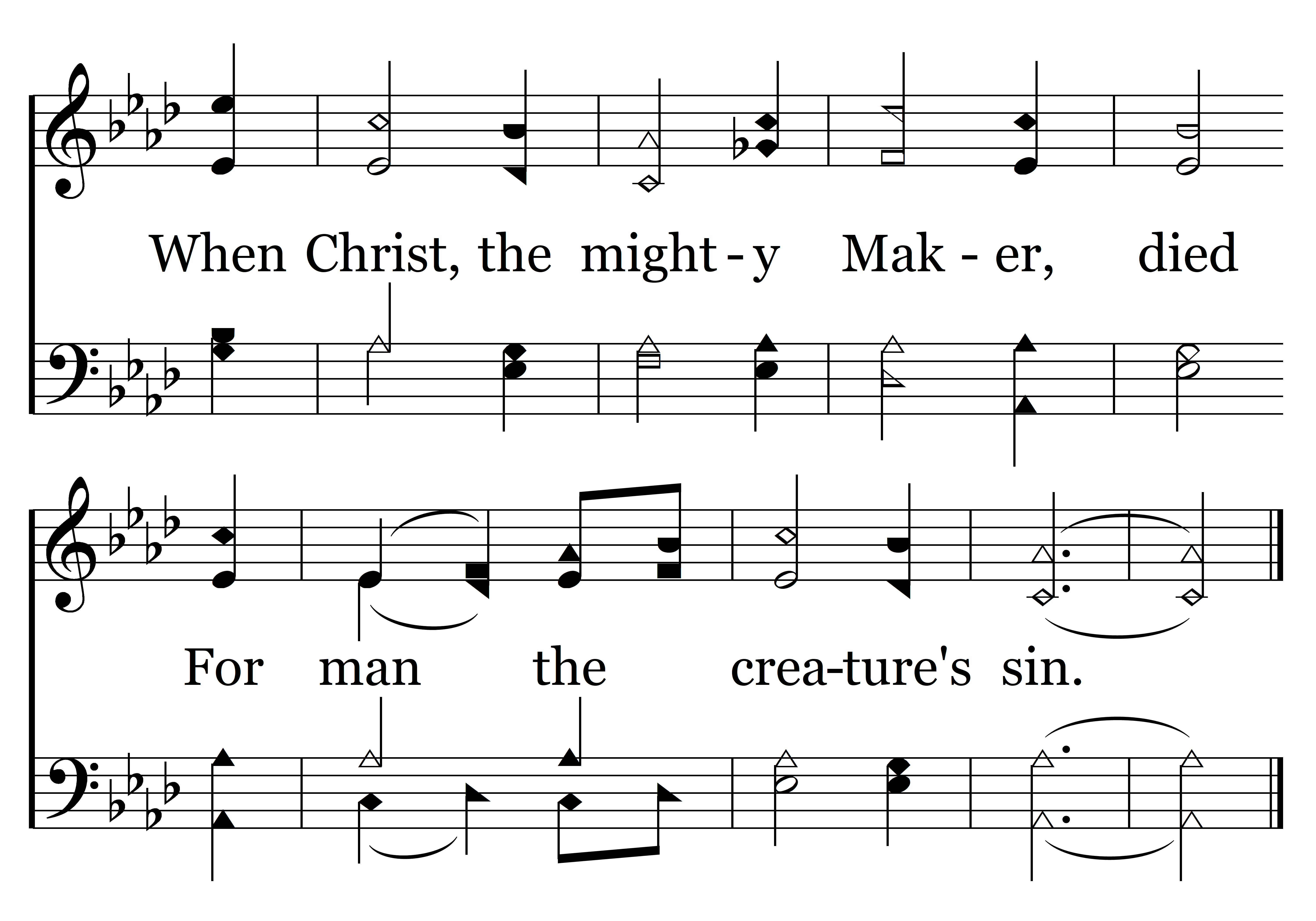 Well might the sun in darkness hide, And shut His glories in, When Christ, the mighty Maker, died For man the creature's sin.