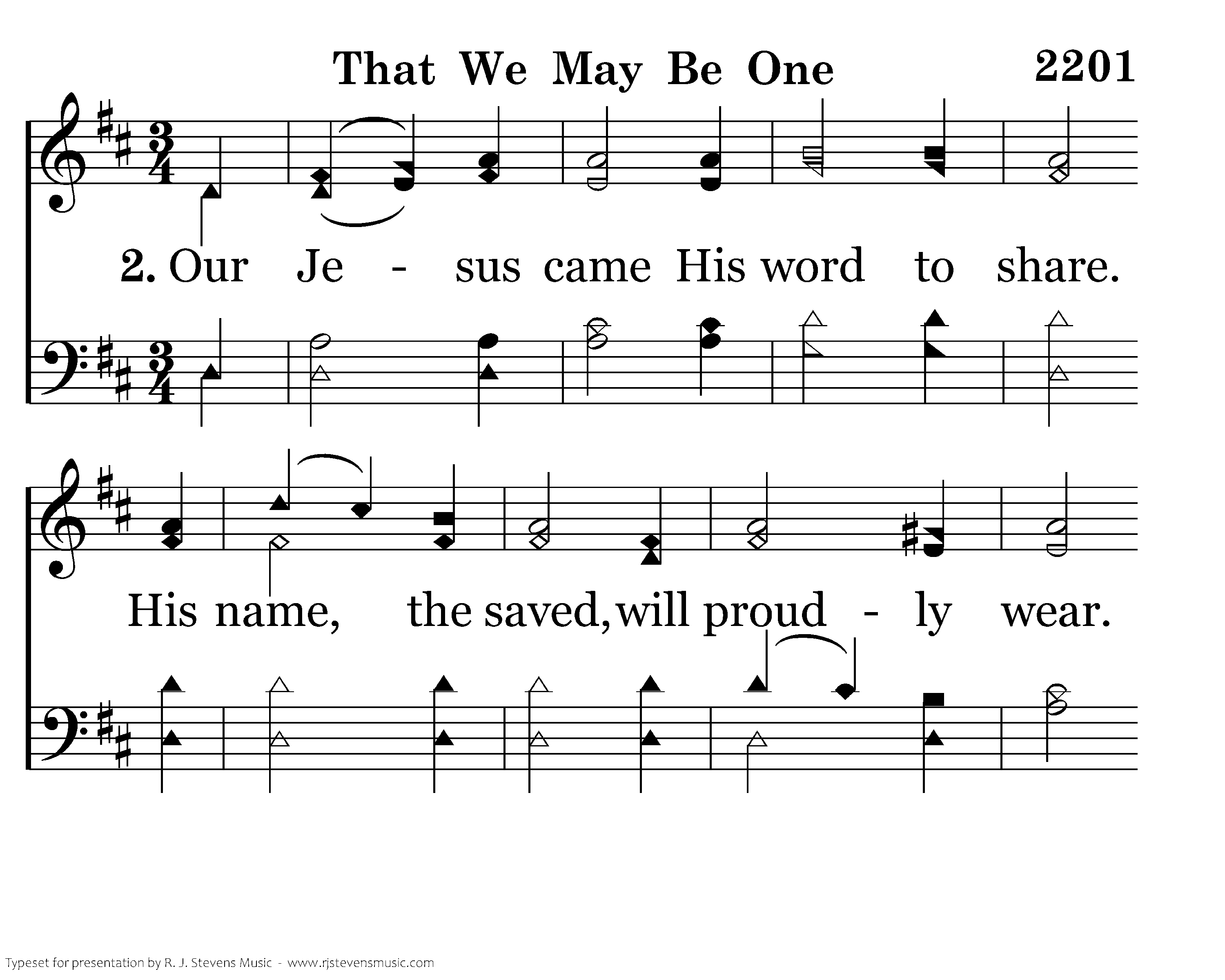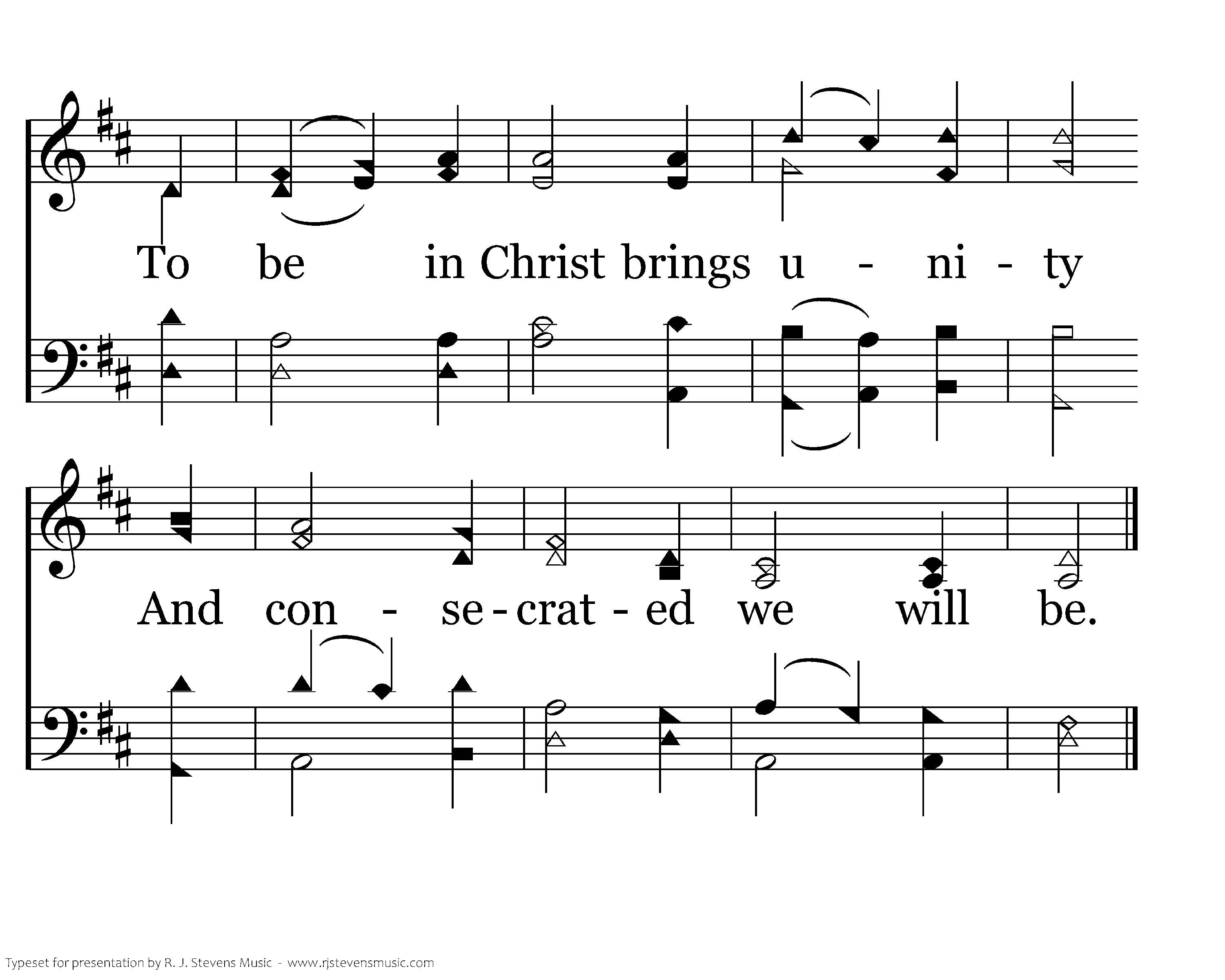 Our Jesus came His word to share. His name, the saved, will proudly wear. To be in Christ brings unity And consecrated we will be.