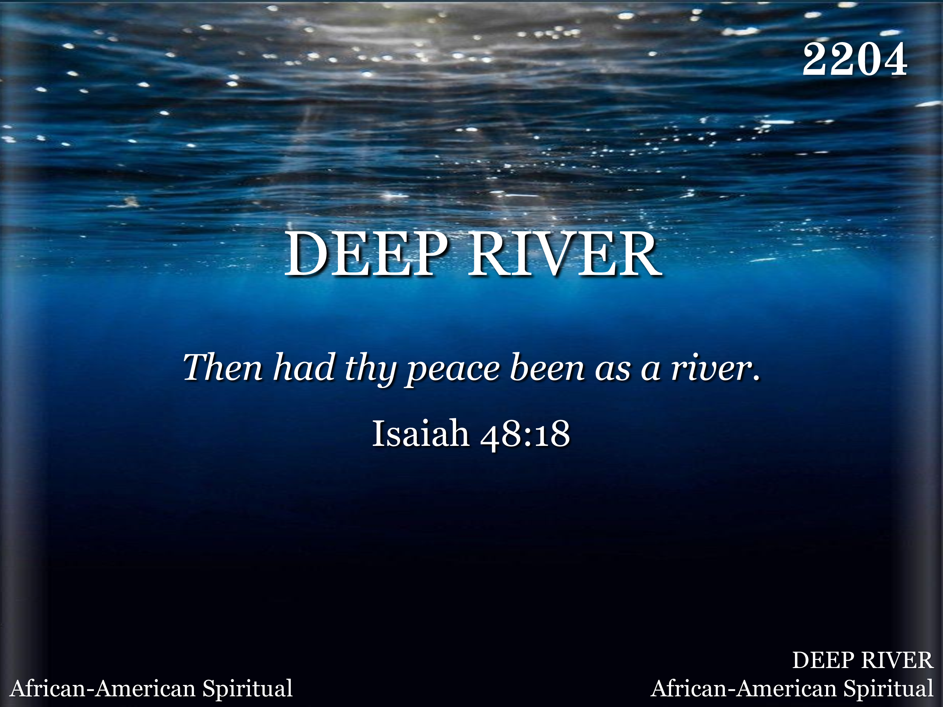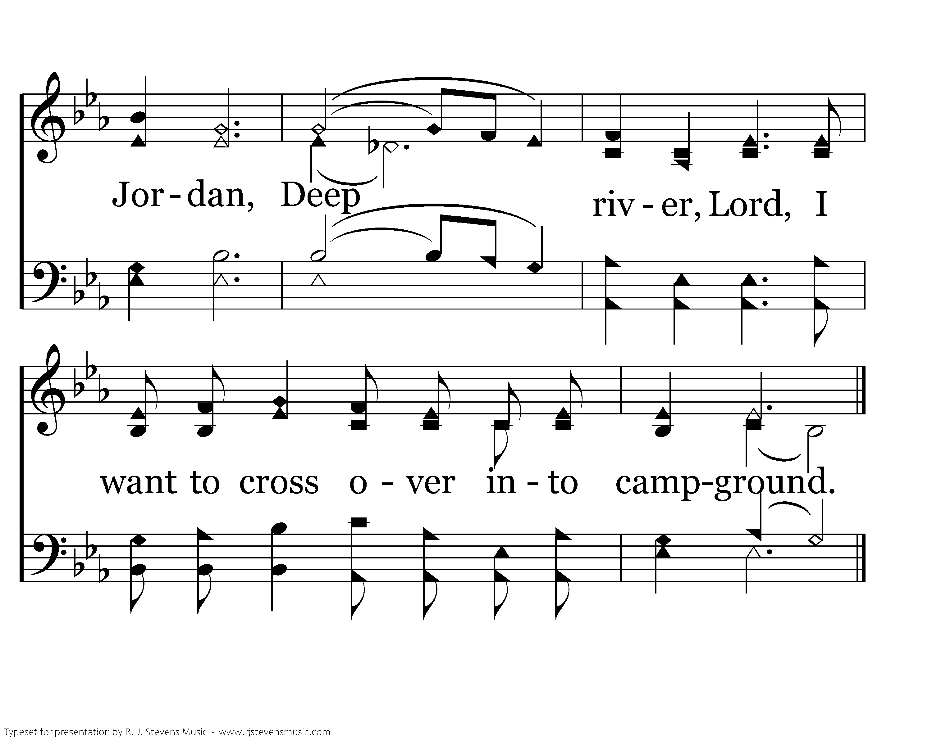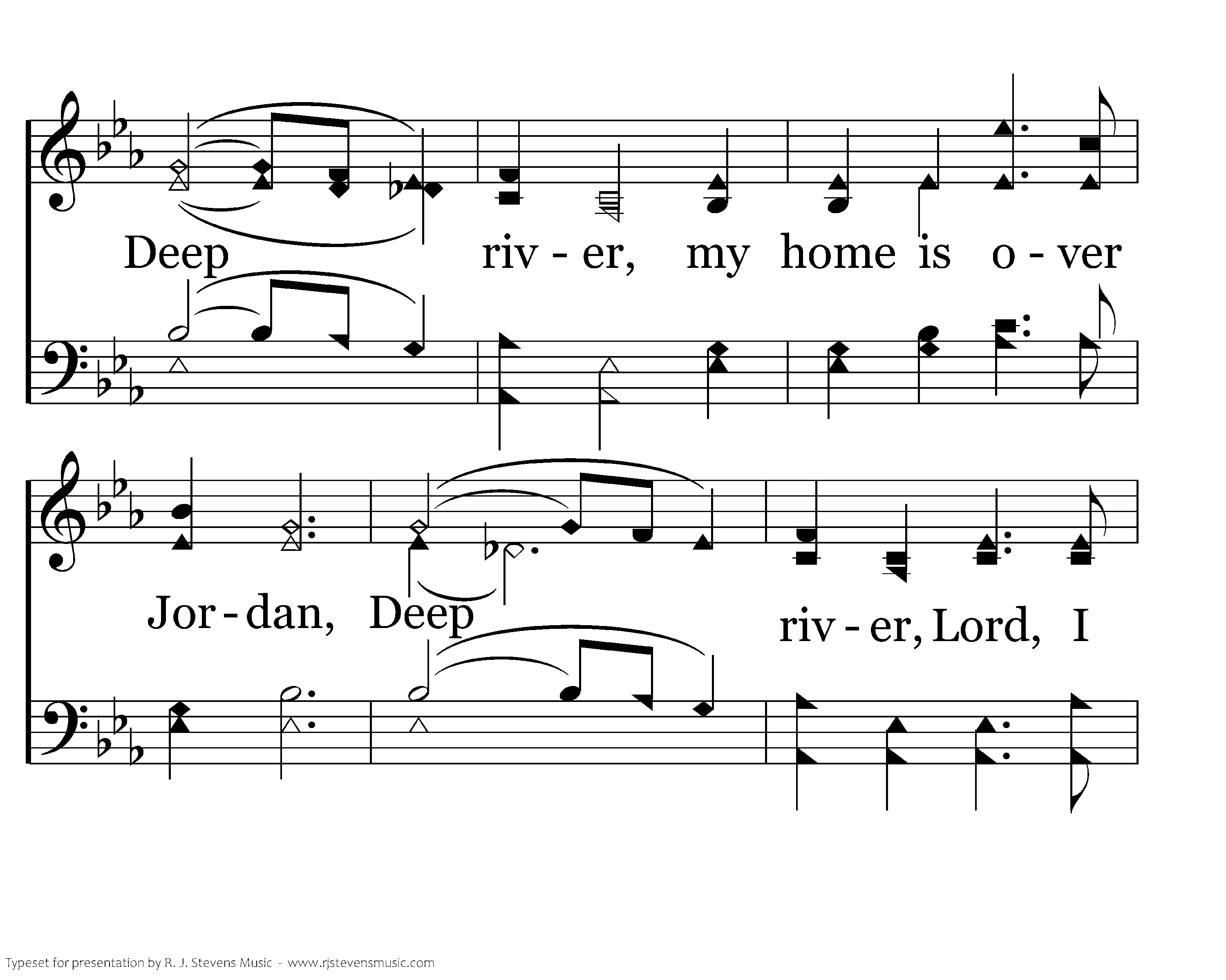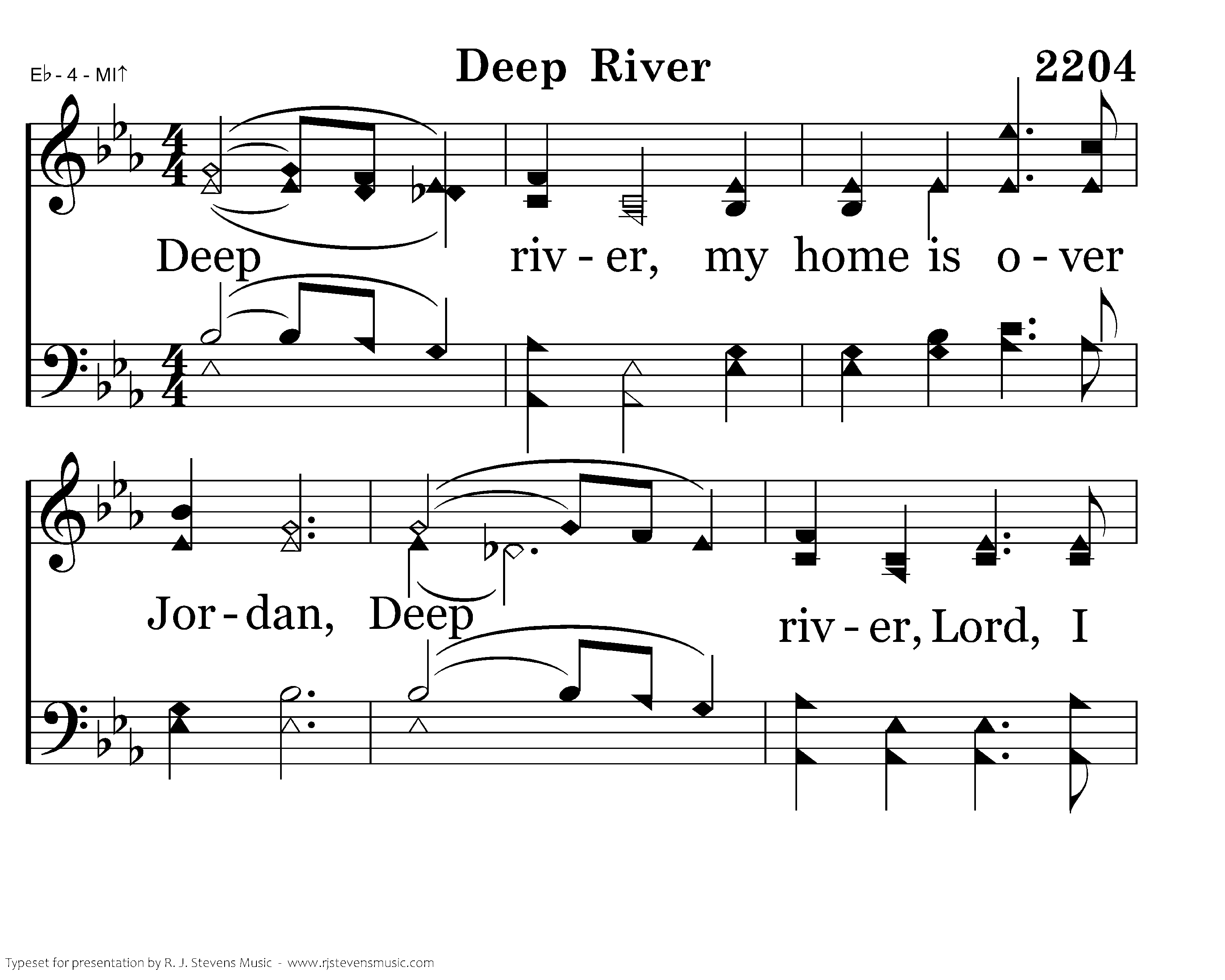 Deep river, my home is over Jordan, Deep river, Lord, I want to cross over into campground. I want to go to heaven for to walk that golden street, I want to kneel at Jesus’ feet; Deep river, my home is over Jordan, Deep river, Lord, I want to cross over into campground.
