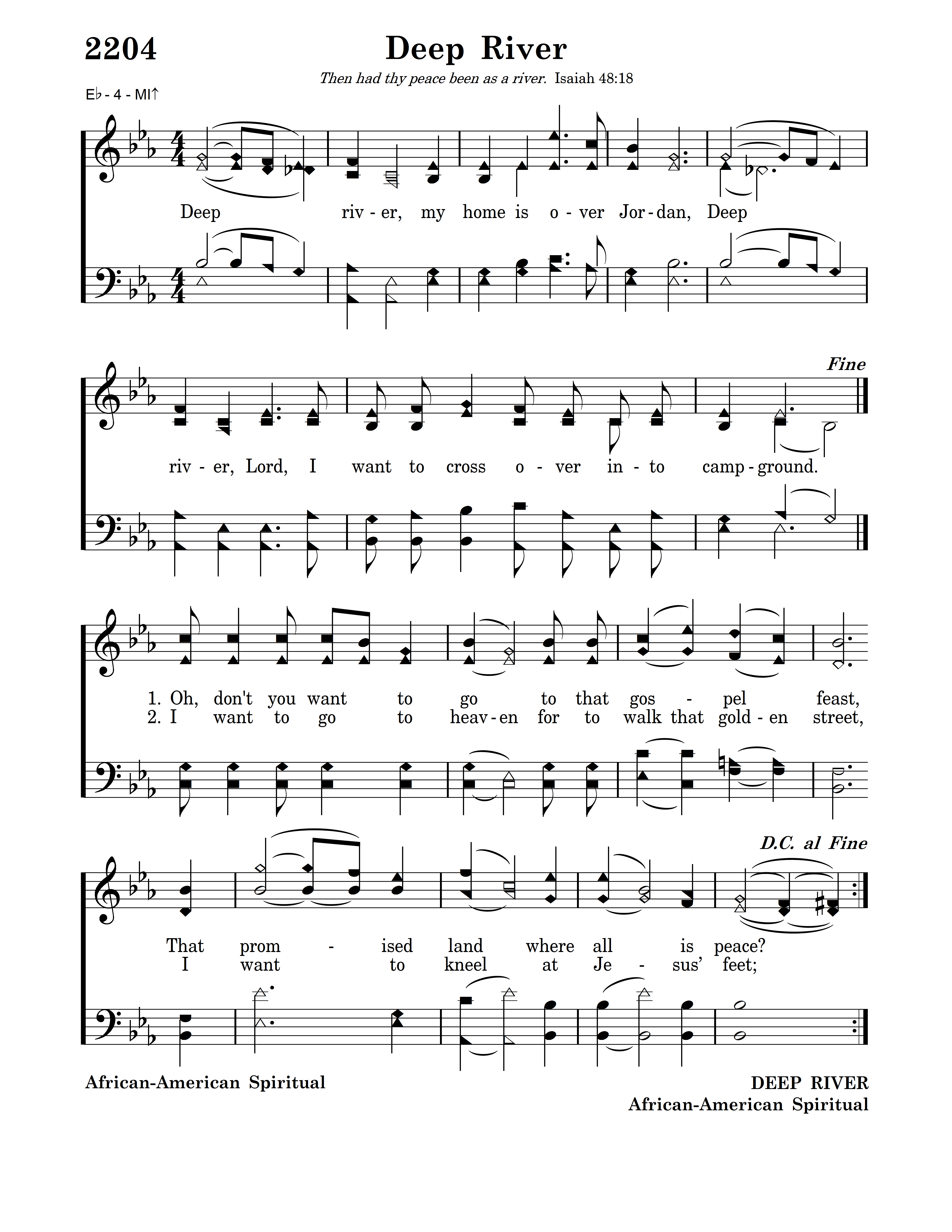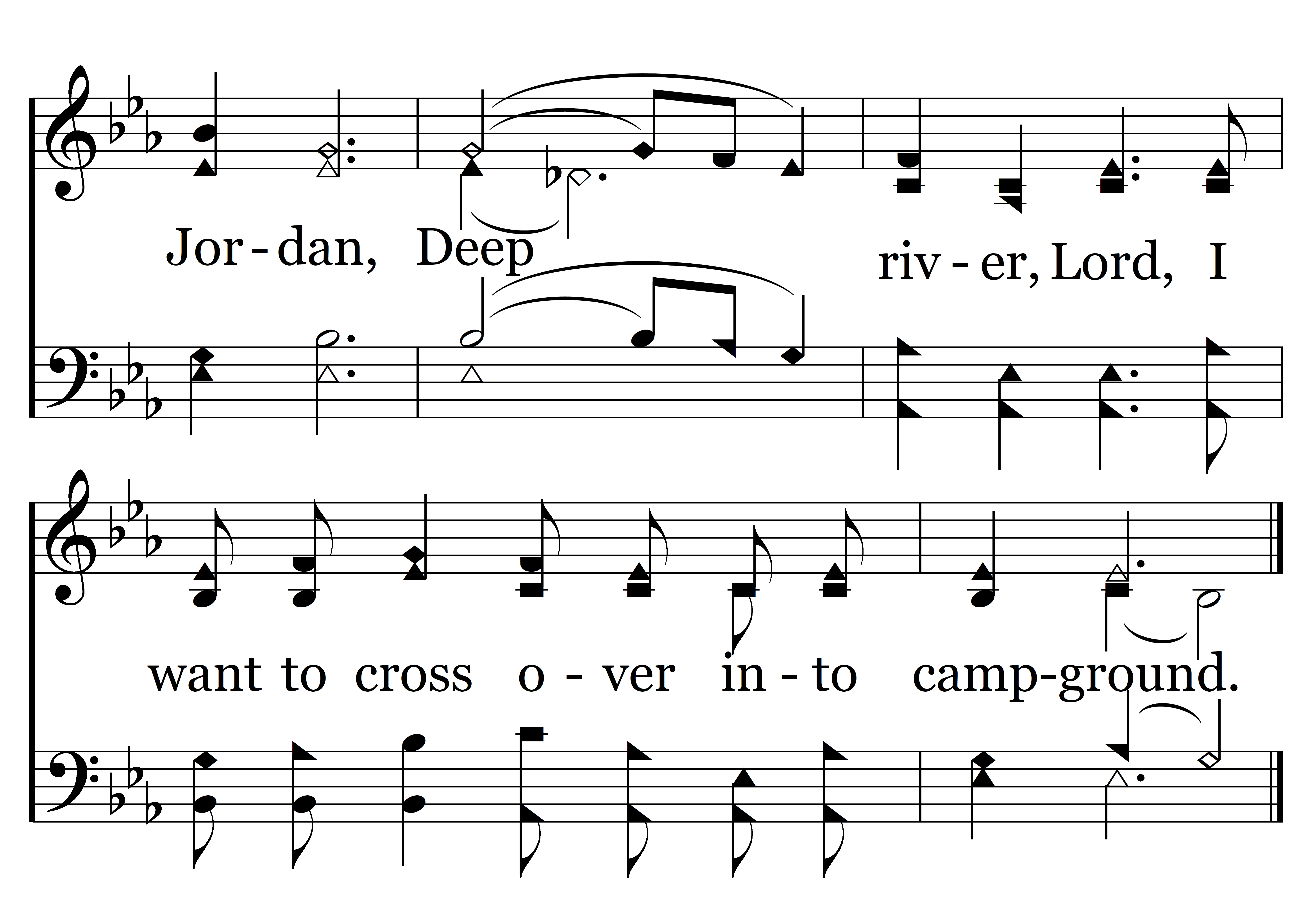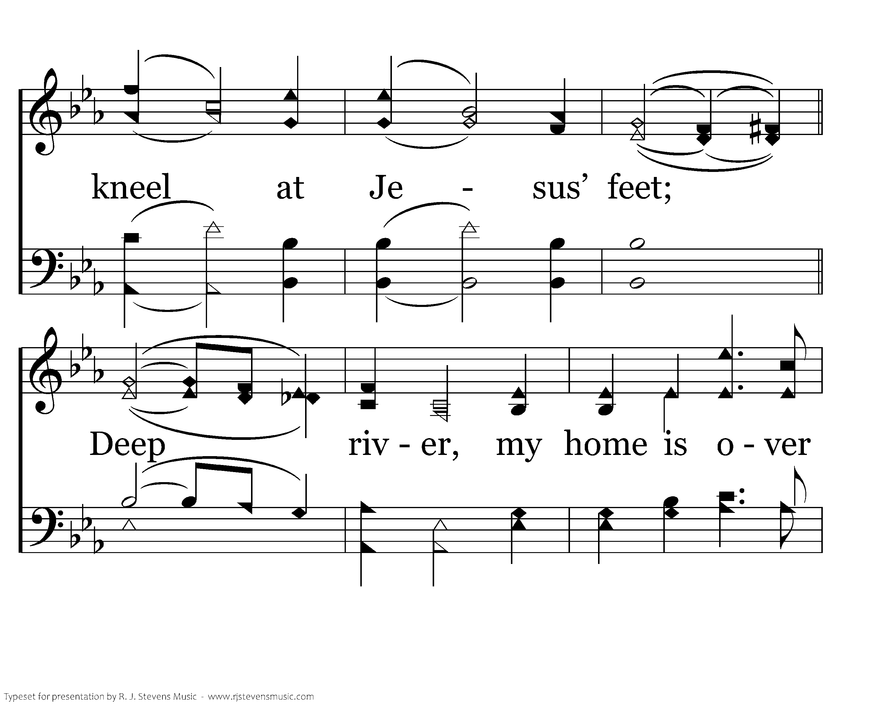 Deep river, my home is over Jordan, Deep river, Lord, I want to cross over into campground. I want to go to heaven for to walk that golden street, I want to kneel at Jesus’ feet; Deep river, my home is over Jordan, Deep river, Lord, I want to cross over into campground.